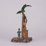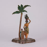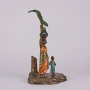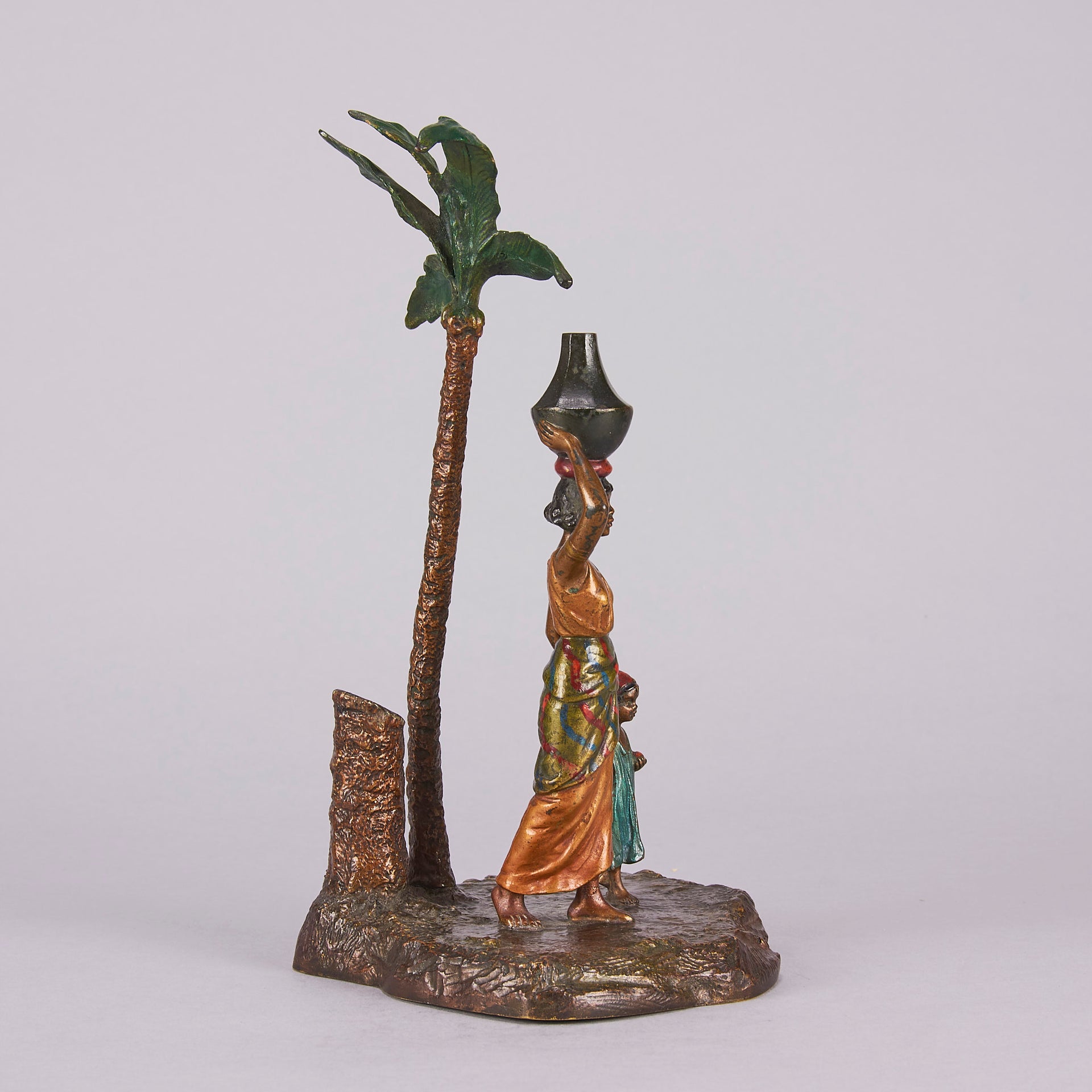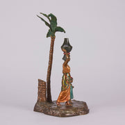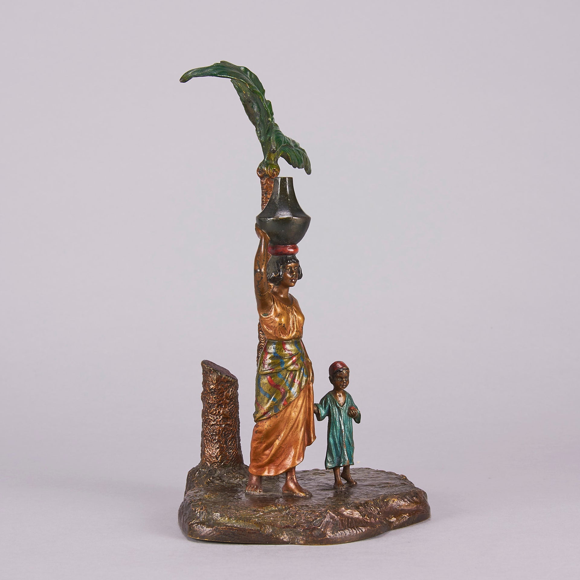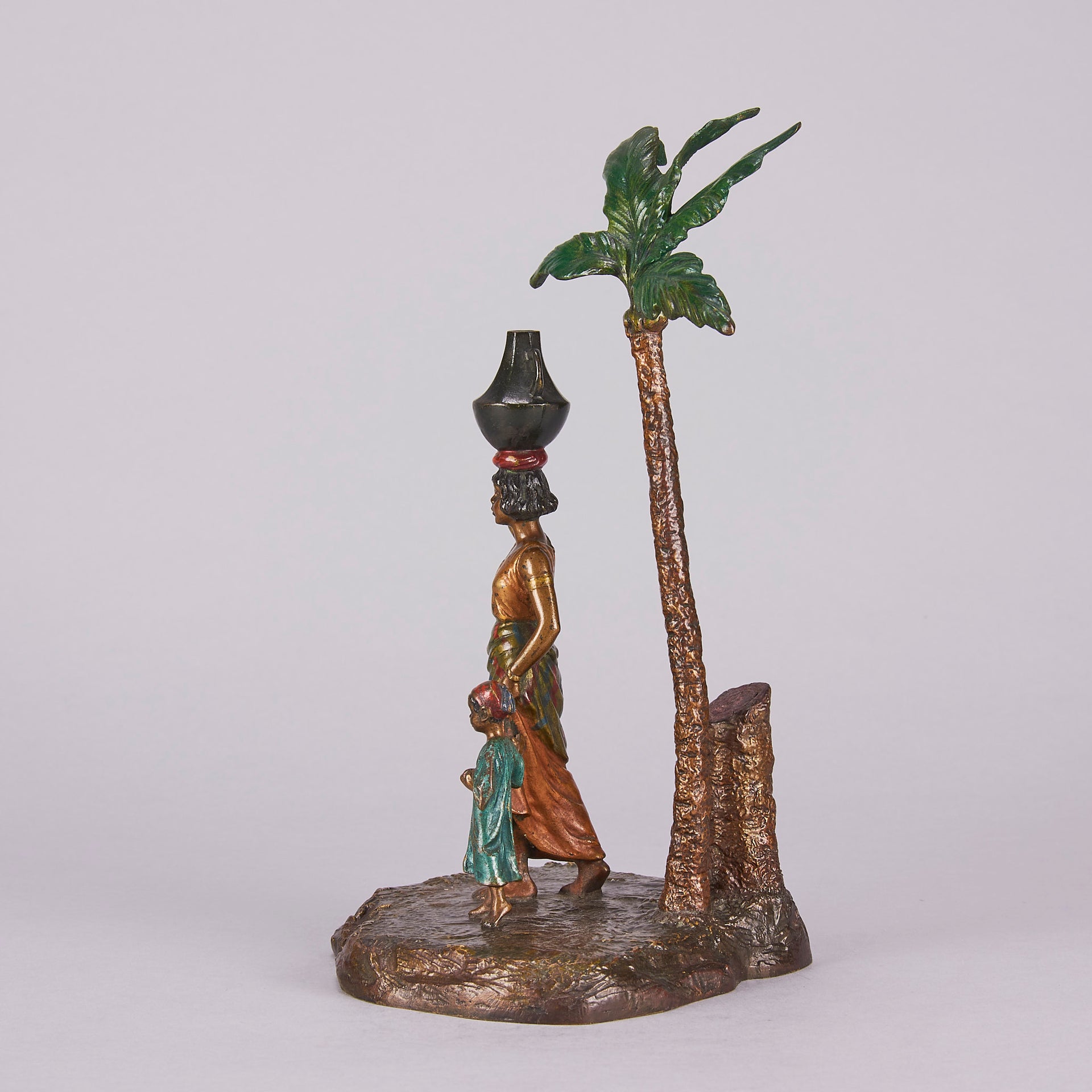 Very fine early 20th Century Austrian bronze study of a young mother carrying a water filled urn with her child by her side, walking beside a palm tree. The surface of the bronze with good cold painted colours and fine hand finished surface detail, signed with the Bergman 'B' in an amphora, stamped Geschutzt and numbered 6911