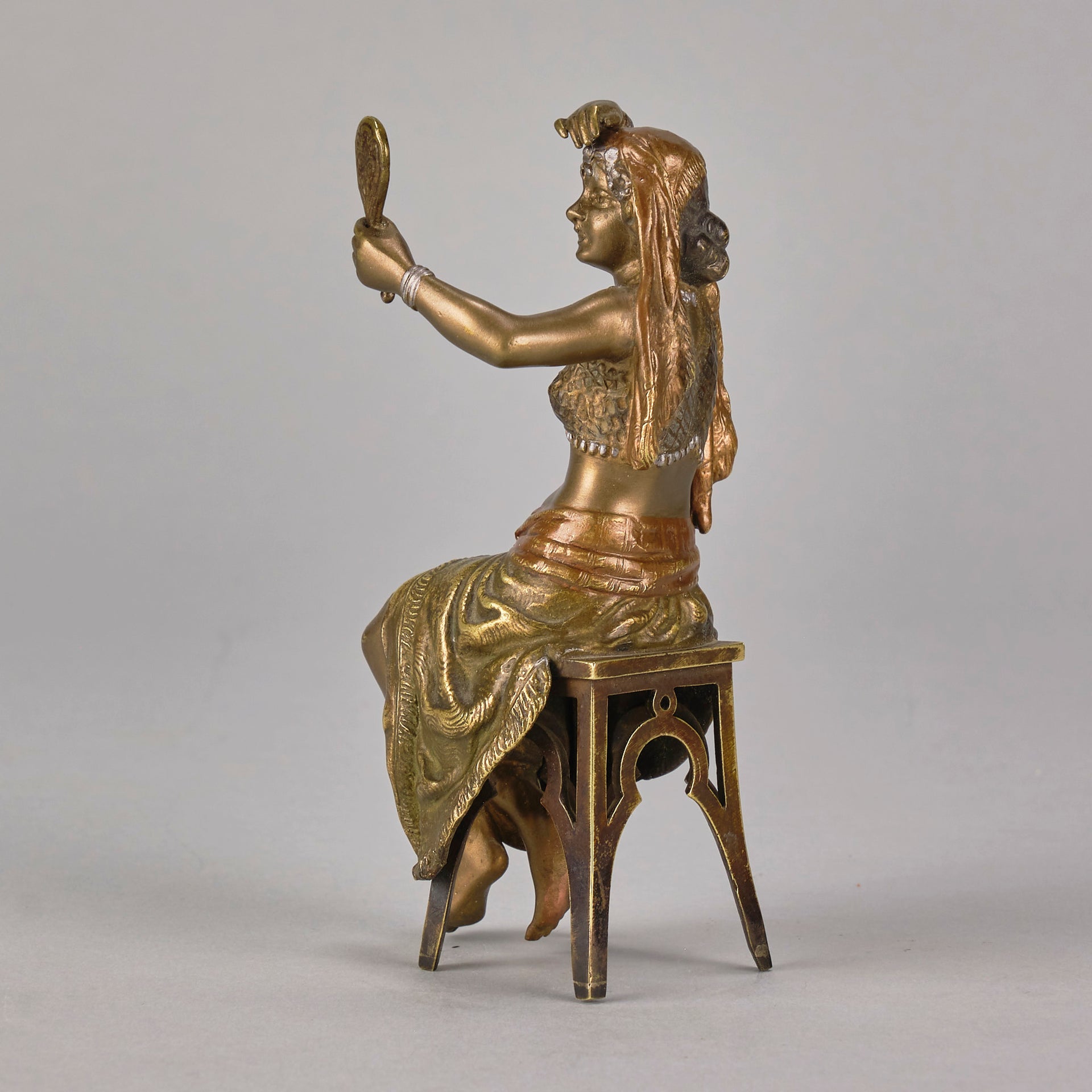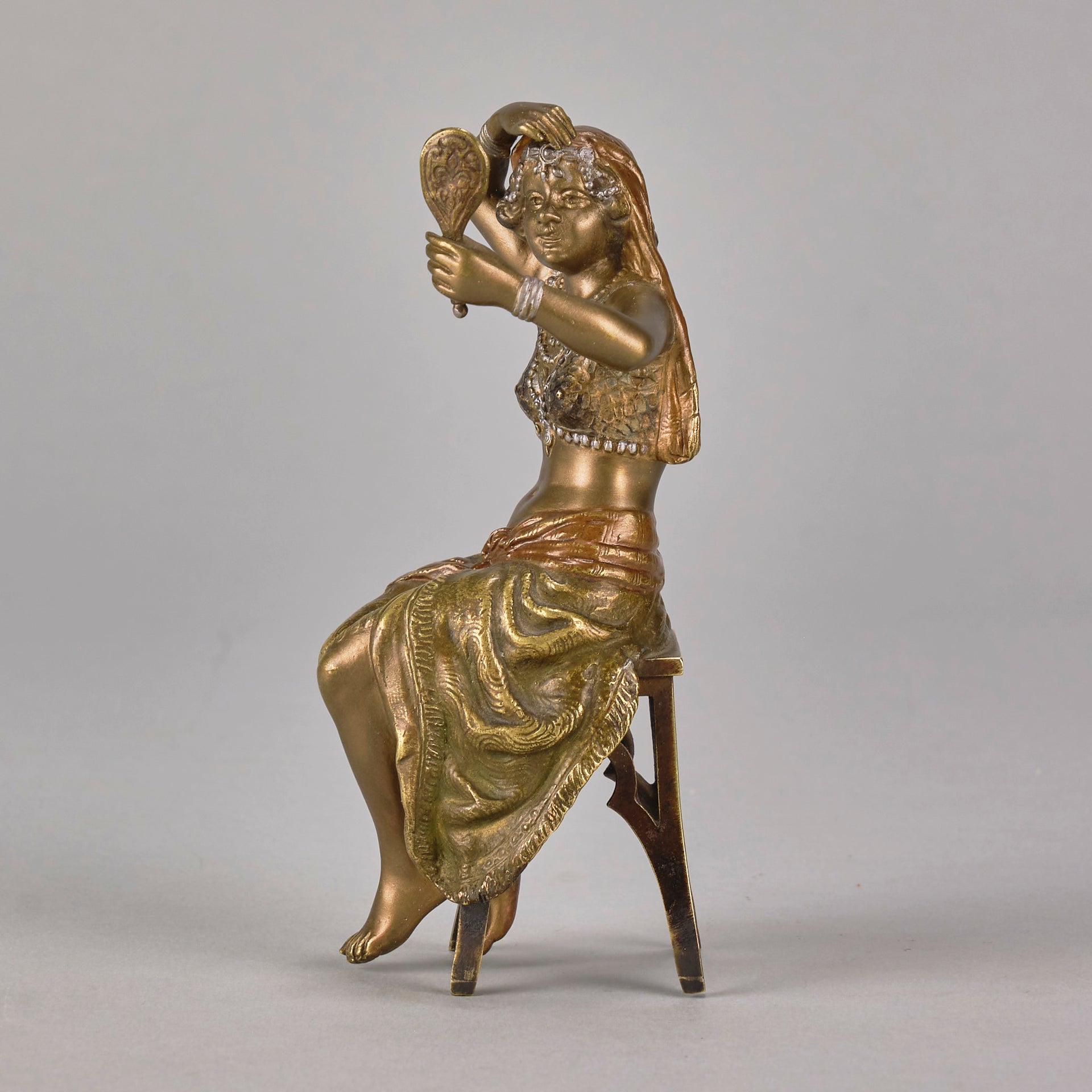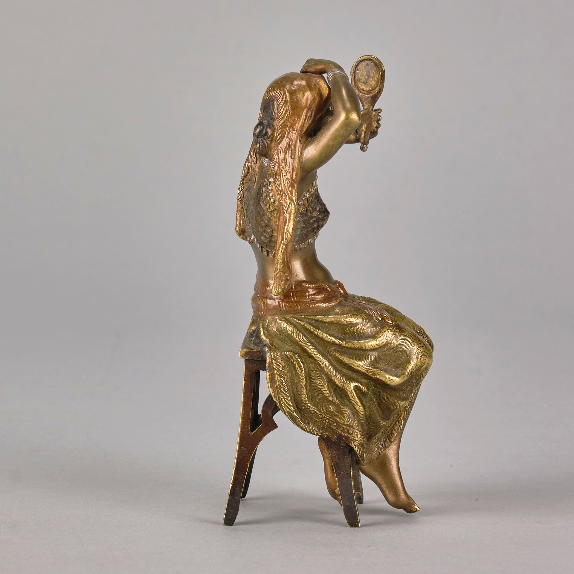 Very fine early 20th Century Vienna bronze study of a young lady seated on a stool and looking into a mirror . The surface of the bronze with rich cold painted colours lightly worn and with very fine hand finished detail. Signed with the Bergman 'B' in an amphora