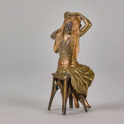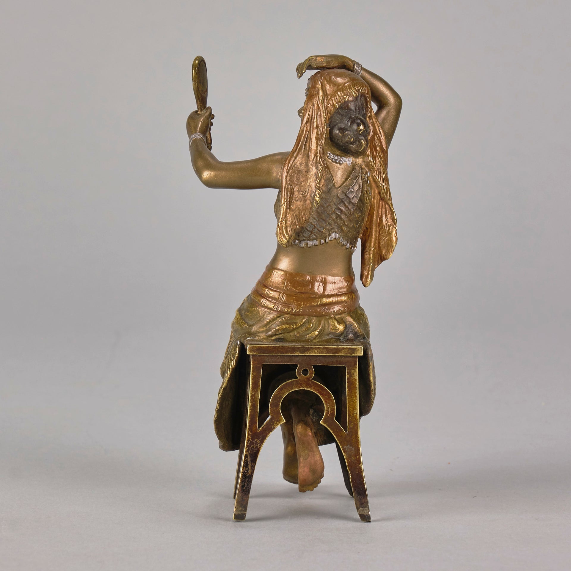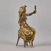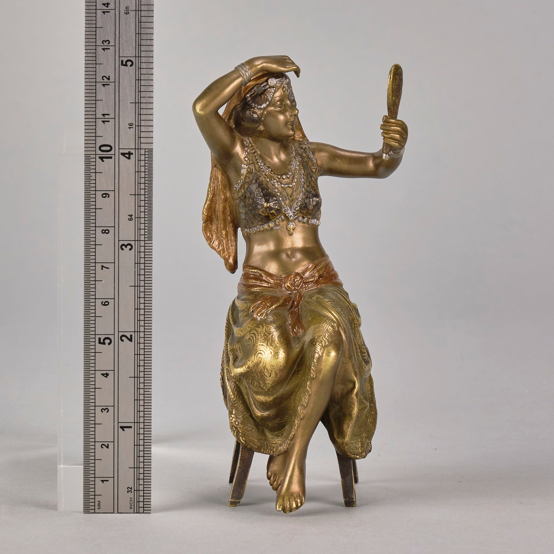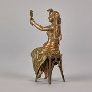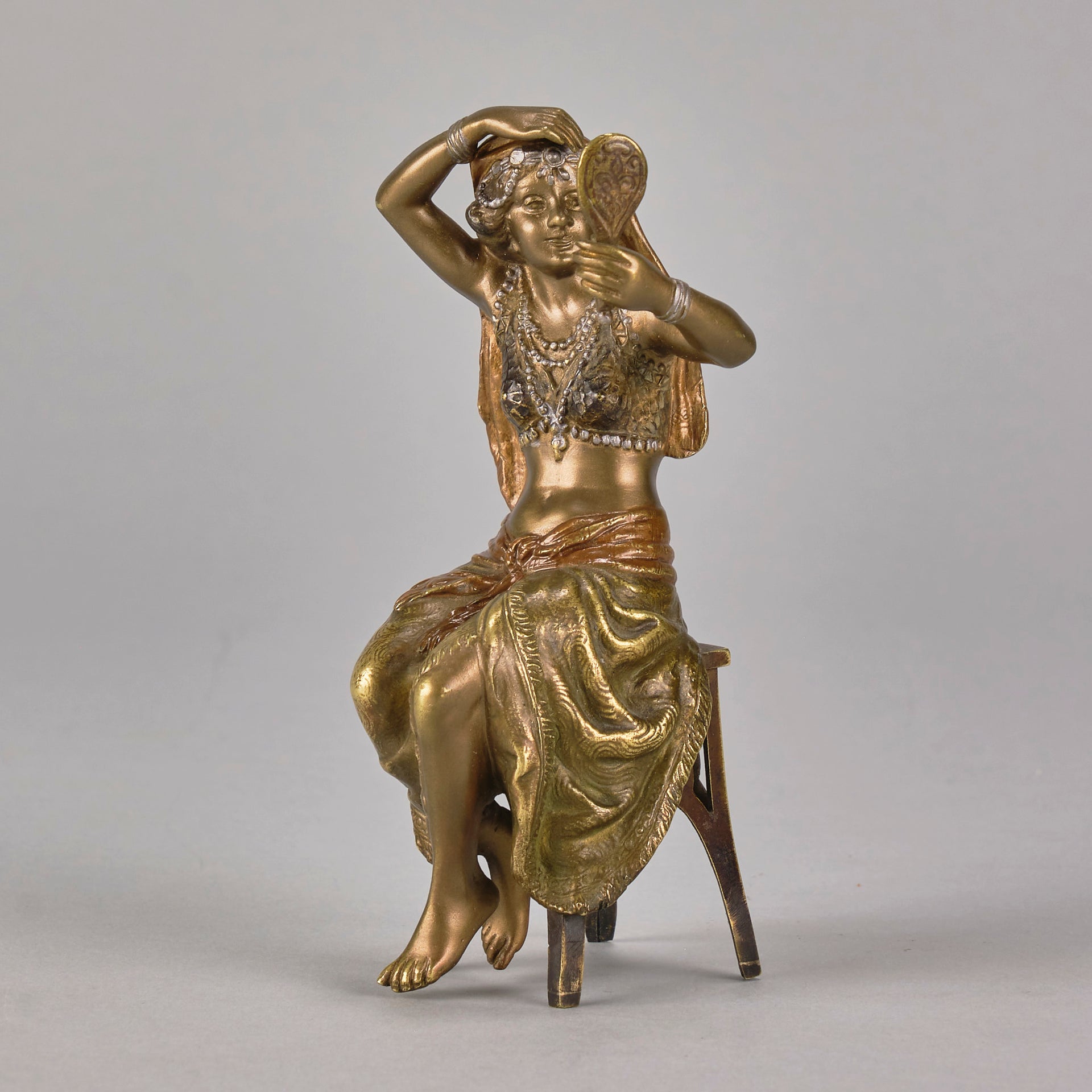 Very fine early 20th Century Vienna bronze study of a young lady seated on a stool and looking into a mirror . The surface of the bronze with rich cold painted colours lightly worn and with very fine hand finished detail. Signed with the Bergman 'B' in an amphora