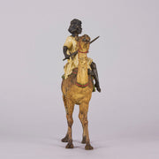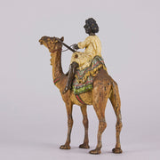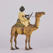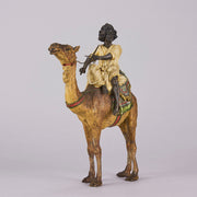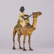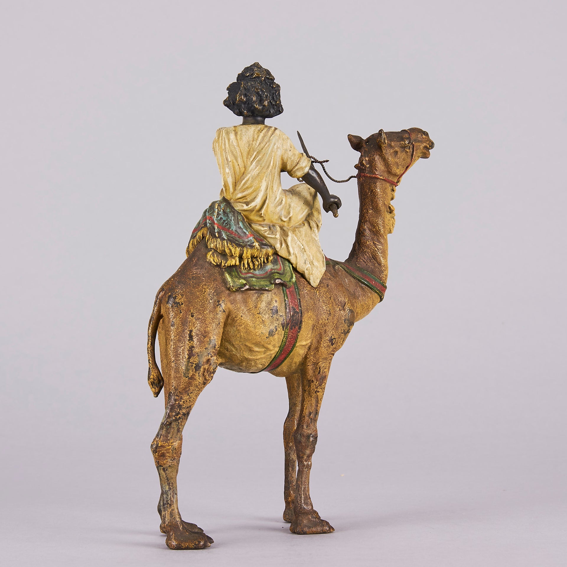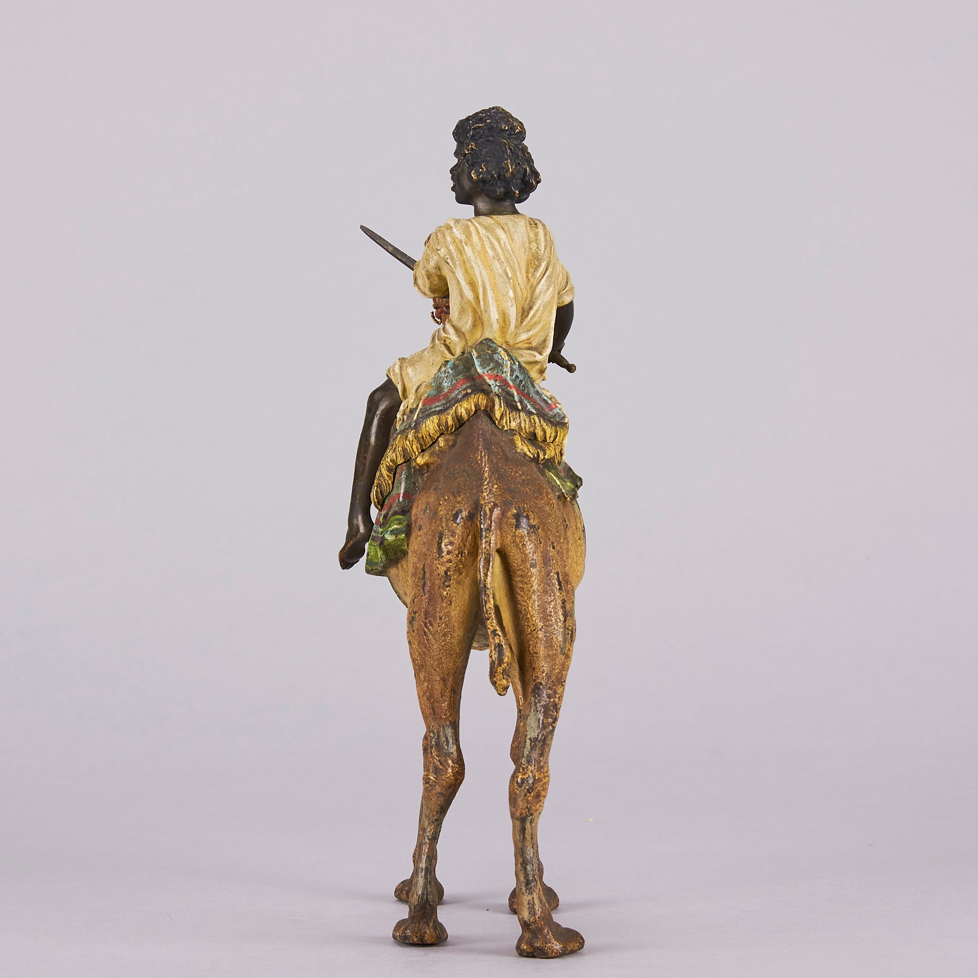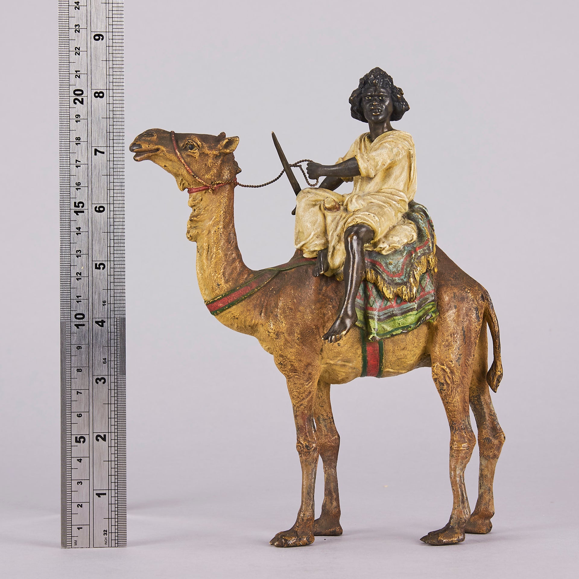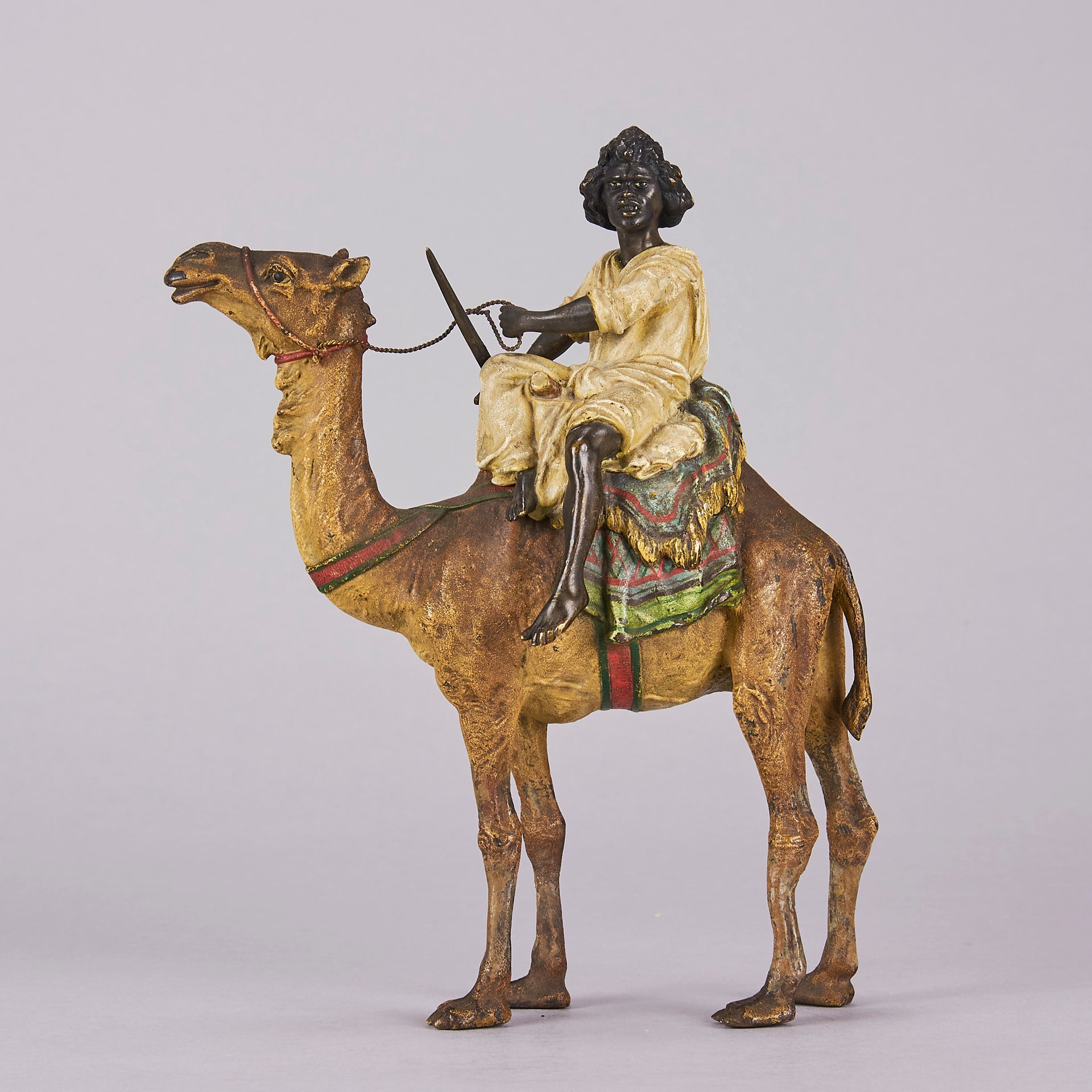 Captivating early 20th Century Austrian bronze  study of a young North African warrior mounted on his camel holding a sword, the surface of the bronze with rich cold painted colours and very fine hand finished surface detail, signed with the Bergman 'B' in an amphora