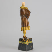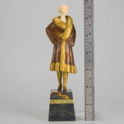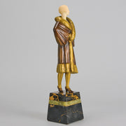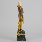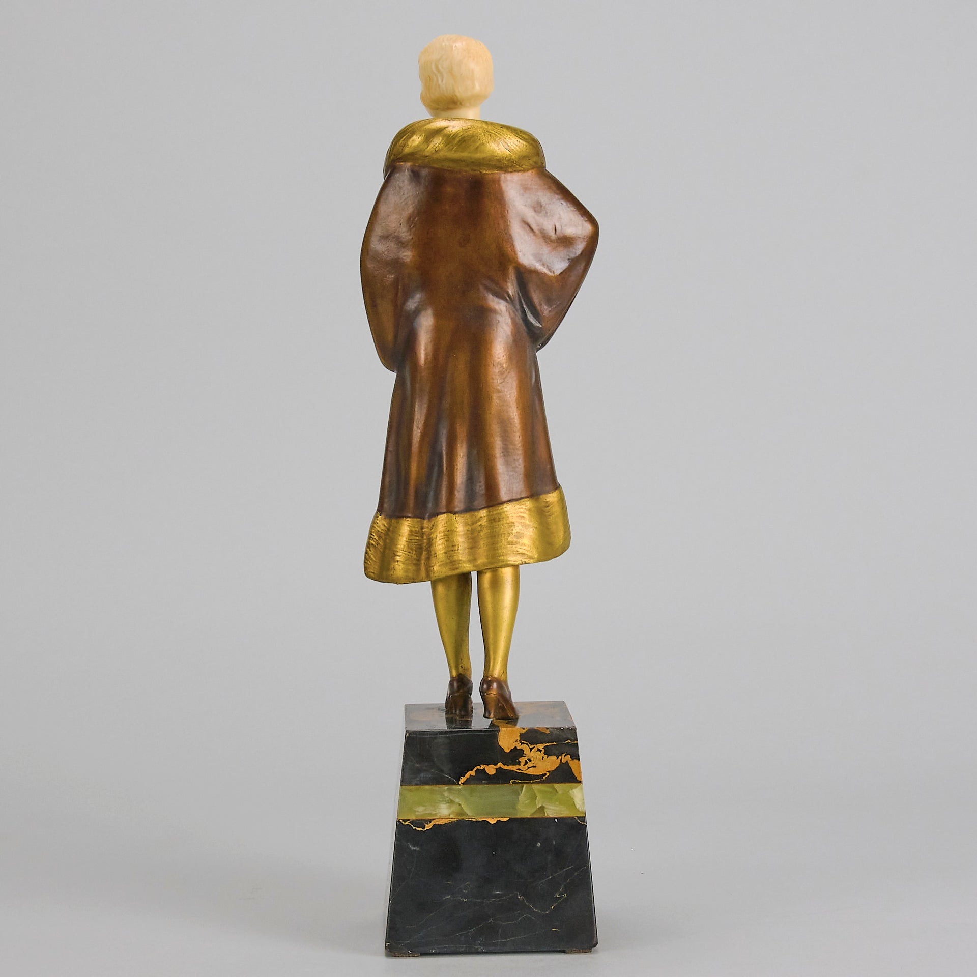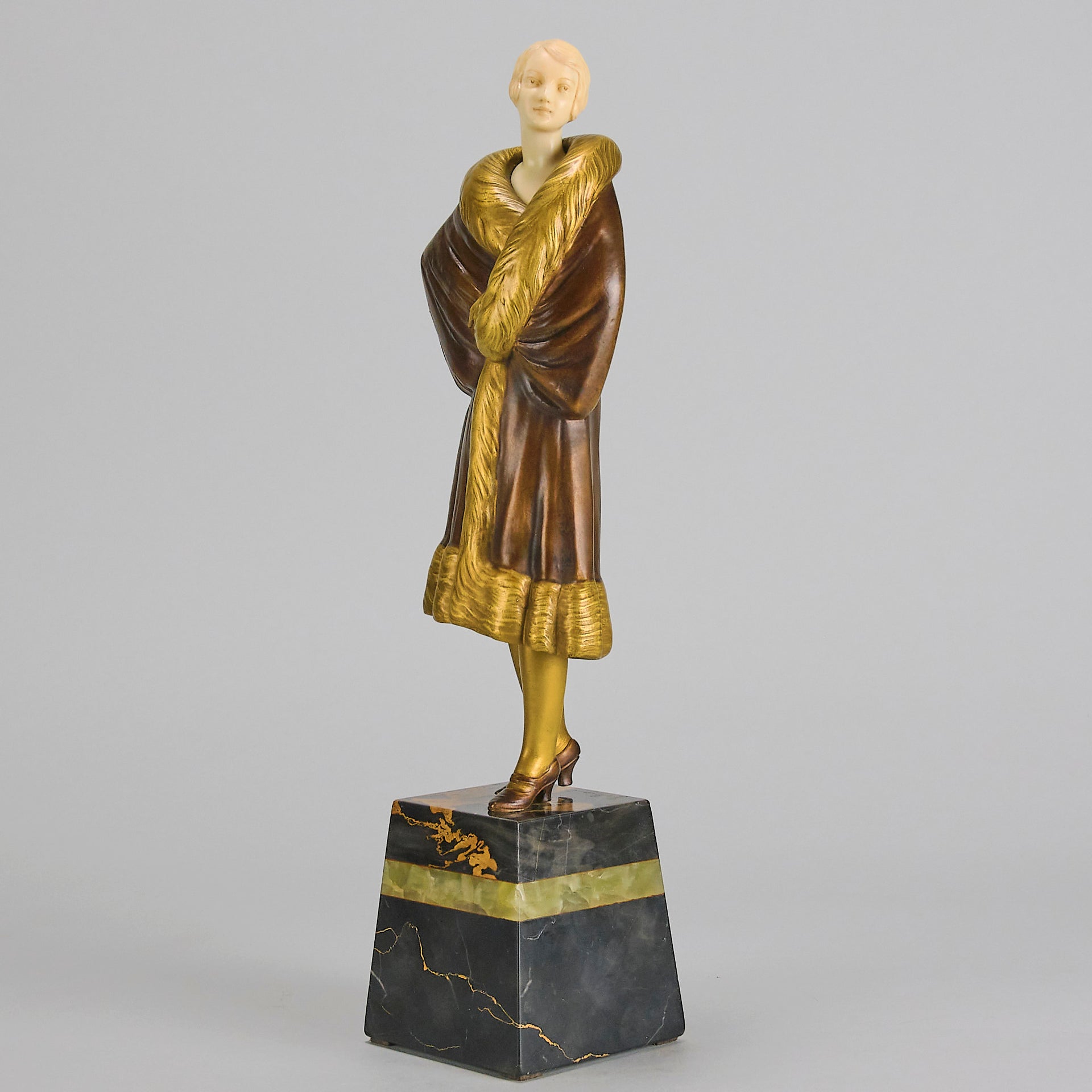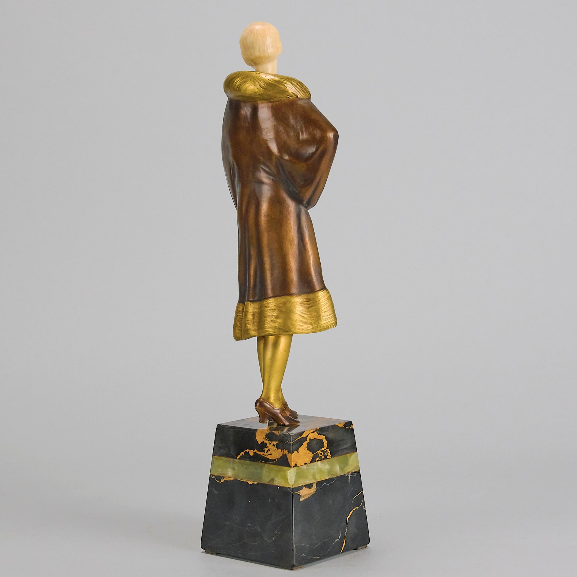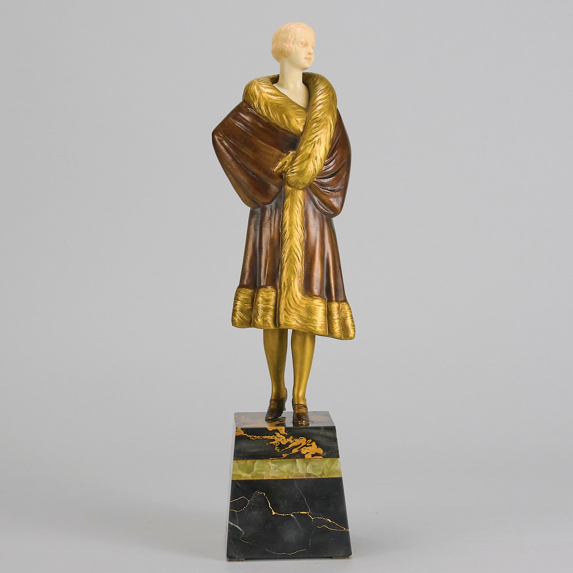A stunning Art Deco cold painted bronze and ivory figure of a young fashionista dressed in an impressive fur coat. The surface of the bronze with excellent detail and fine hand carved ivory head, raised on a shaped marble base and signed Rigot