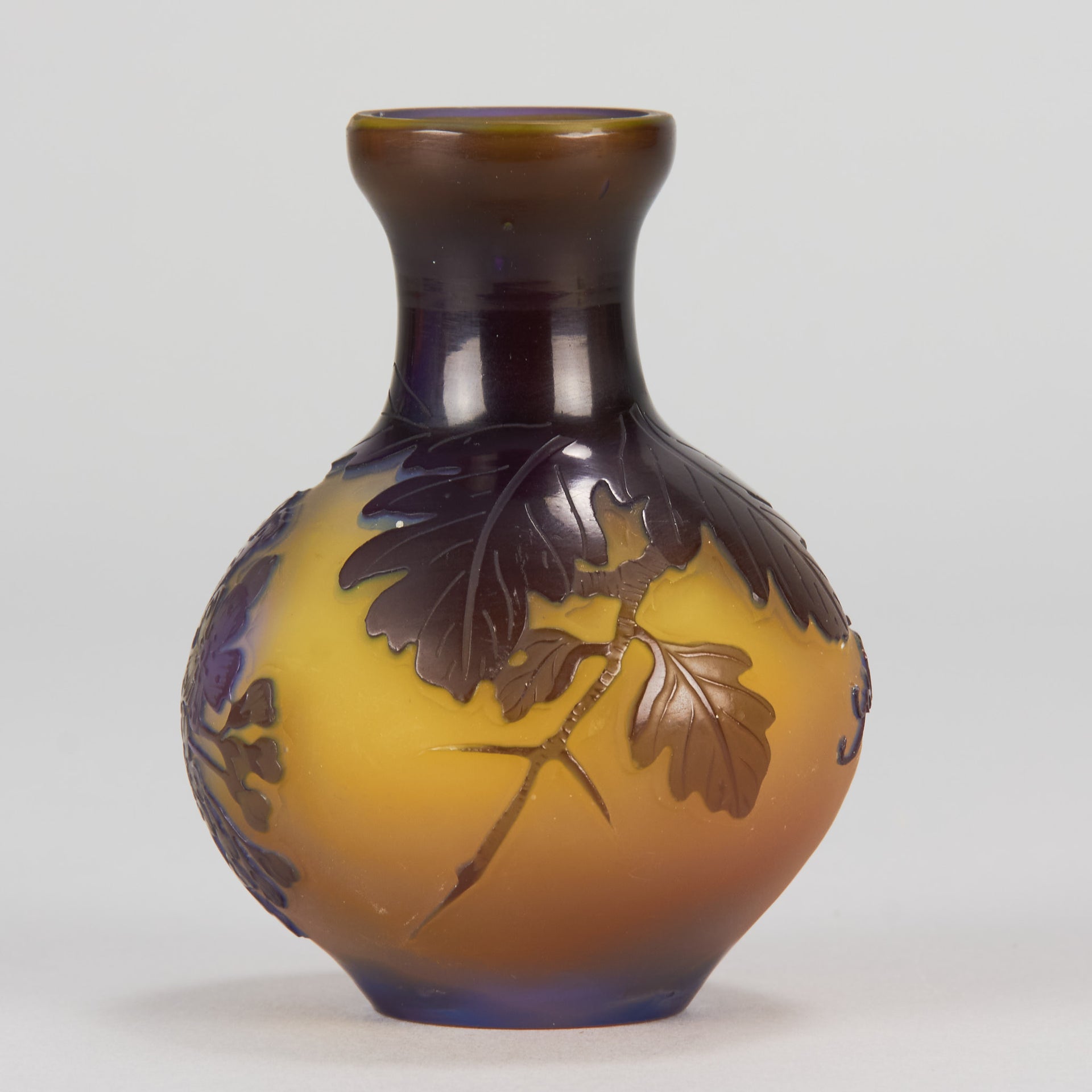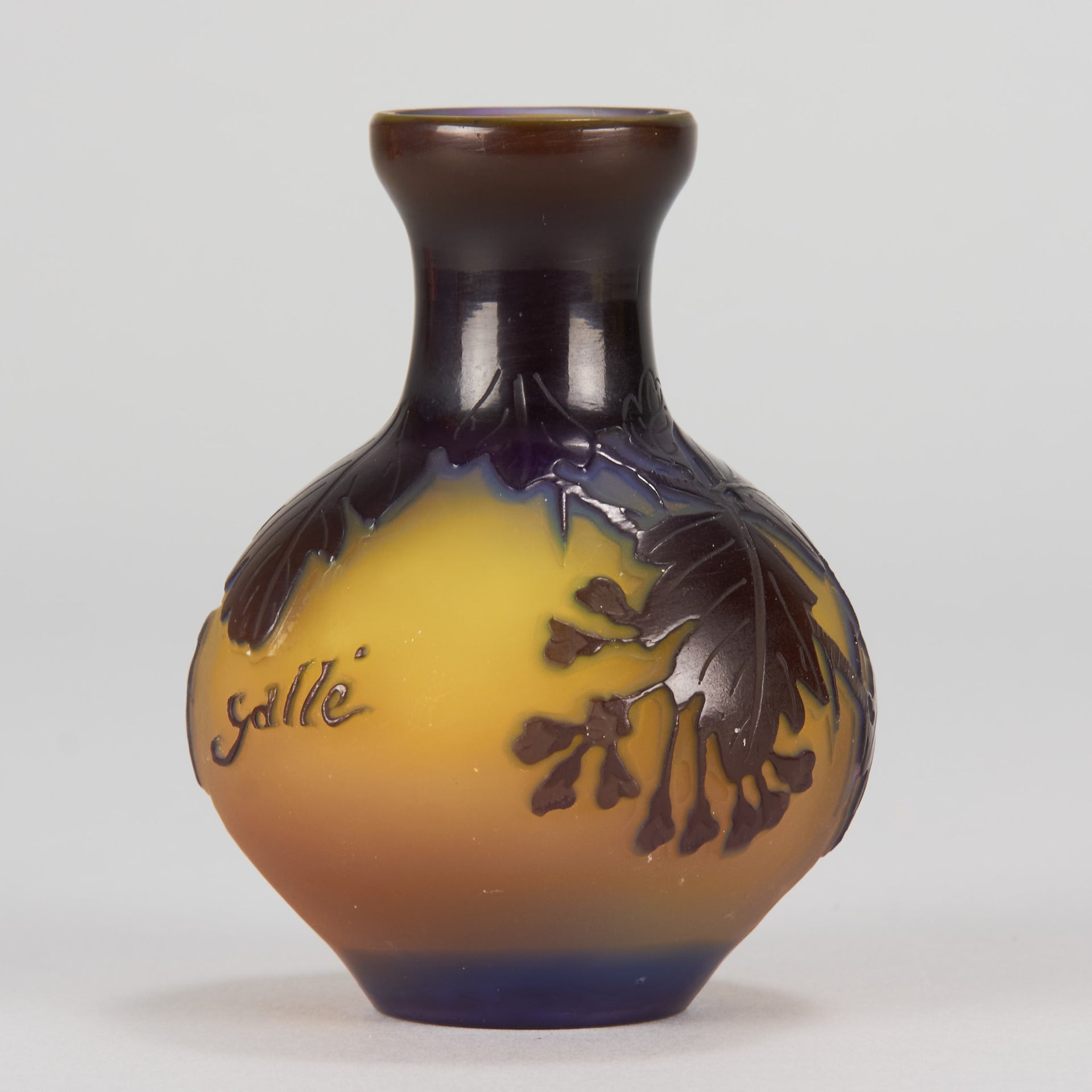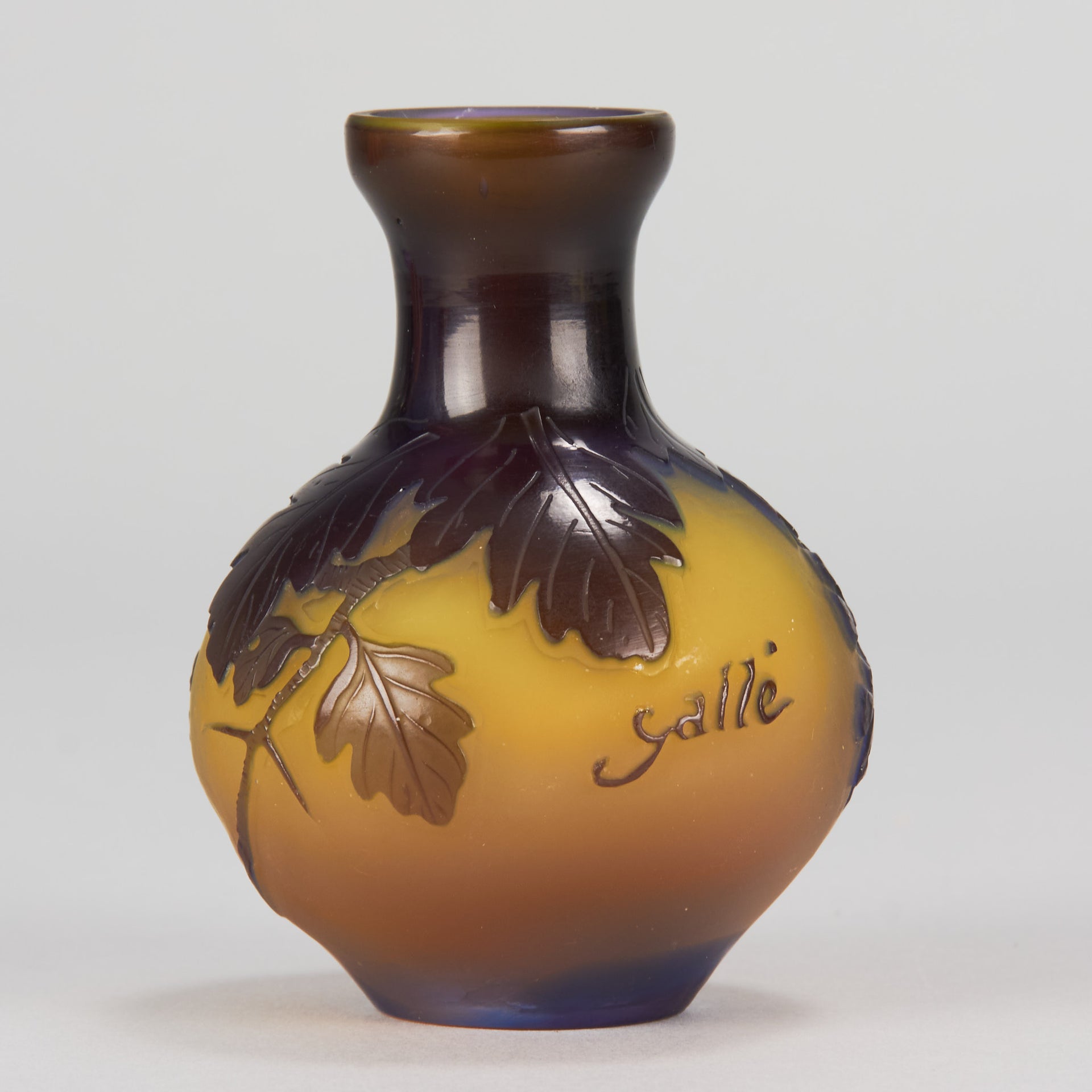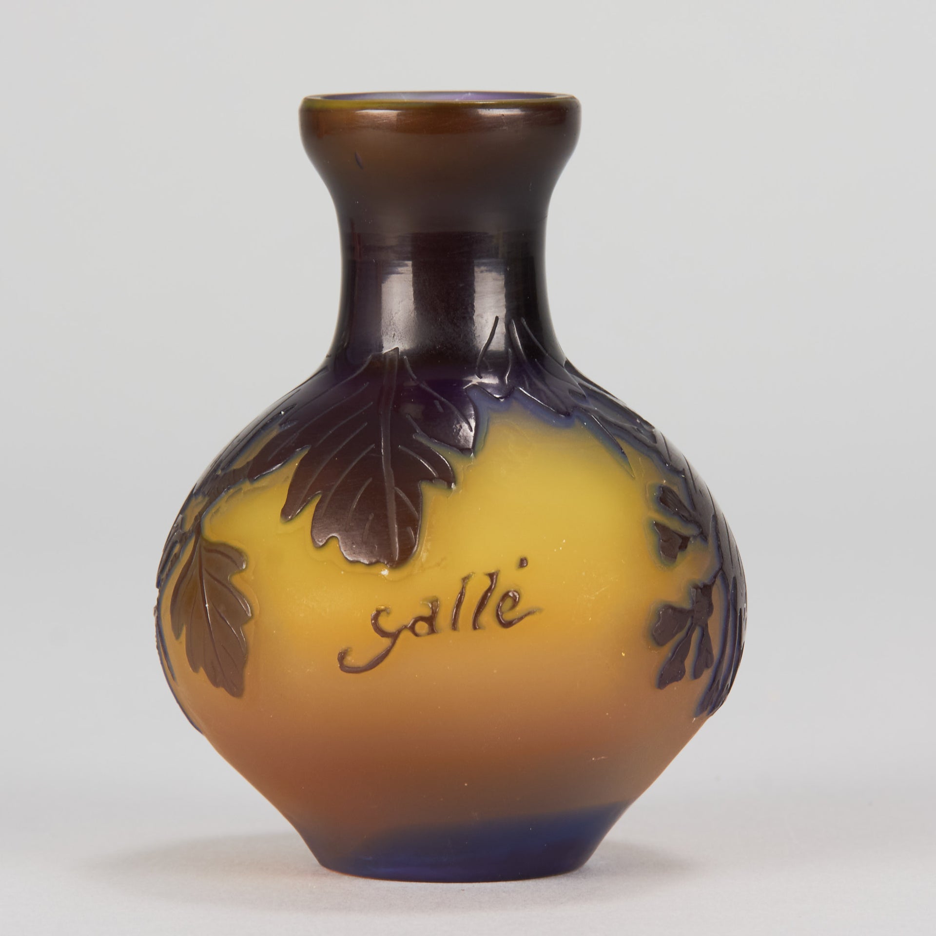 After being inspired by the glass works at the 1878 International Exhibition in Paris, particularly cameo works, Gallé made his mark as a true artist in glass at the 1884 Union Centrale des Arts Décoratifs in Paris where he showed 300 pieces of great artistic variety as well as technical expertise. He returned to the International Exhibition in Paris in 1889 to present his own new types of glass. The pieces featured new vase shapes, extraordinary new colours, carved cameo and pate de verre work. The event was a breakthrough for him and the Art Nouveau style in general, with his pieces beginning to be widely imitated (notably by the likes of the Daum brothers.)