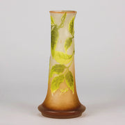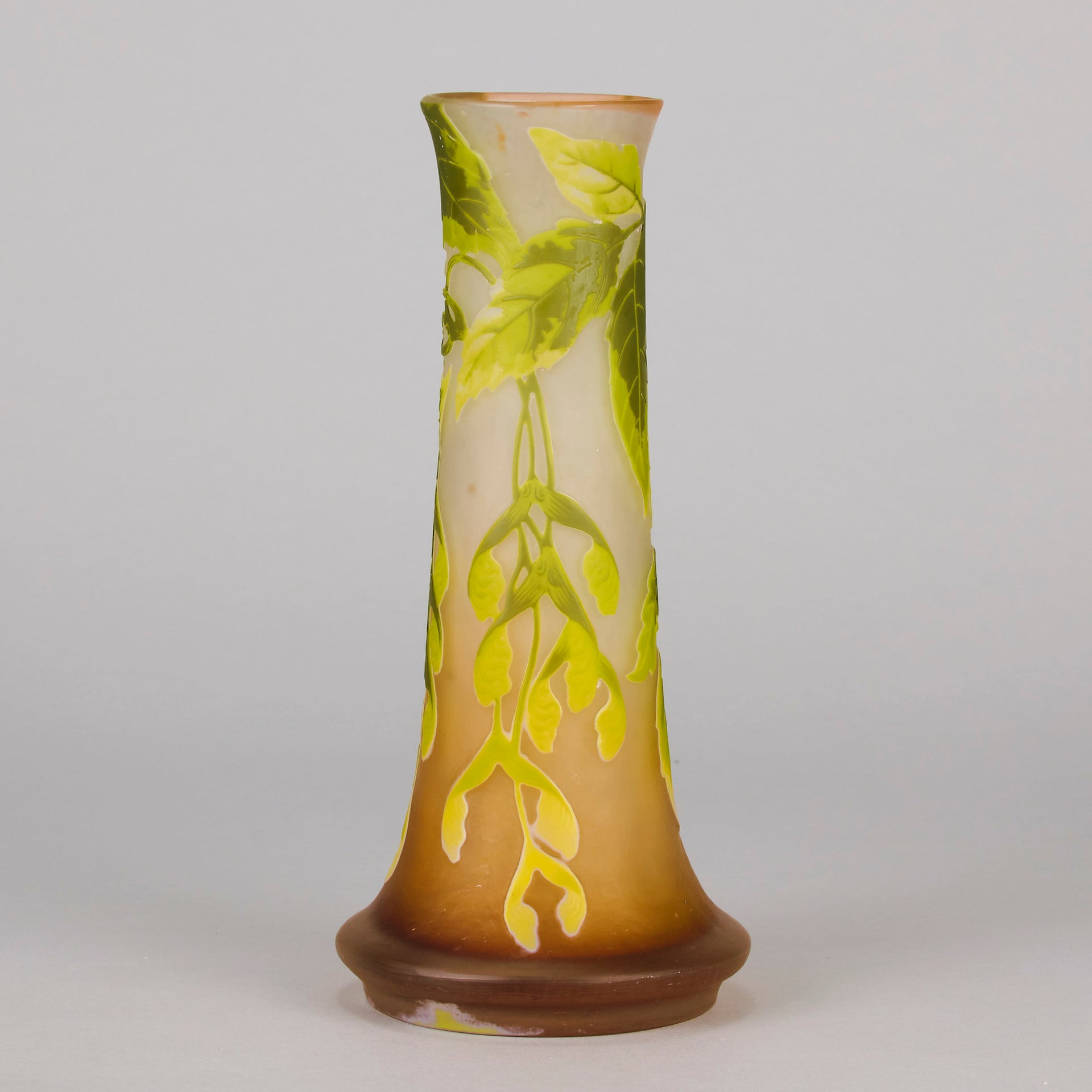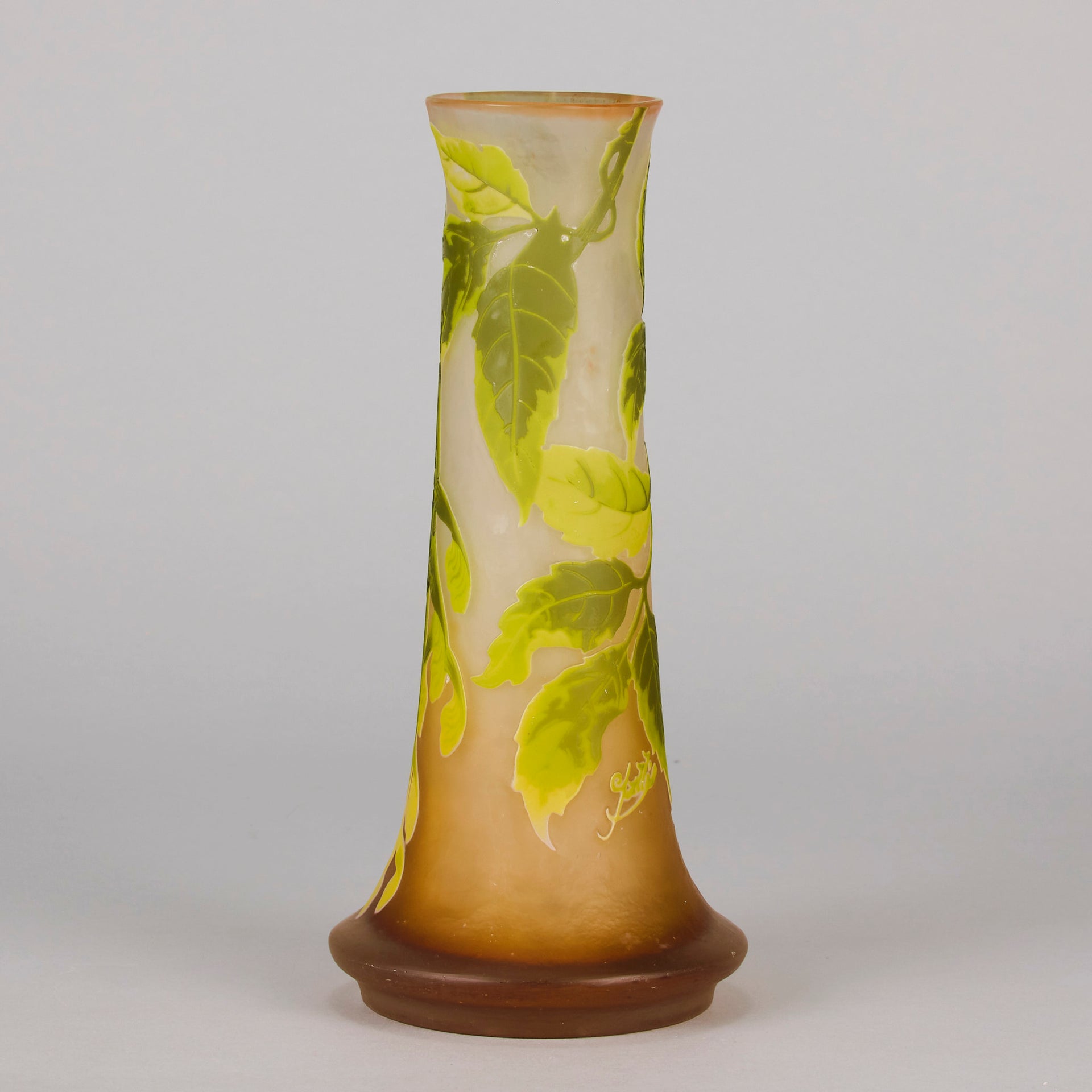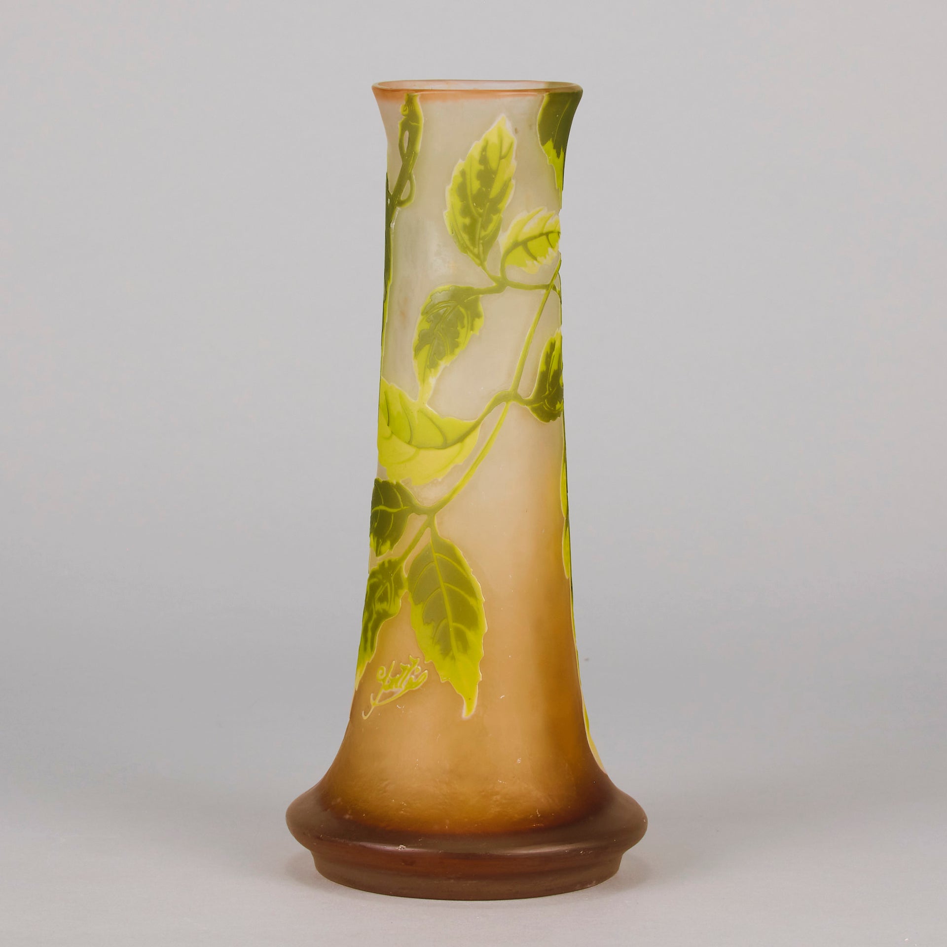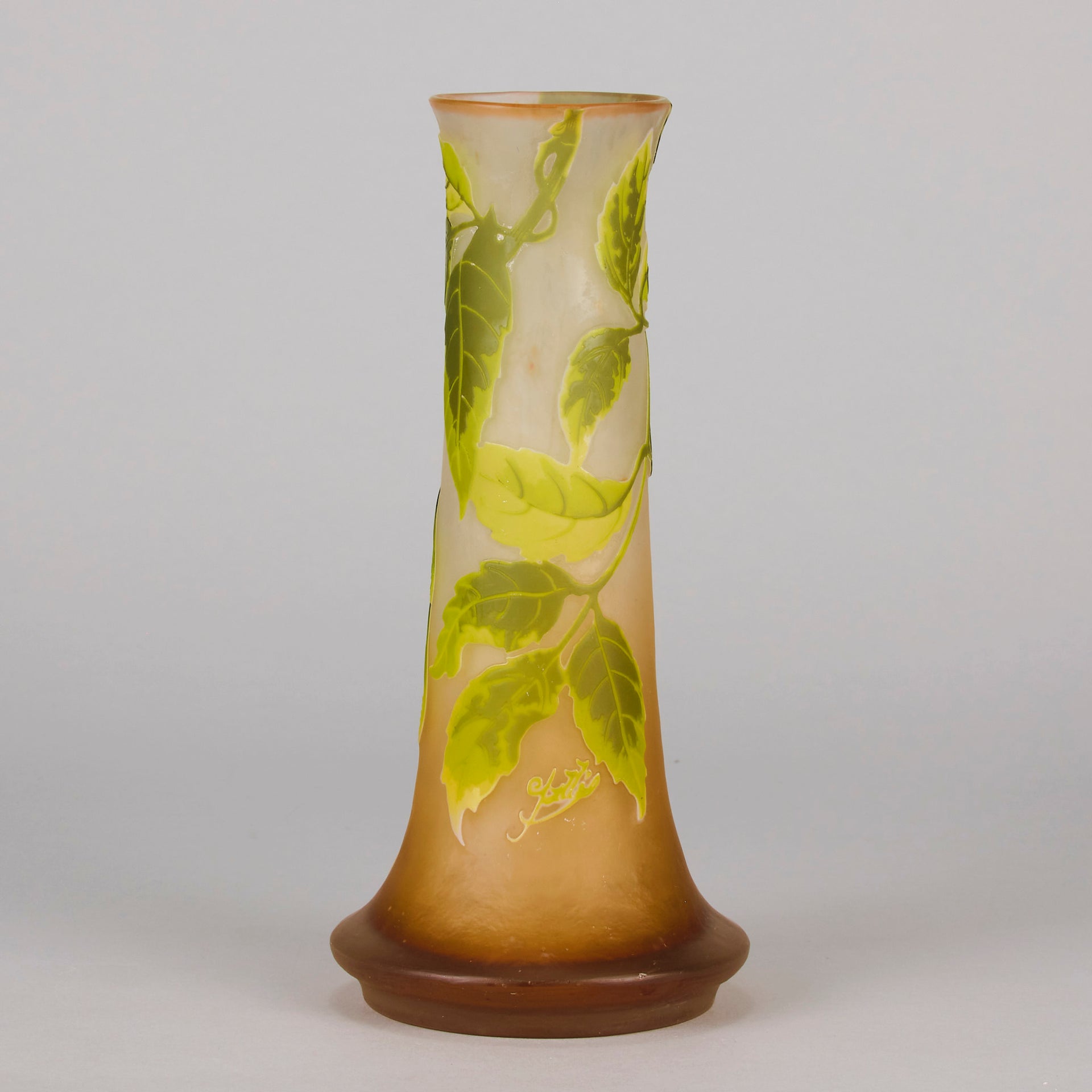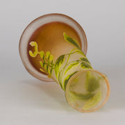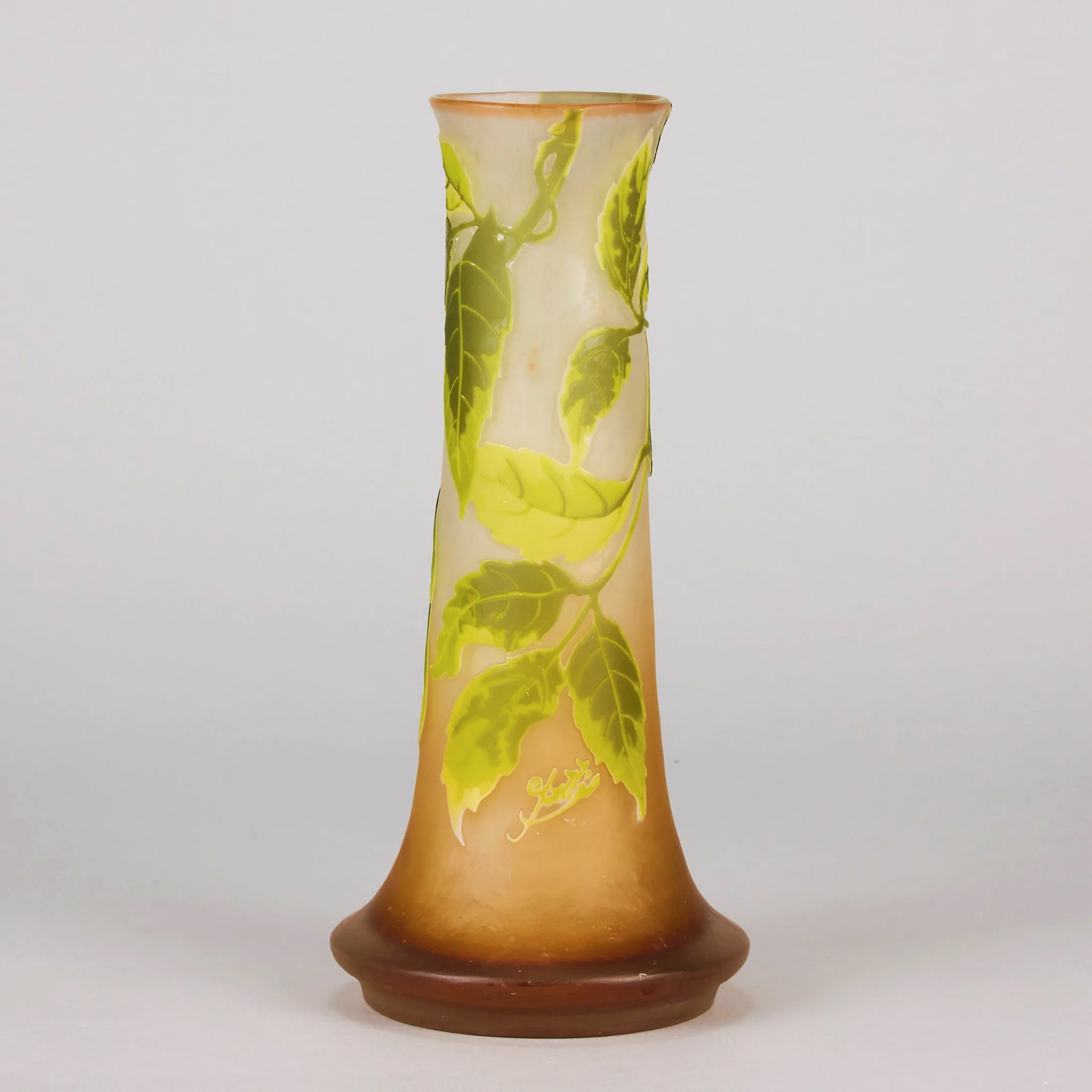After being inspired by the glass works at the 1878 International Exhibition in Paris, particularly cameo works, Gallé made his mark as a true artist in glass at the 1884 Union Centrale des Arts Décoratifs in Paris where he showed 300 pieces of great artistic variety as well as technical expertise. He returned to the International Exhibition in Paris in 1889 to present his own new types of glass. The pieces featured new vase shapes, extraordinary new colours, carved cameo and pate de verre work. The event was a breakthrough for him and the Art Nouveau style in general, with his pieces beginning to be widely imitated (notably by the likes of the Daum brothers.)