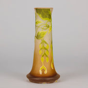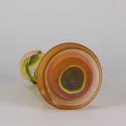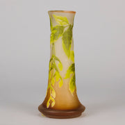 Gallé’s Cameo Glass was made with layering coloured glass, using acid to remove part of the layers and adding wheel carved detail on the better pieces. He discovered applying metallic foils between the coloured glass sheets created a stunning effect, especially when applied in the cameo work. His enamel work was just as revolutionary as he mixed metallic oxides with glass and suspended them in oil, giving the pieces a completely different finish after firing.