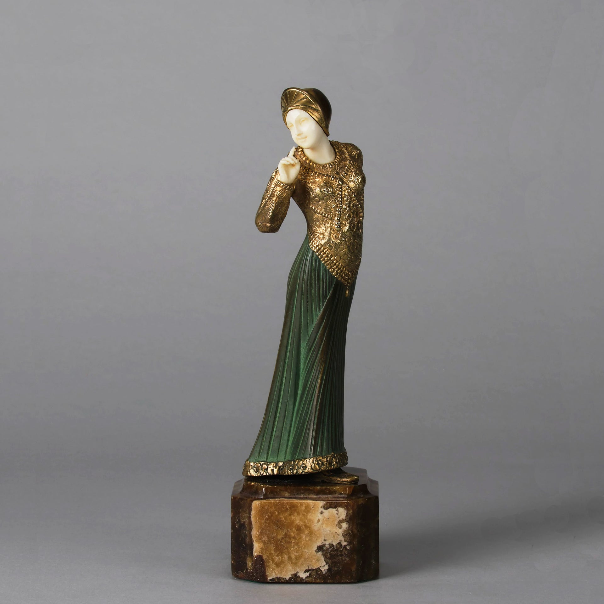 A very fine early 20th Century cold painted bronze and hand carved ivory figure of an elegant beauty wearing a full length gown delicately decorated with fine colour and excellent hand finished surface detail raised on a shaped variegated brown onyx base, signed G Gori