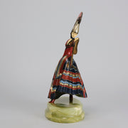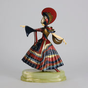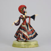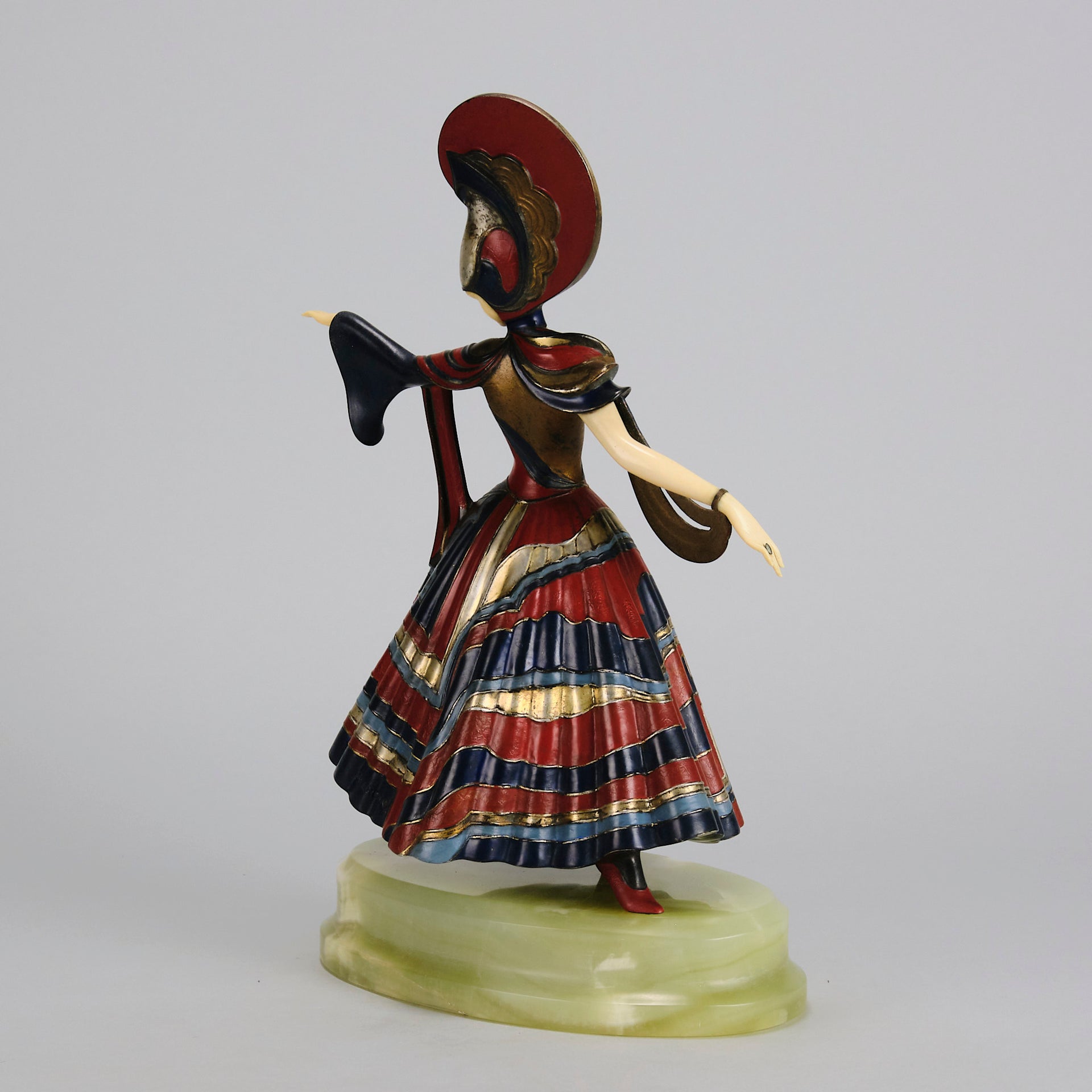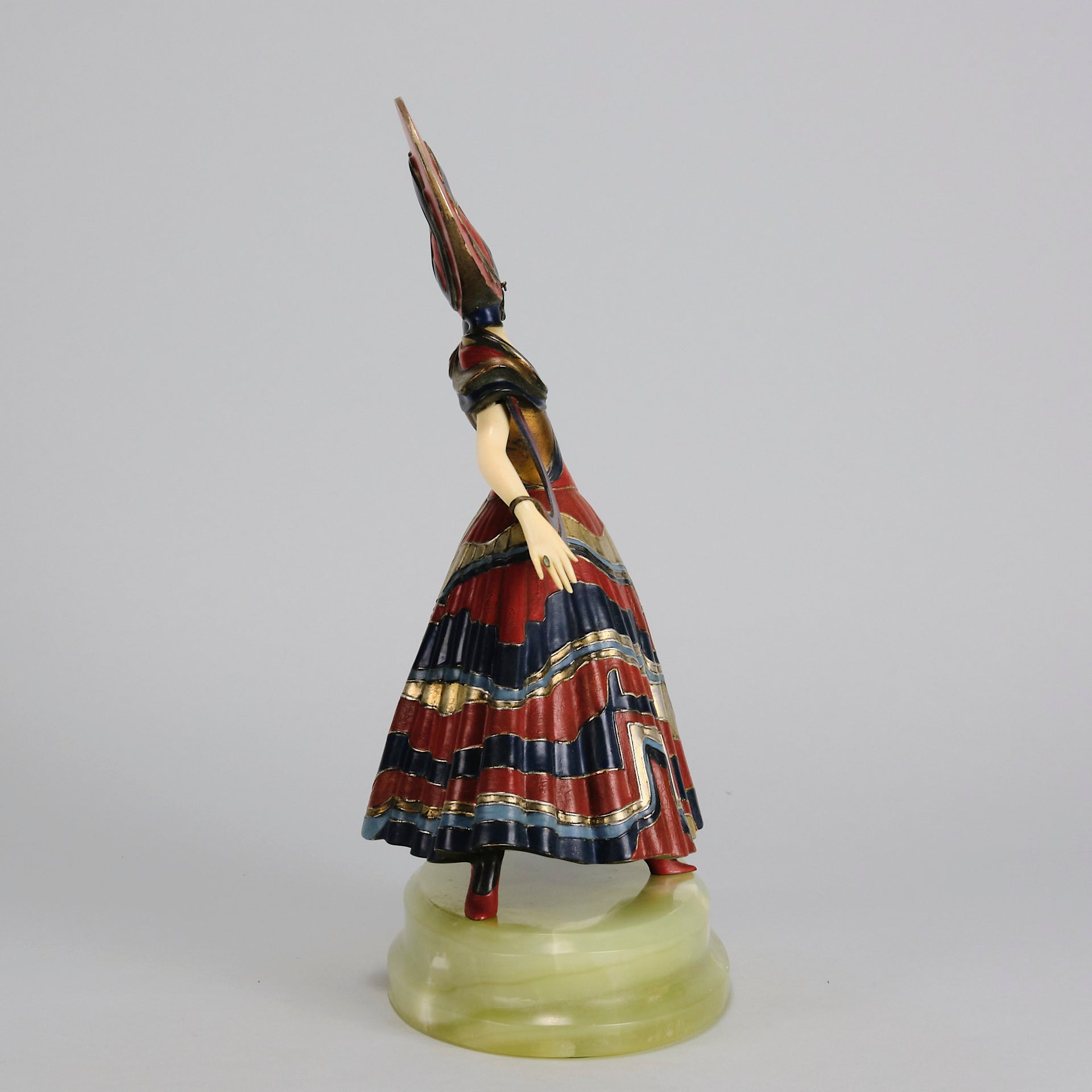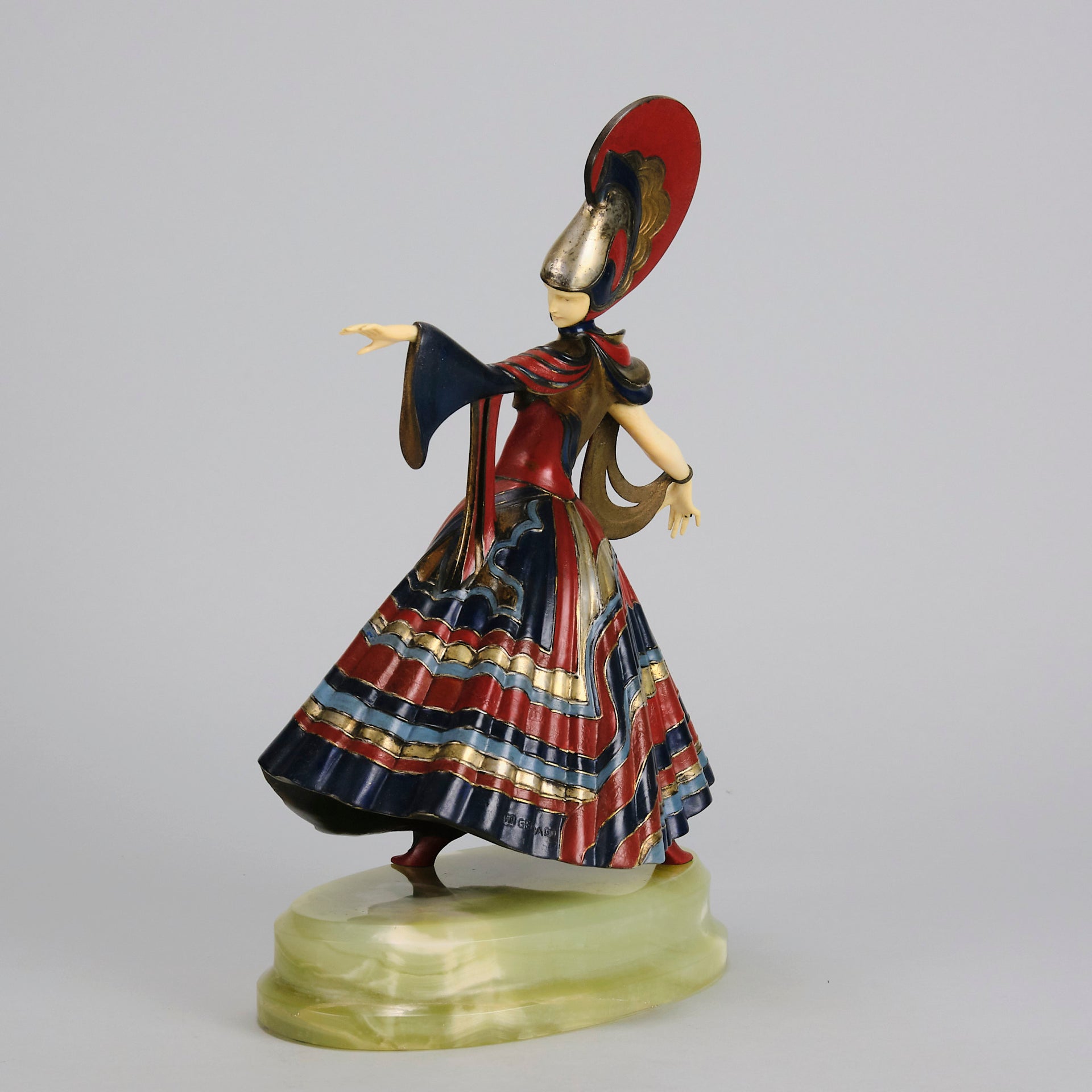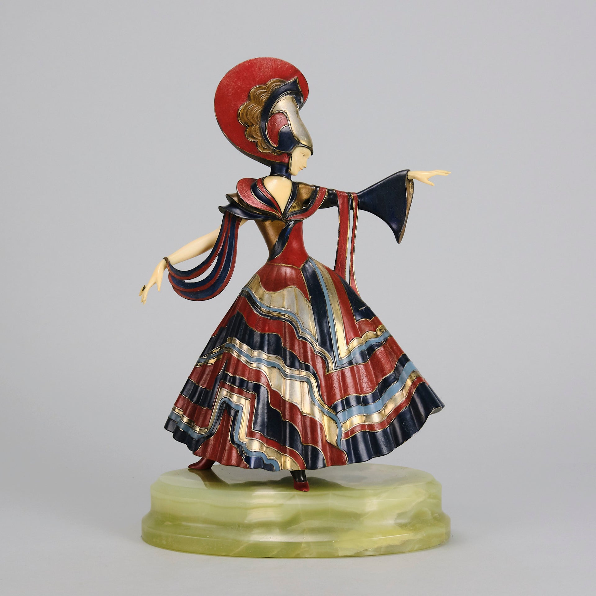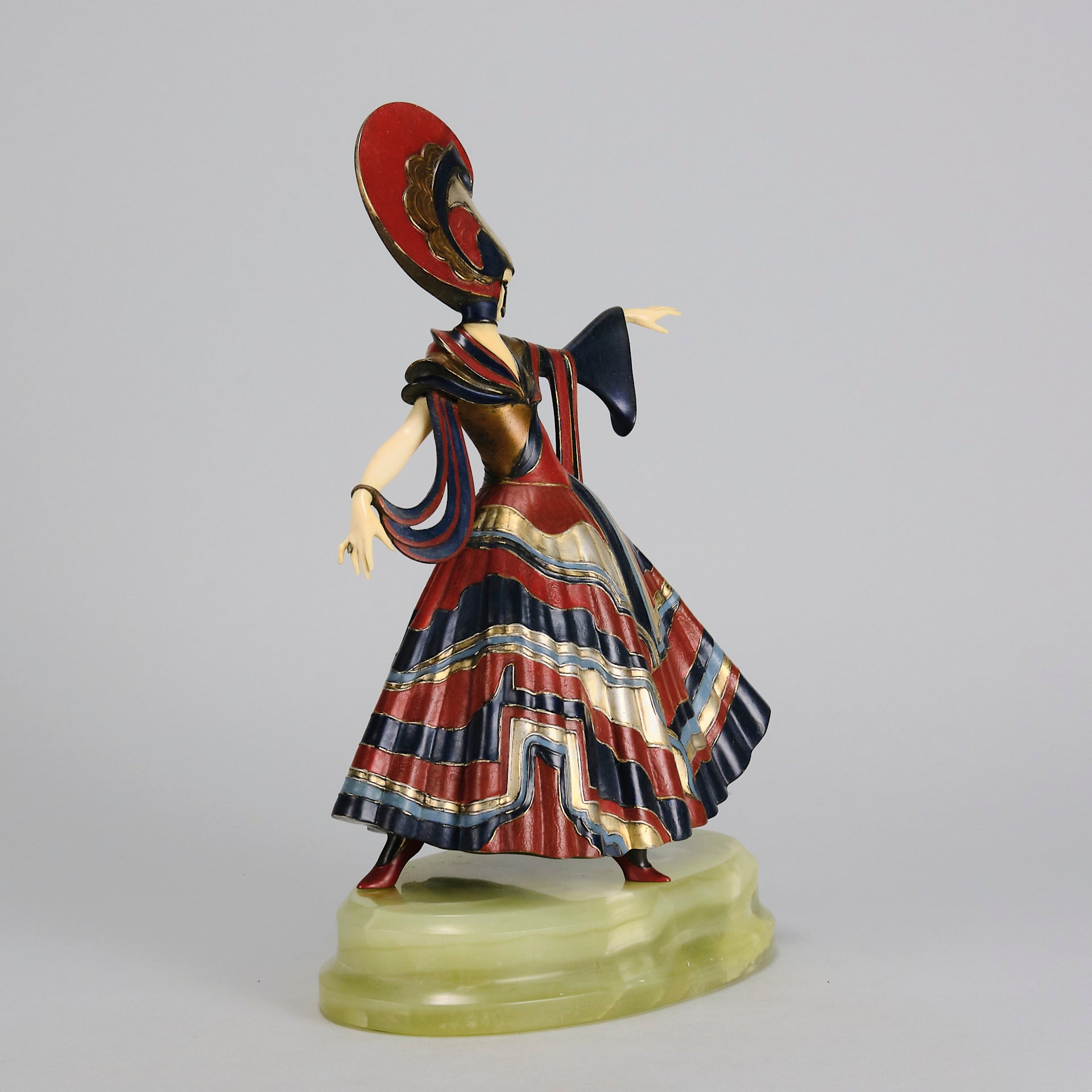 A fabulous early 20th Century Art Deco gilt bronze and ivory figure of a dancer in flamboyant theatrical attire with matching headdress highlighted with enamel multi coloured and silvered decoration exhibiting excellent colour and fine hand carved detail, raised on an onyx base and signed Gerdago