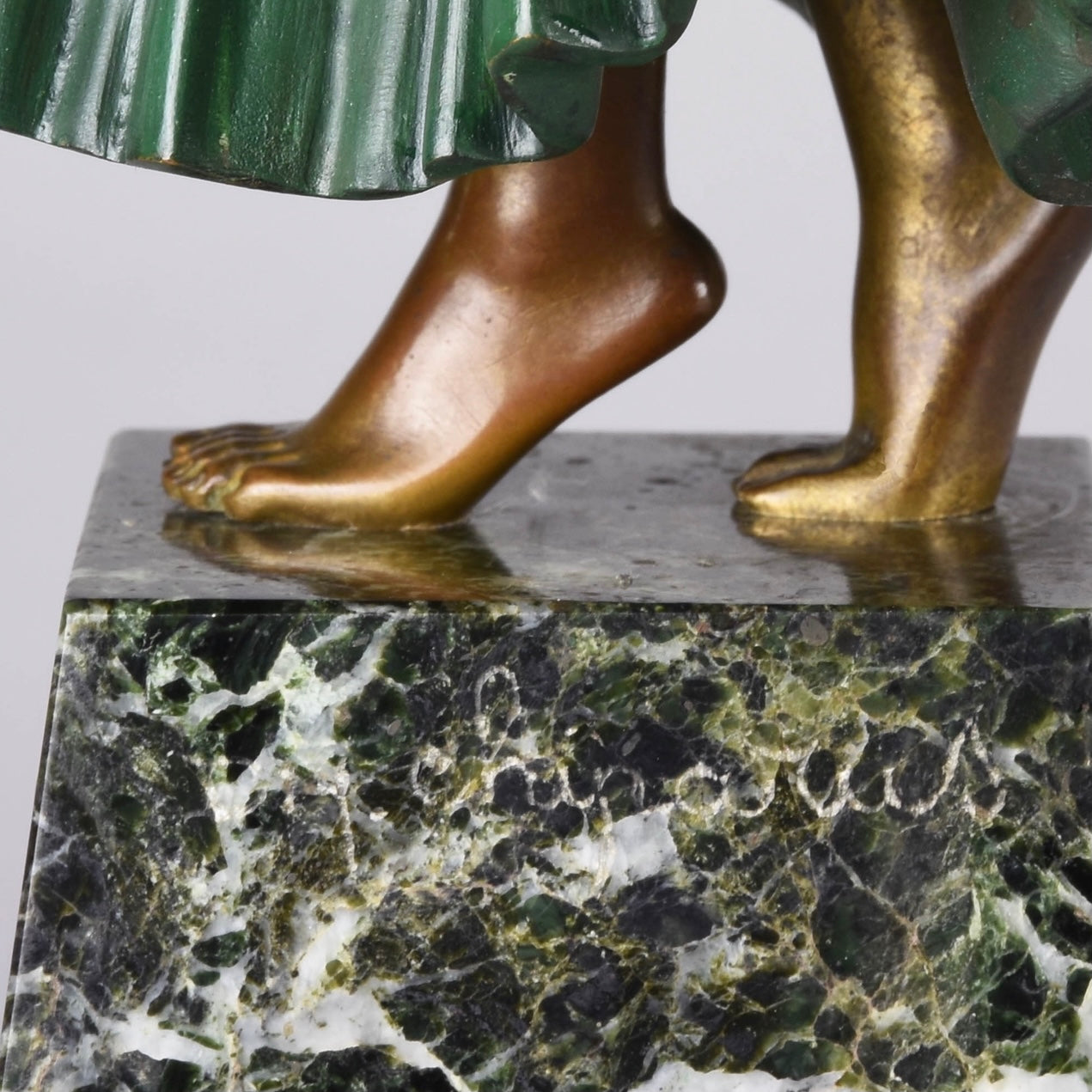 Chiparus's early figures, those on a relatively simple bases, were primarily cast by Etling, a Paris foundry the retailer of contemporary French decorative arts in the 1920s and 1930s. The later pieces were made by the Les Neveux de J Lehmann foundry which specialised in making the more elaborate marble and onyx plinths like the one on this figure Antinea.
