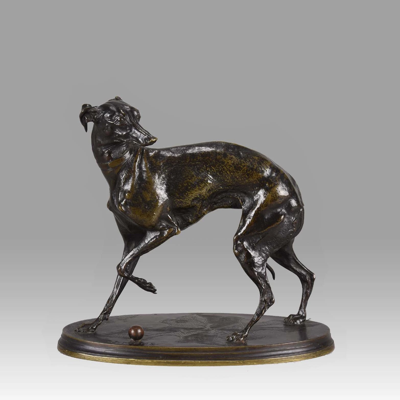 Delightful mid 19th Century French Animaliers bronze study of a playful Whippet looking around in an attitude to play with a ball at her feet, with rich brown rubbed to a golden colour and fine hand chased surface detail. Signed P J Mene and raised on a naturalistic carpet base.