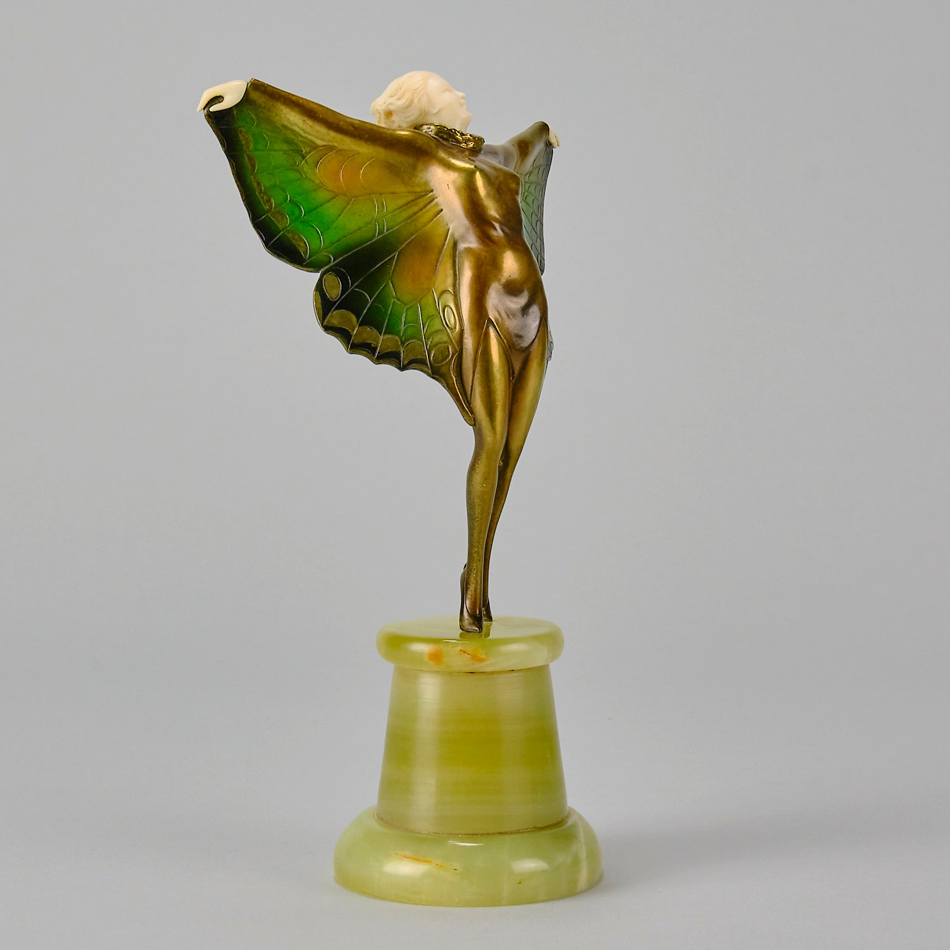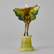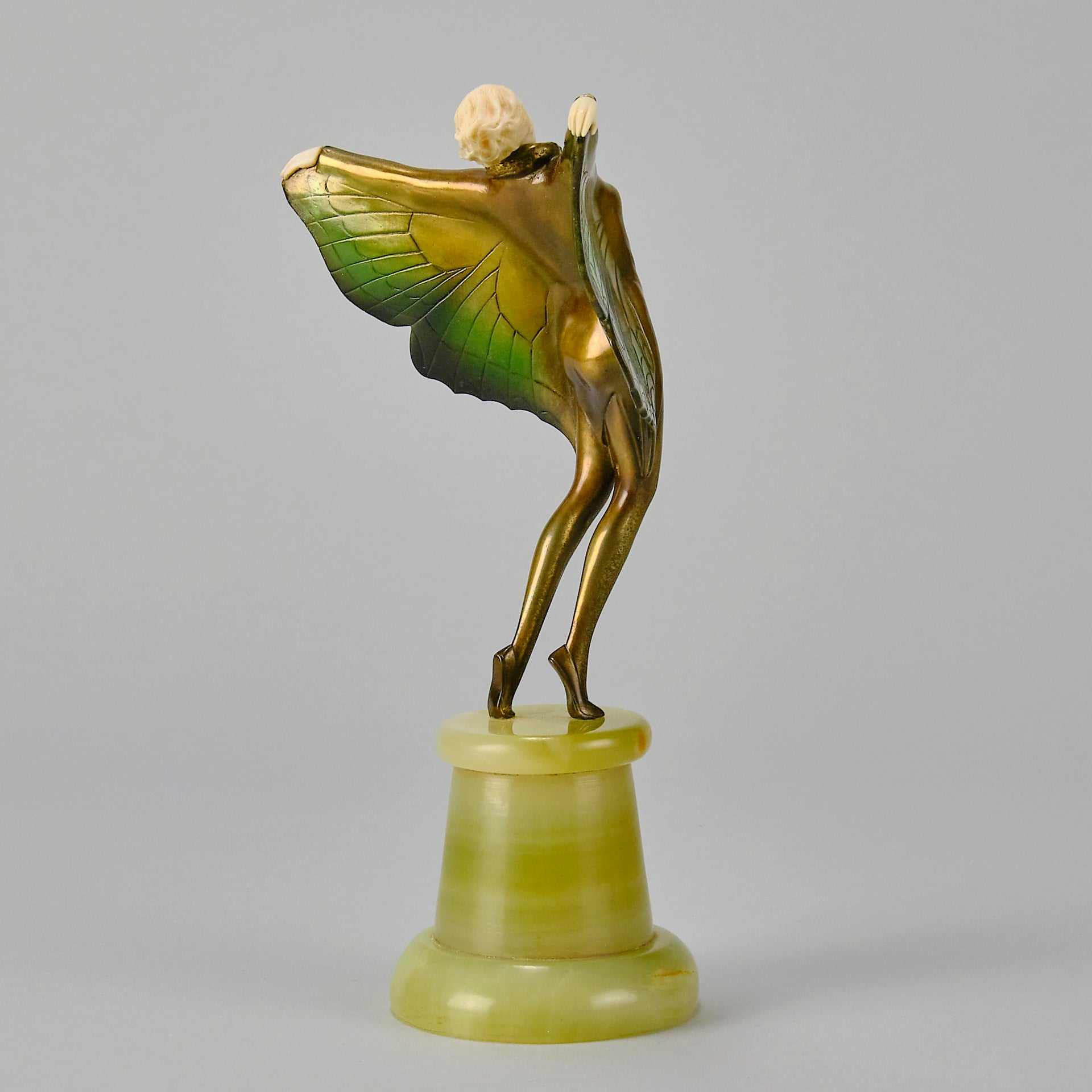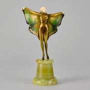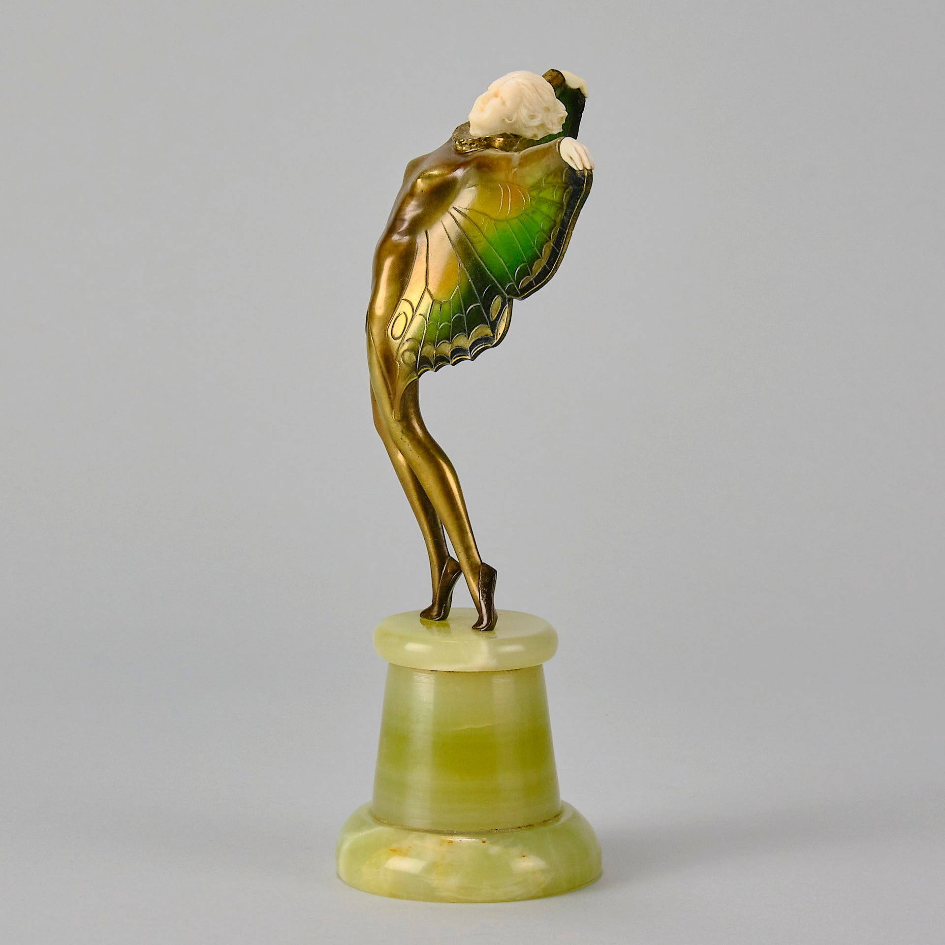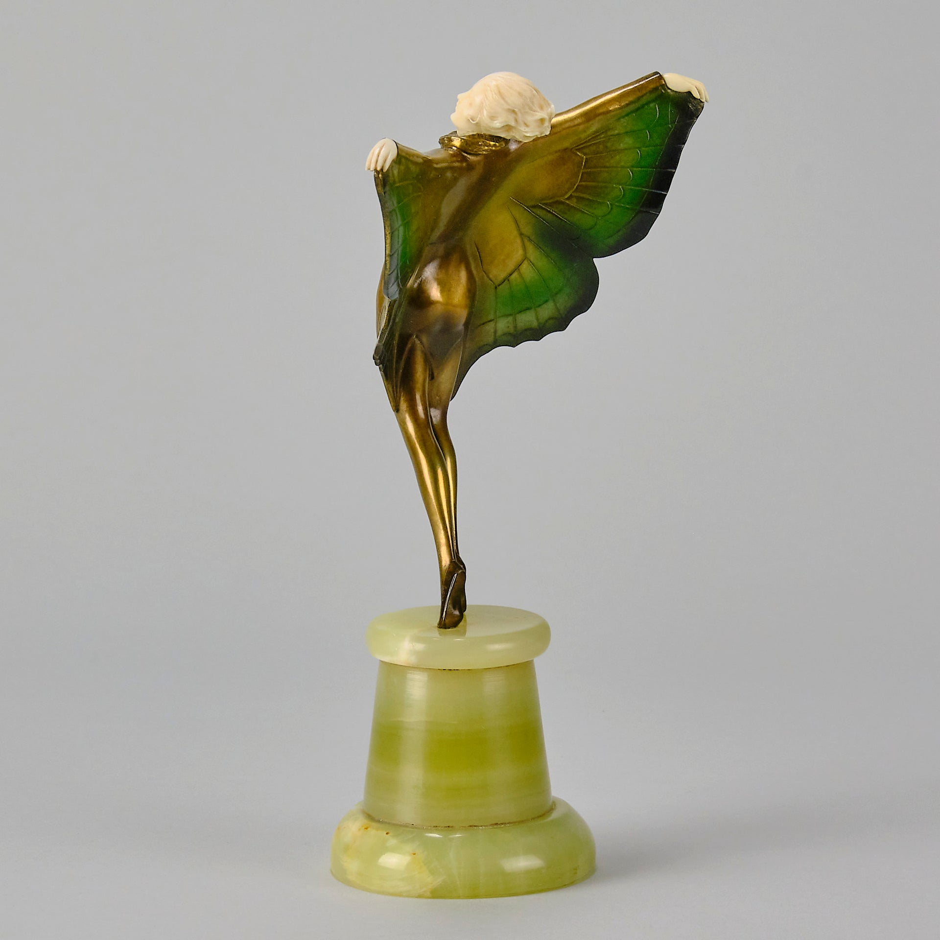 An enchanting early 20th Century Art Deco cold painted bronze and hand carved ivory figure of a young beauty dressed in a flamboyant costume, her arms outstretched showing her wonderful wings. The fine bronze exhibitng excellent colours and fine hand finished detail, raised on a shaped onyx plinth and signed R Lor