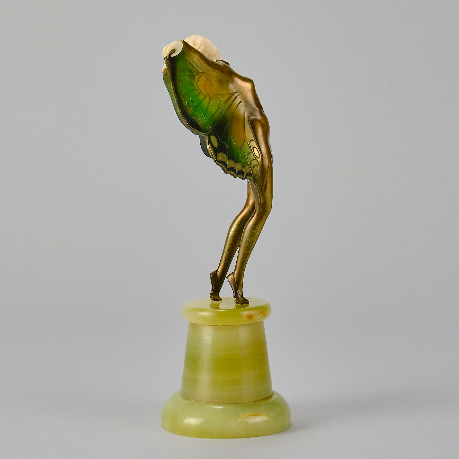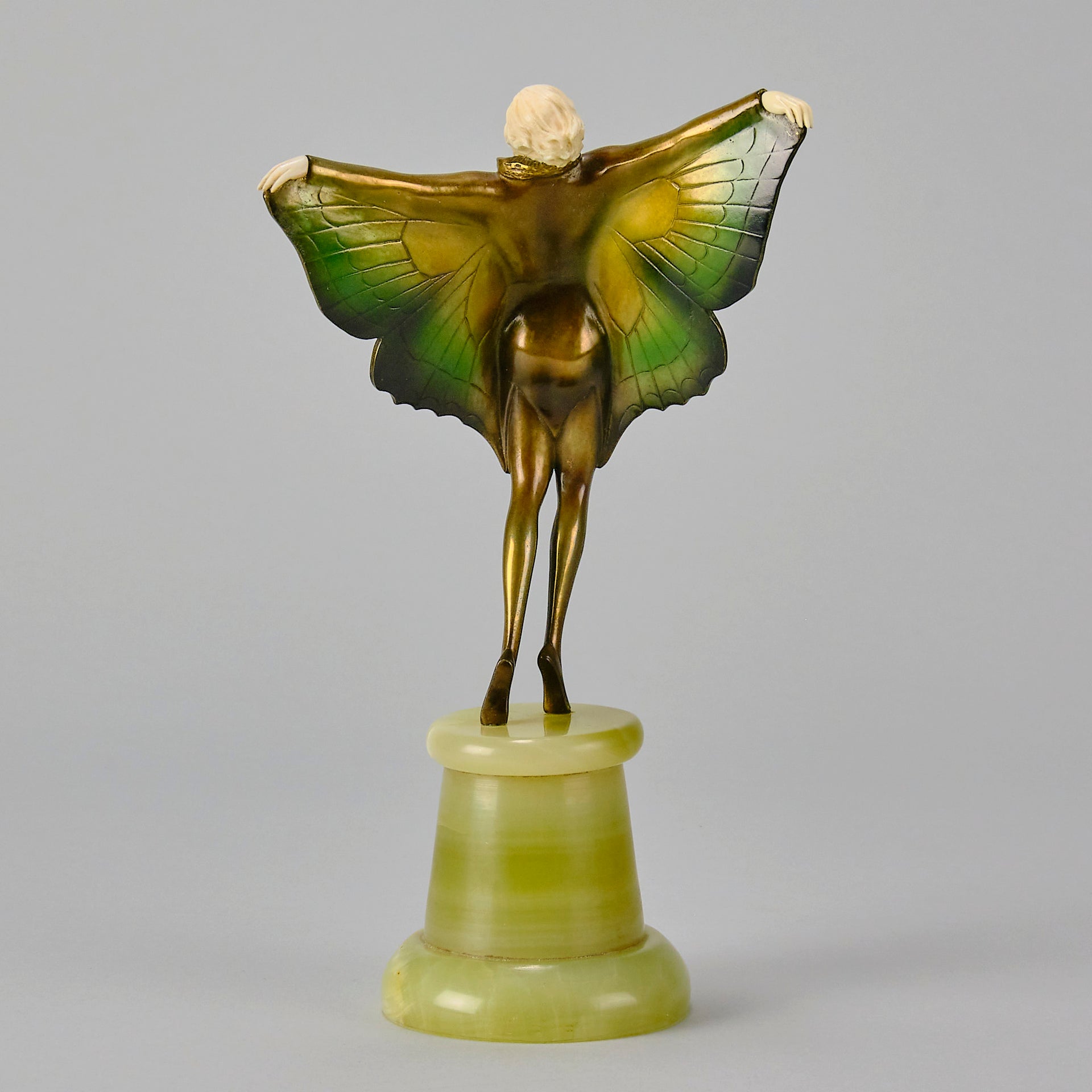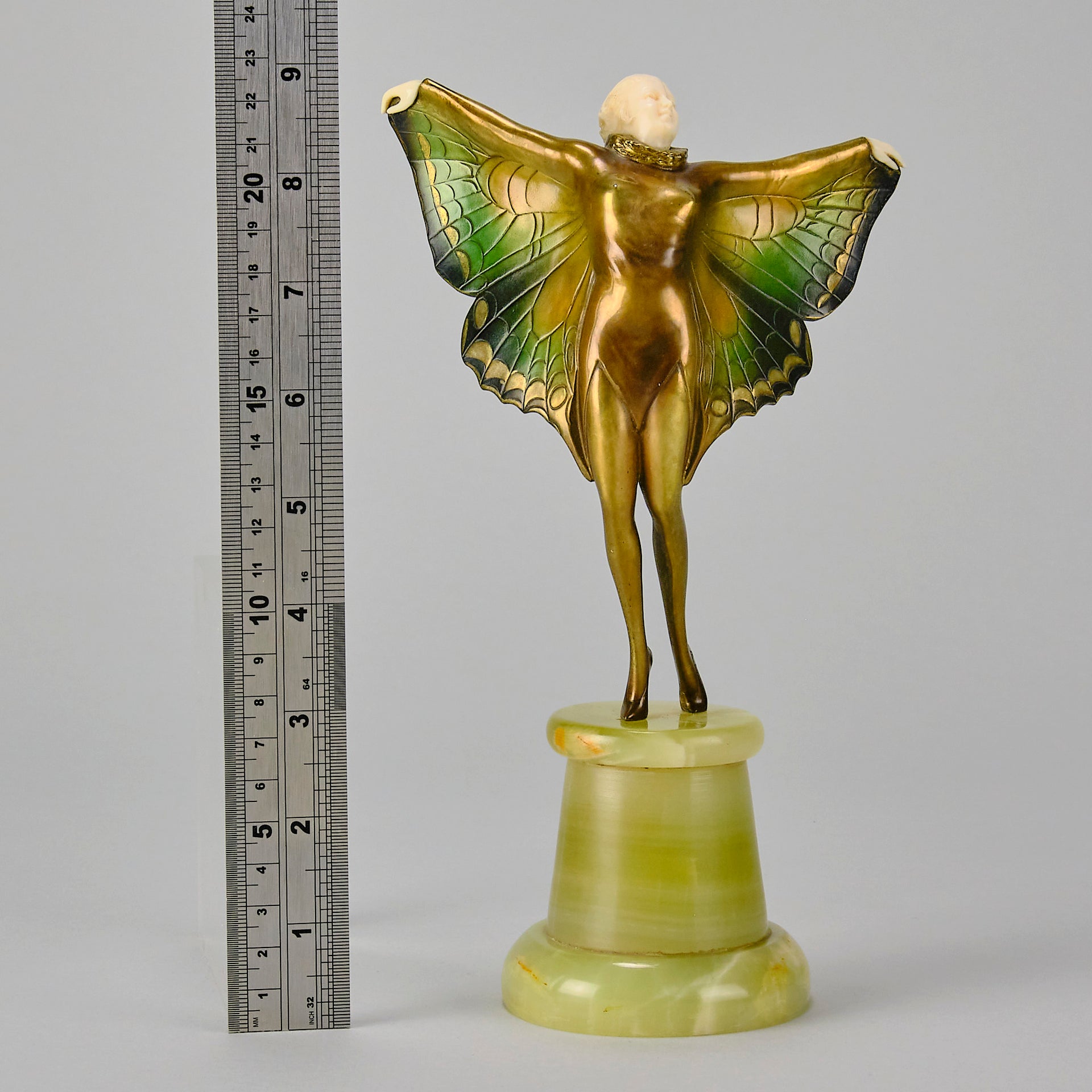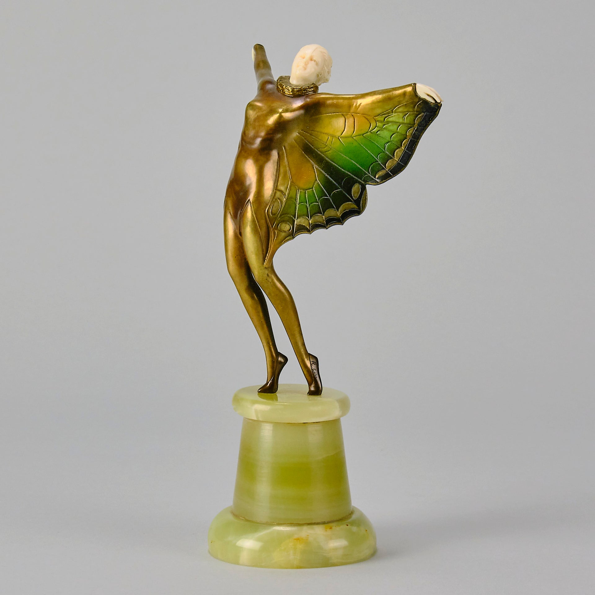 An enchanting early 20th Century Art Deco cold painted bronze and hand carved ivory figure of a young beauty dressed in a flamboyant costume, her arms outstretched showing her wonderful wings. The fine bronze exhibitng excellent colours and fine hand finished detail, raised on a shaped onyx plinth and signed R Lor