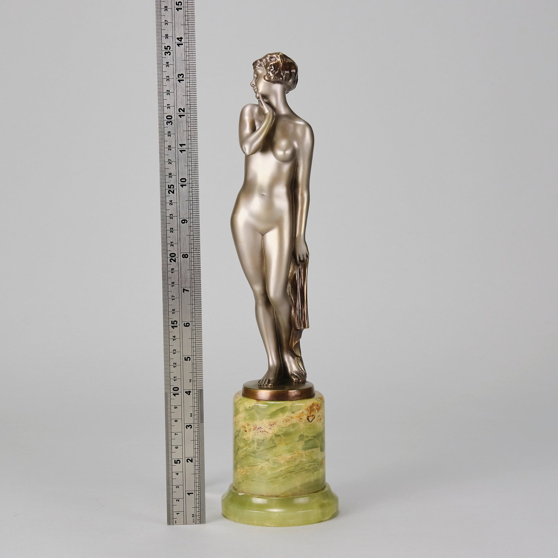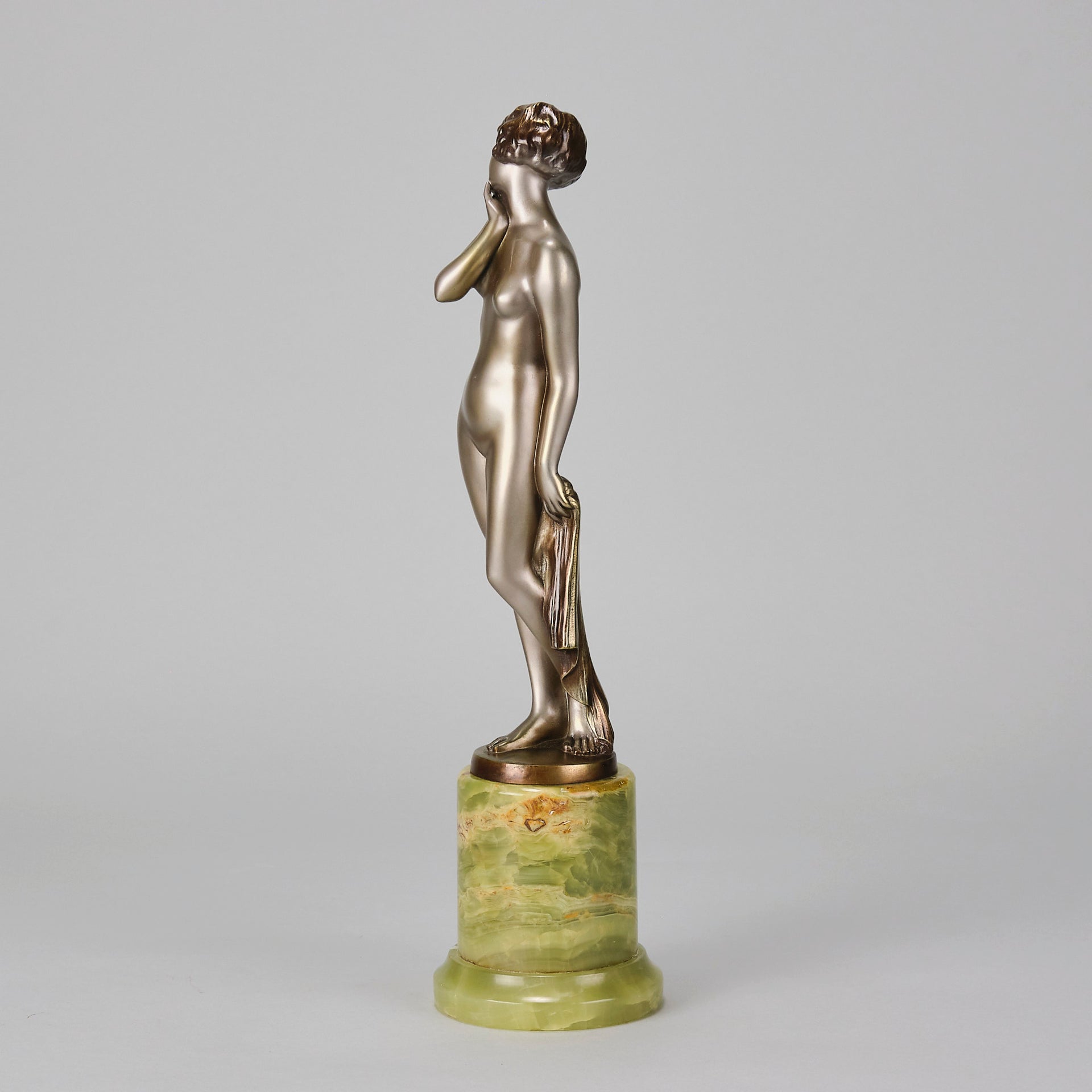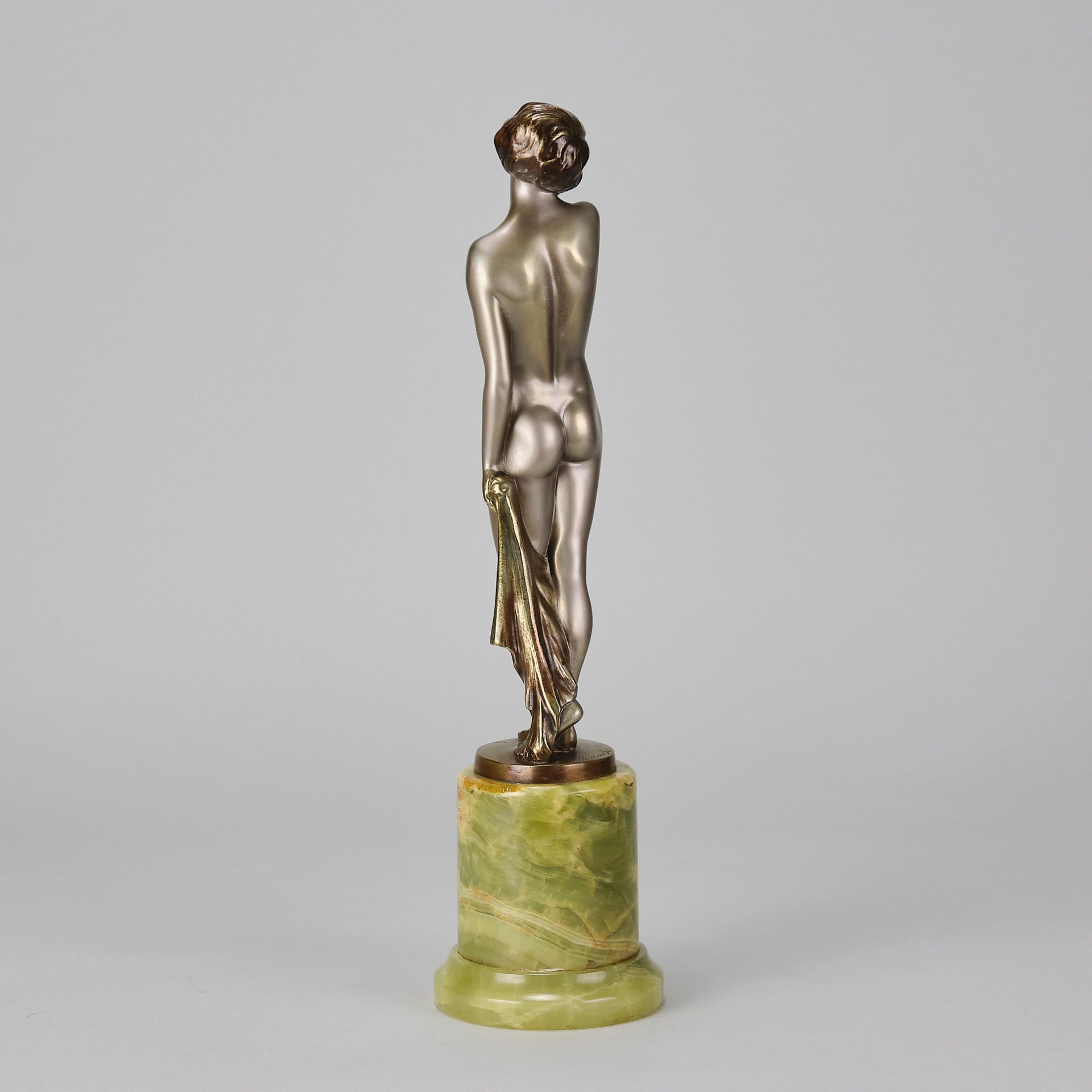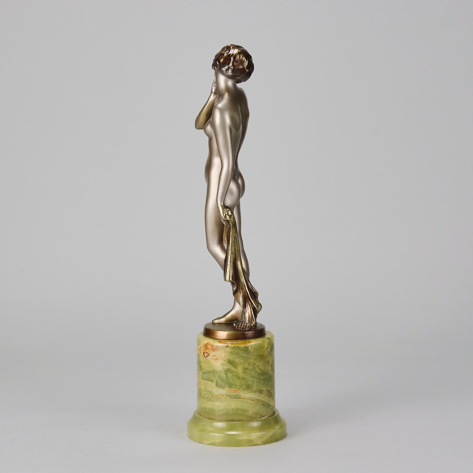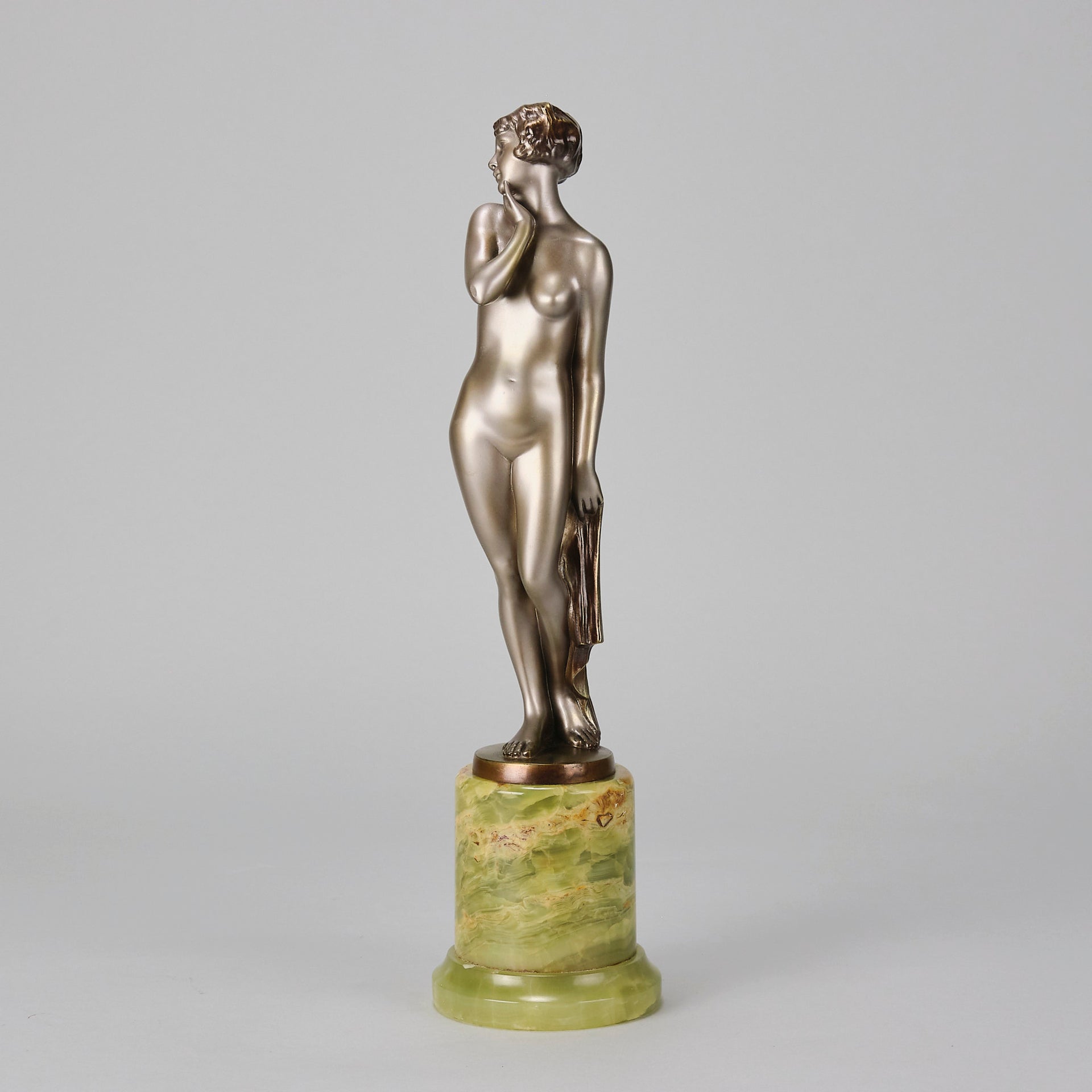An elegant early 20th Century Art Deco cold painted bronze figure of a naked beauty standing in a coy pose with excellent colours and fine hand finished detail, raised on a shaped onyx plinth and signed Lor
