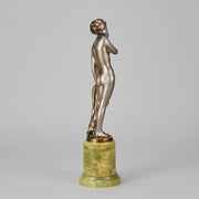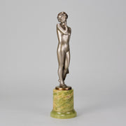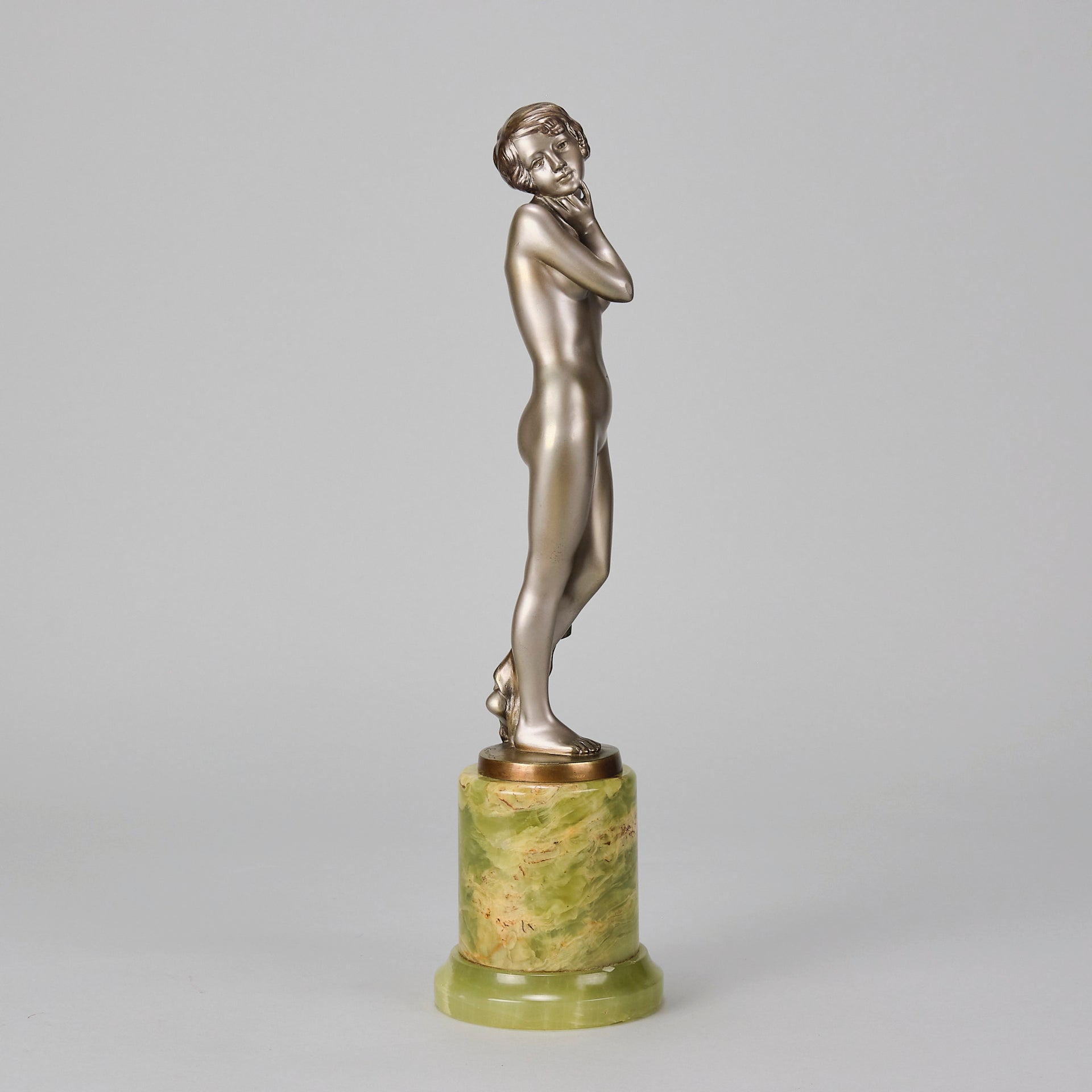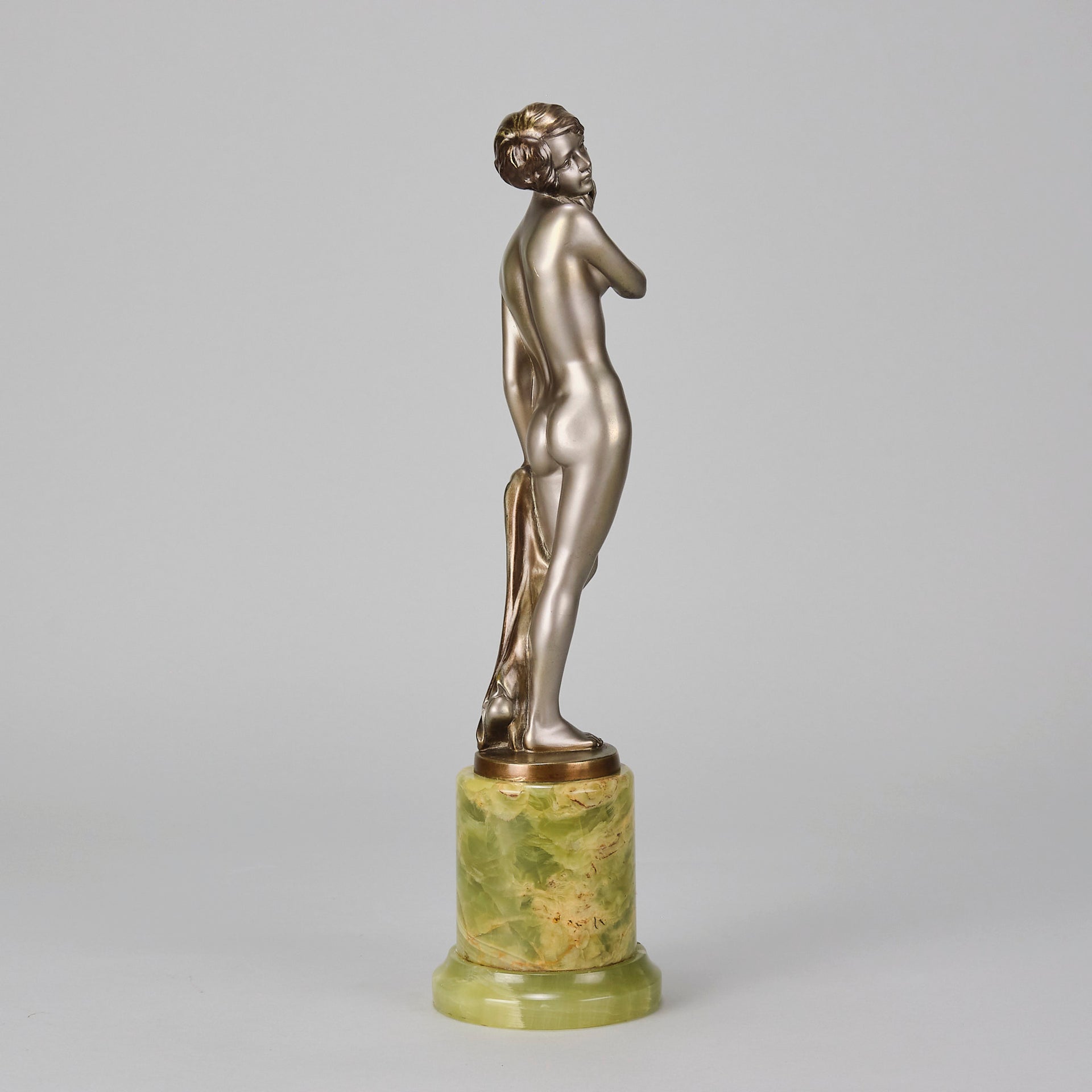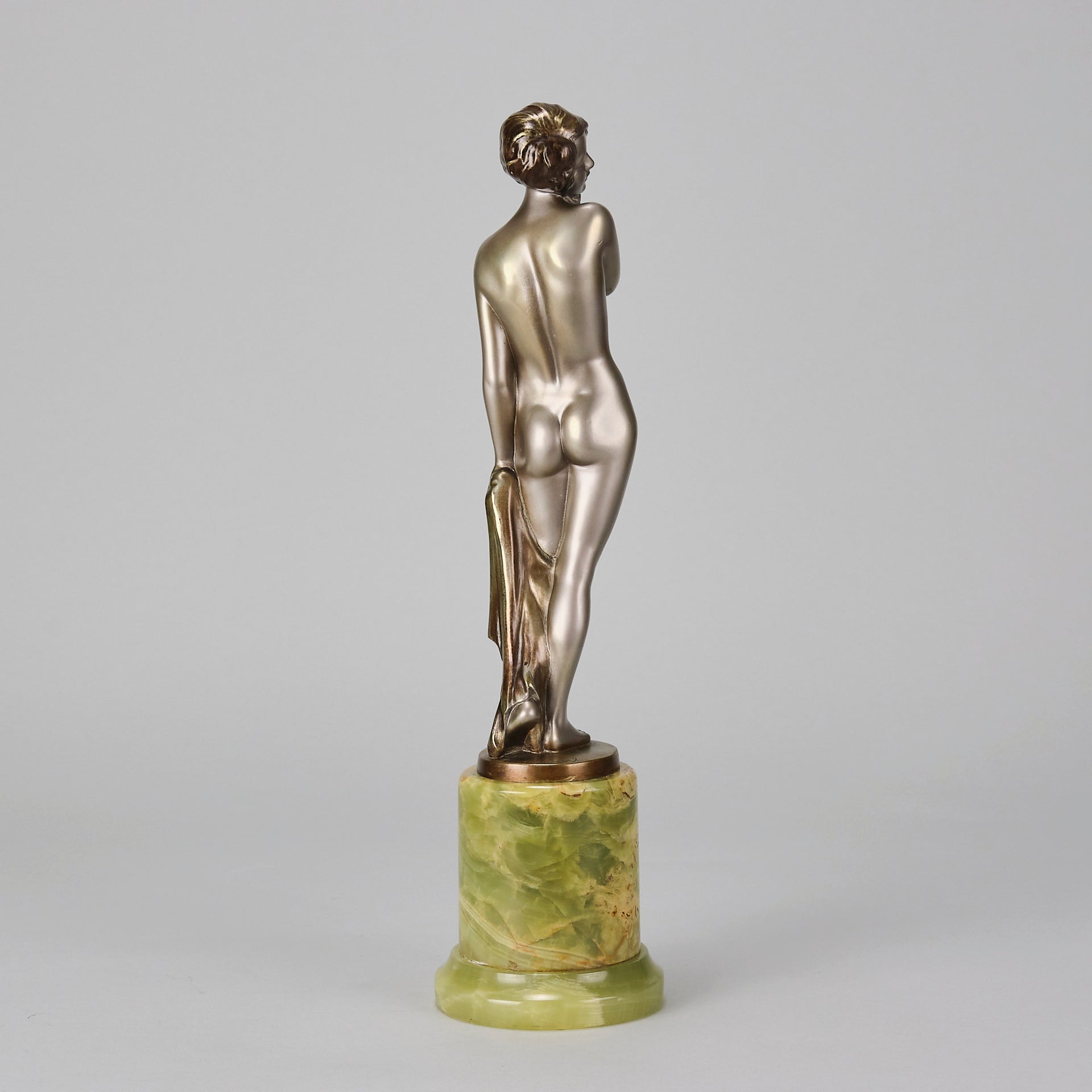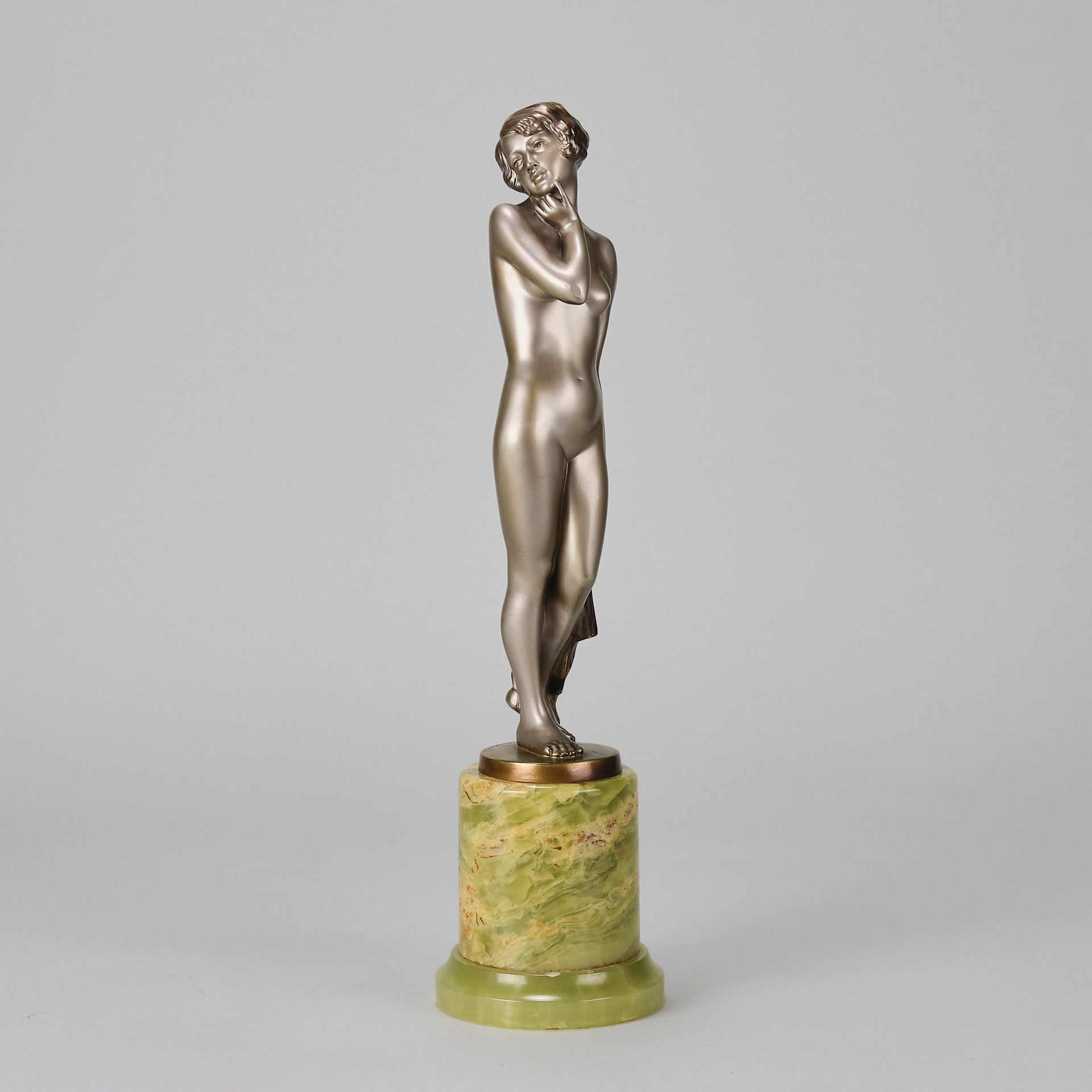 An elegant early 20th Century Art Deco cold painted bronze figure of a naked beauty standing in a coy pose with excellent colours and fine hand finished detail, raised on a shaped onyx plinth and signed Lor