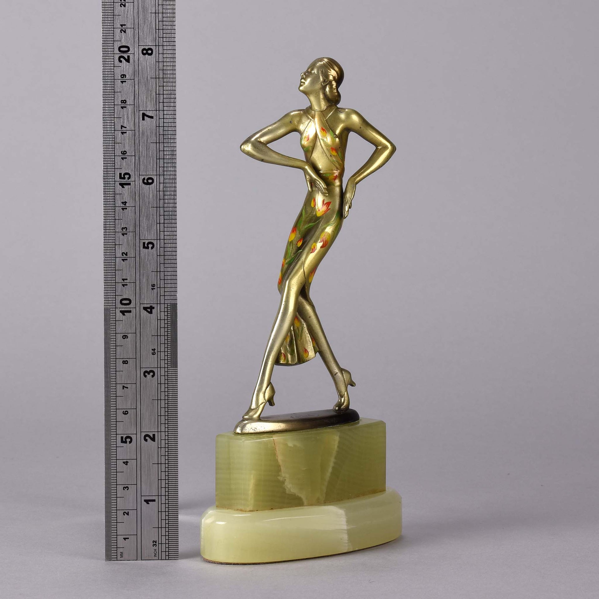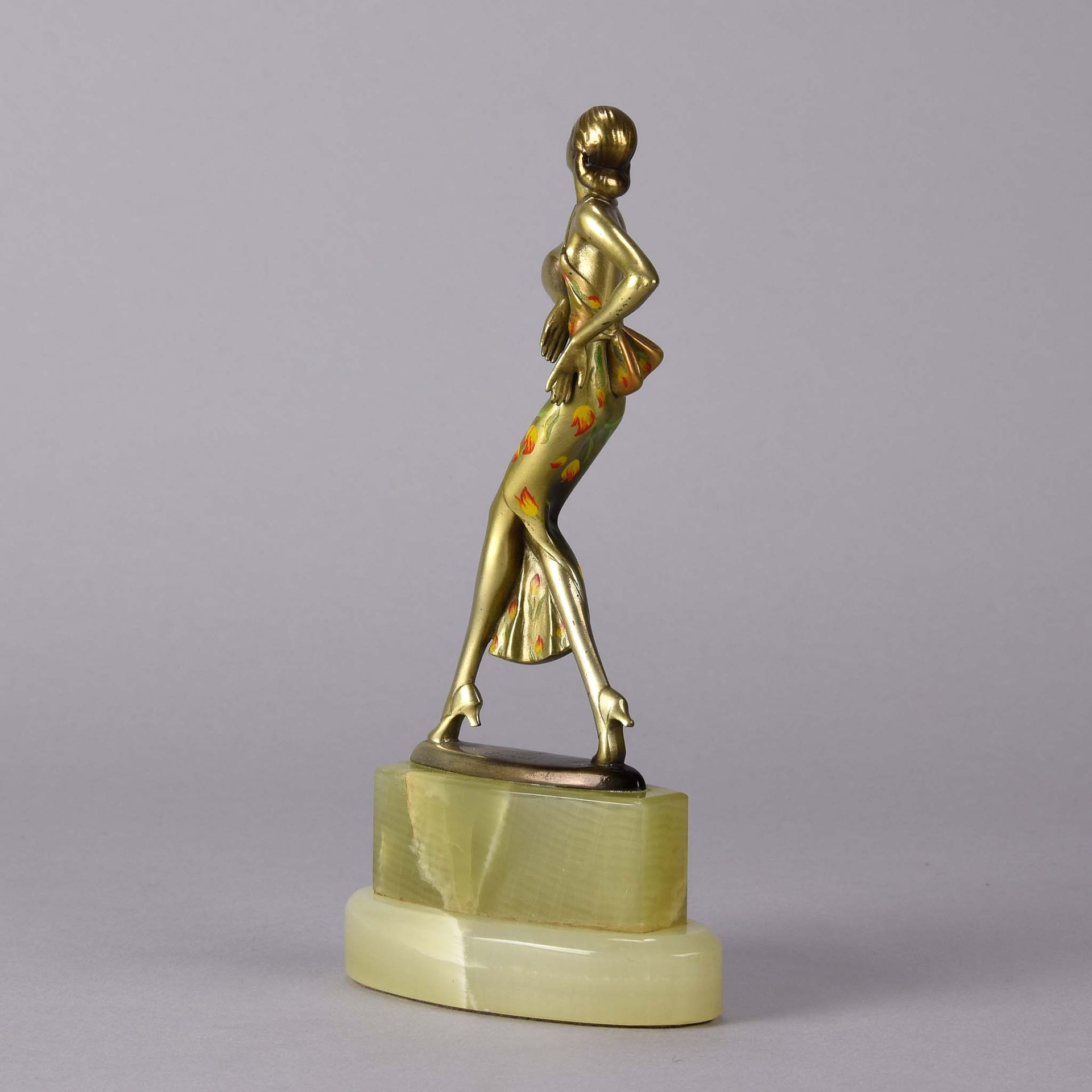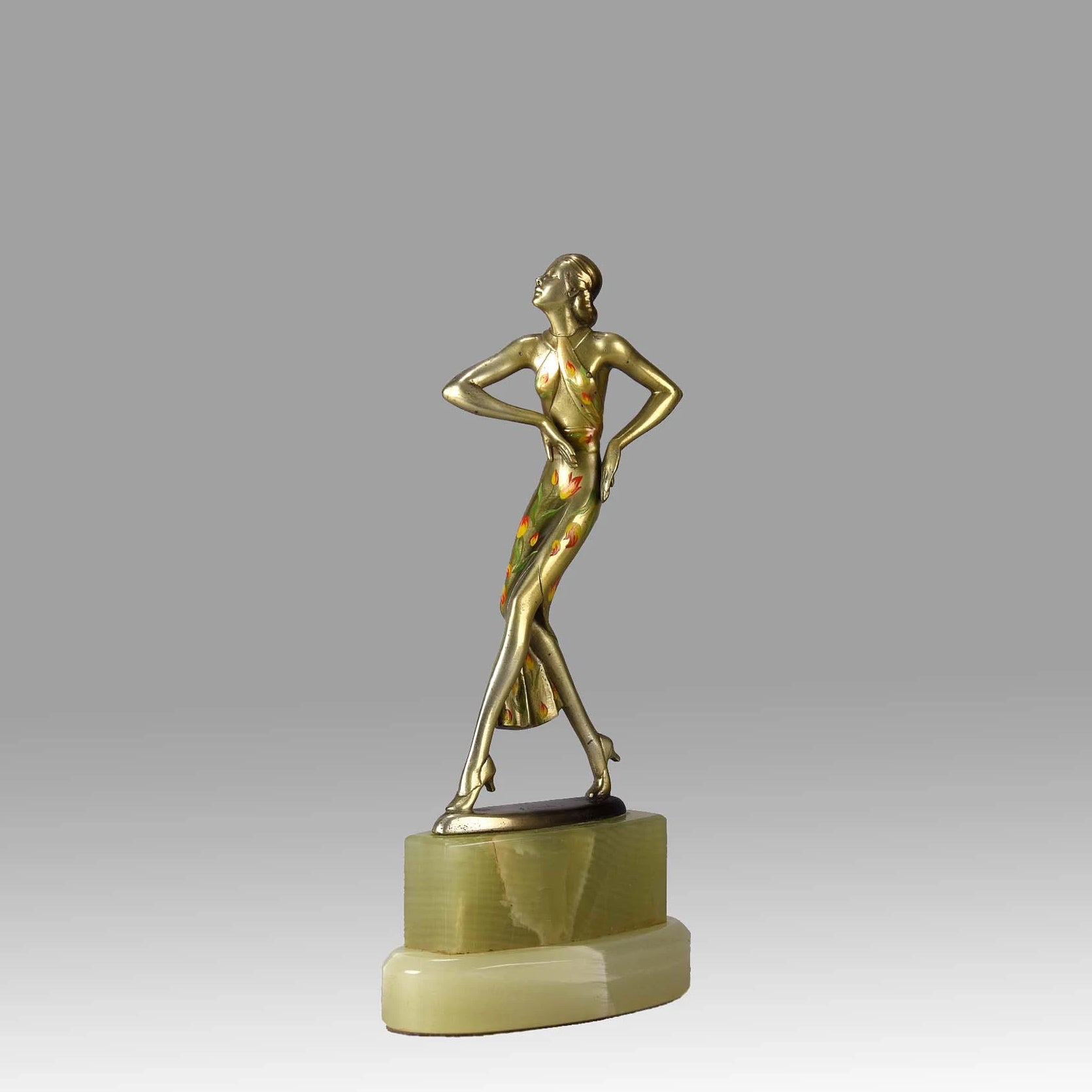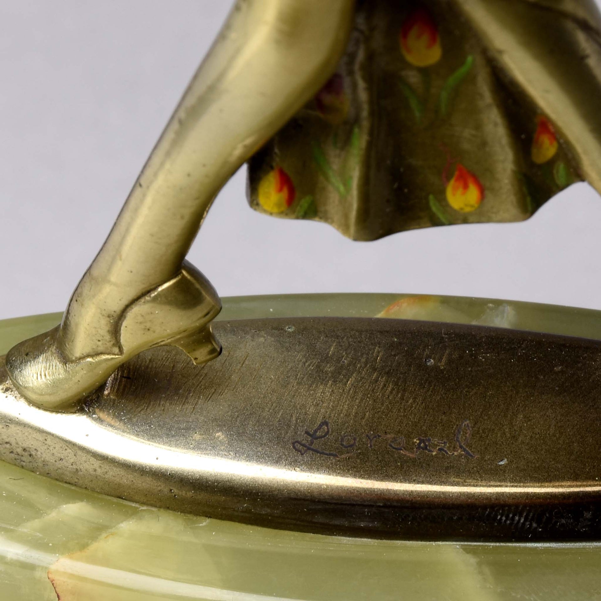 Very pretty early 20th Century Austrian Art Deco cold painted bronze figure of a beautiful young dancer in animated pose, with very fine colour and detail, highlighted with enamel floral decoration to her dress. Raised on a stepped green onyx base, signed Lorenzl