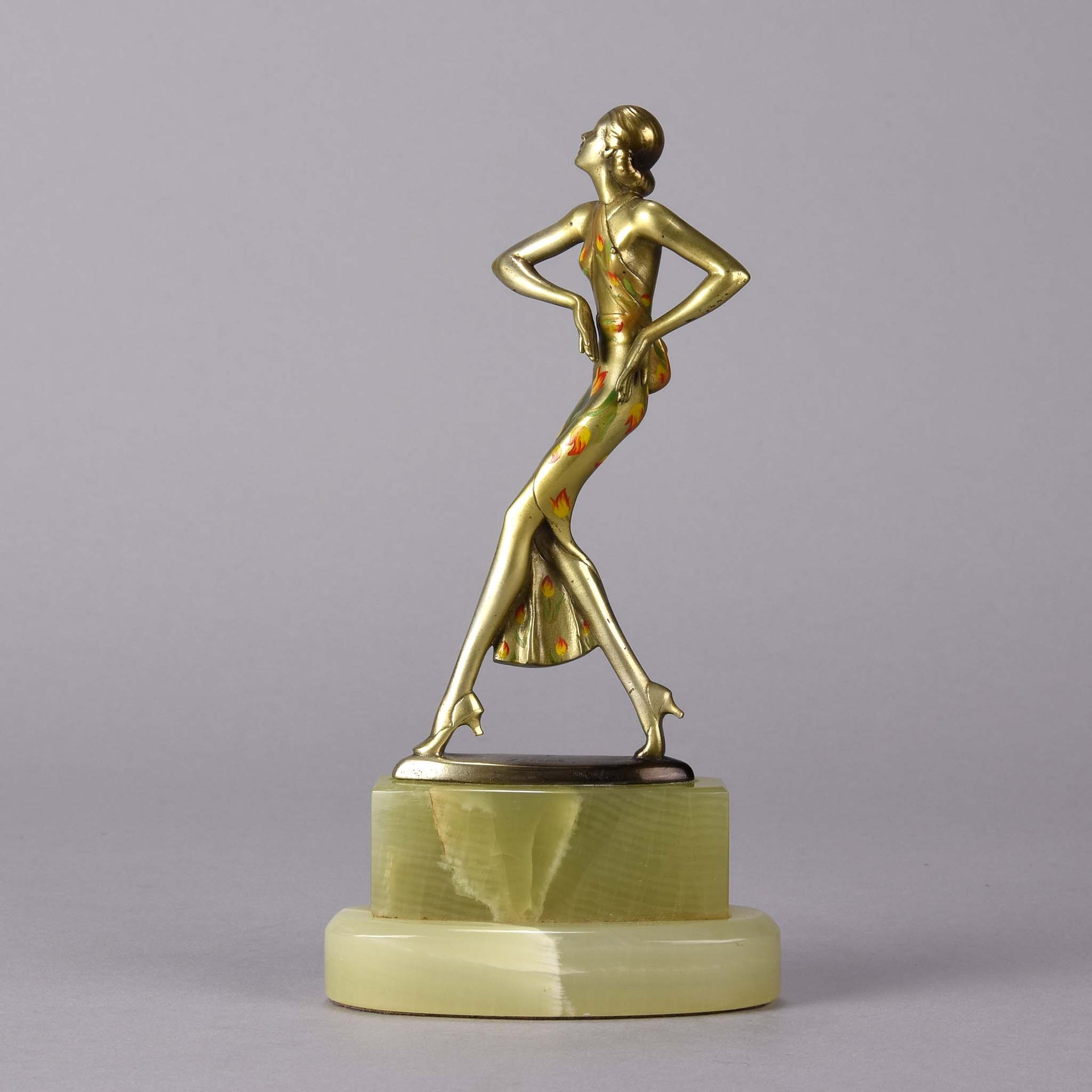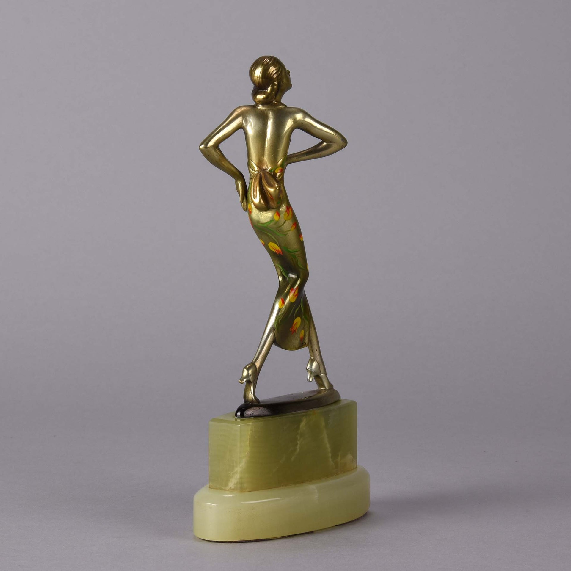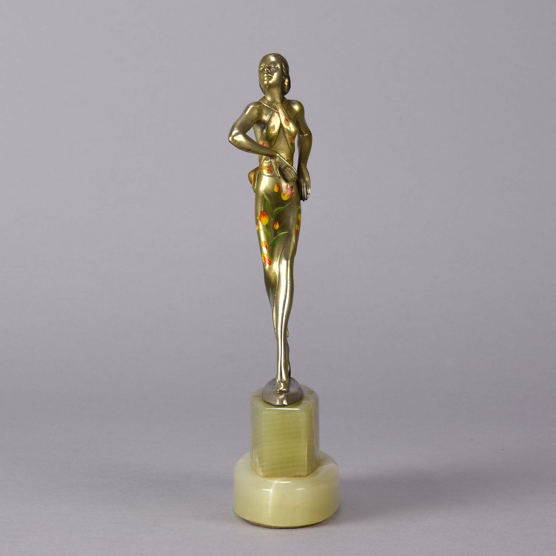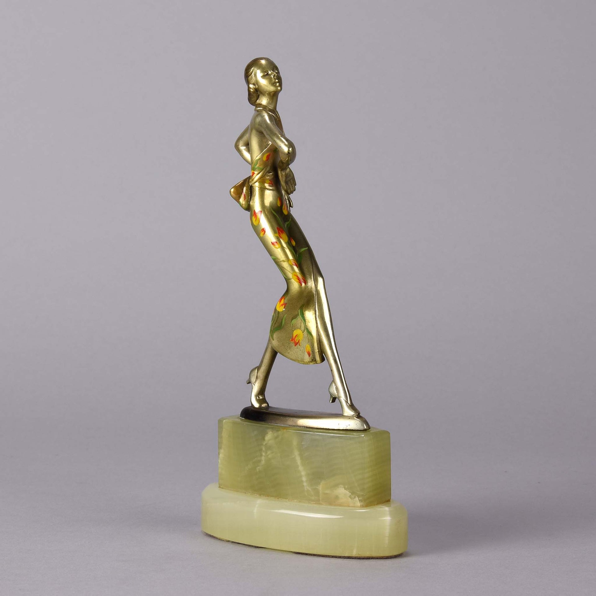 Very pretty early 20th Century Austrian Art Deco cold painted bronze figure of a beautiful young dancer in animated pose, with very fine colour and detail, highlighted with enamel floral decoration to her dress. Raised on a stepped green onyx base, signed Lorenzl