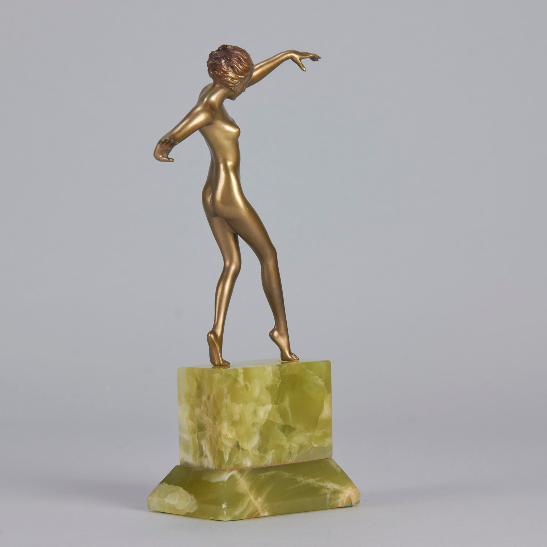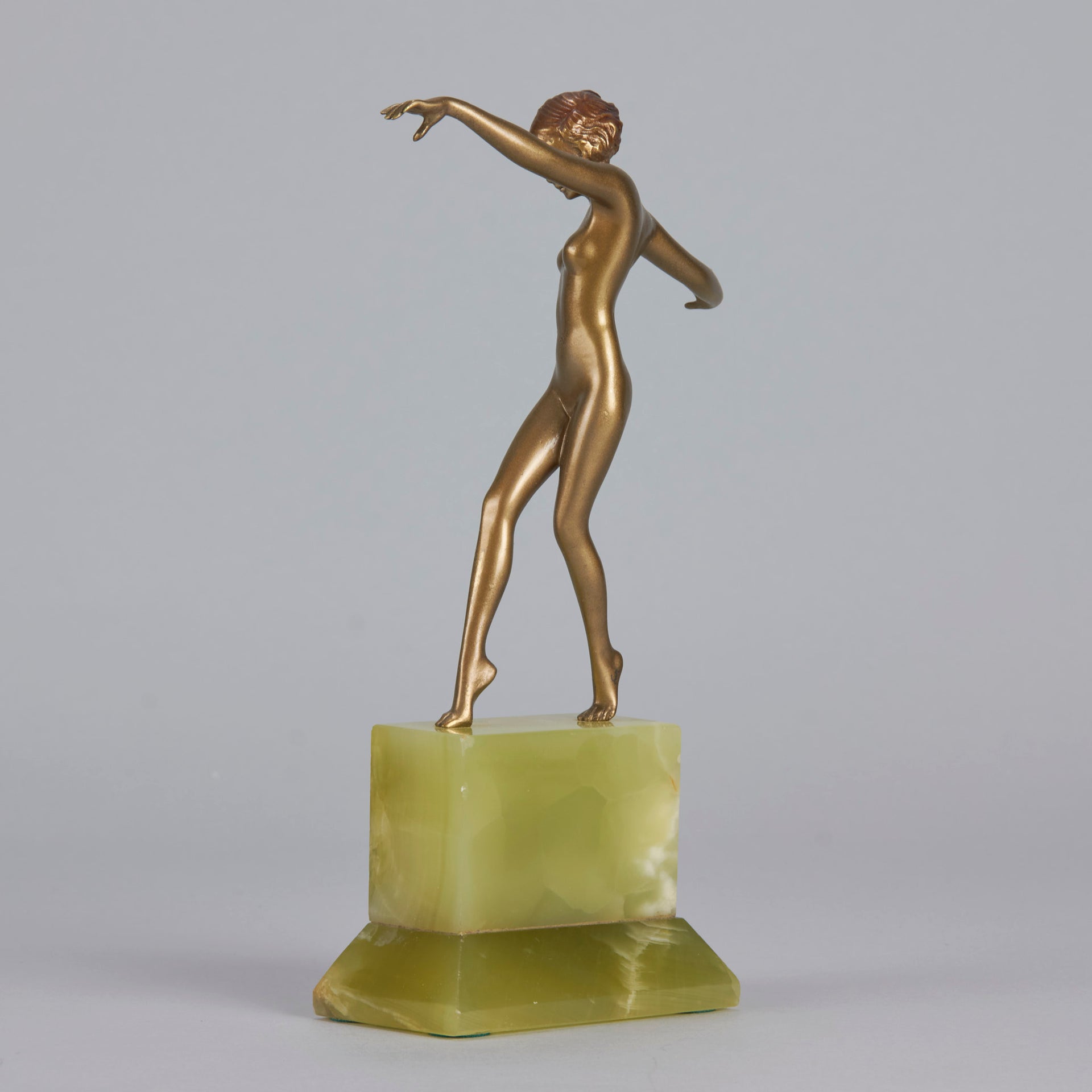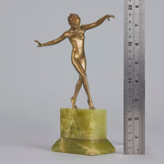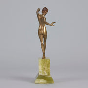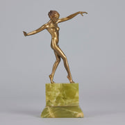 An eye catching early 20th Century cold painted bronze figure of an Art Deco dancer standing on one leg holding a striking pose. The bronze with excellent colour and fine hand finished detail, raised on a shaped Brazilian onyx base and signed Renz