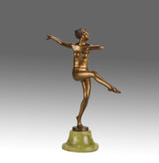 Although very little is known about Lorenzl’s early life, he was born in Austria in 1892 and became one of the most talented sculptors of the Art Deco Period. He started by working for a bronze foundry in Vienna Arsenal where he produced stunning Art Deco bronze statuettes. The majority of his works in bronze and chryselephantine were of singular slim female nudes with long legs which conveyed elegance. His preference was for dancing poses which were not only evident in his singular statuettes but also in those attached to marble clocks, lamp bases and bookends.