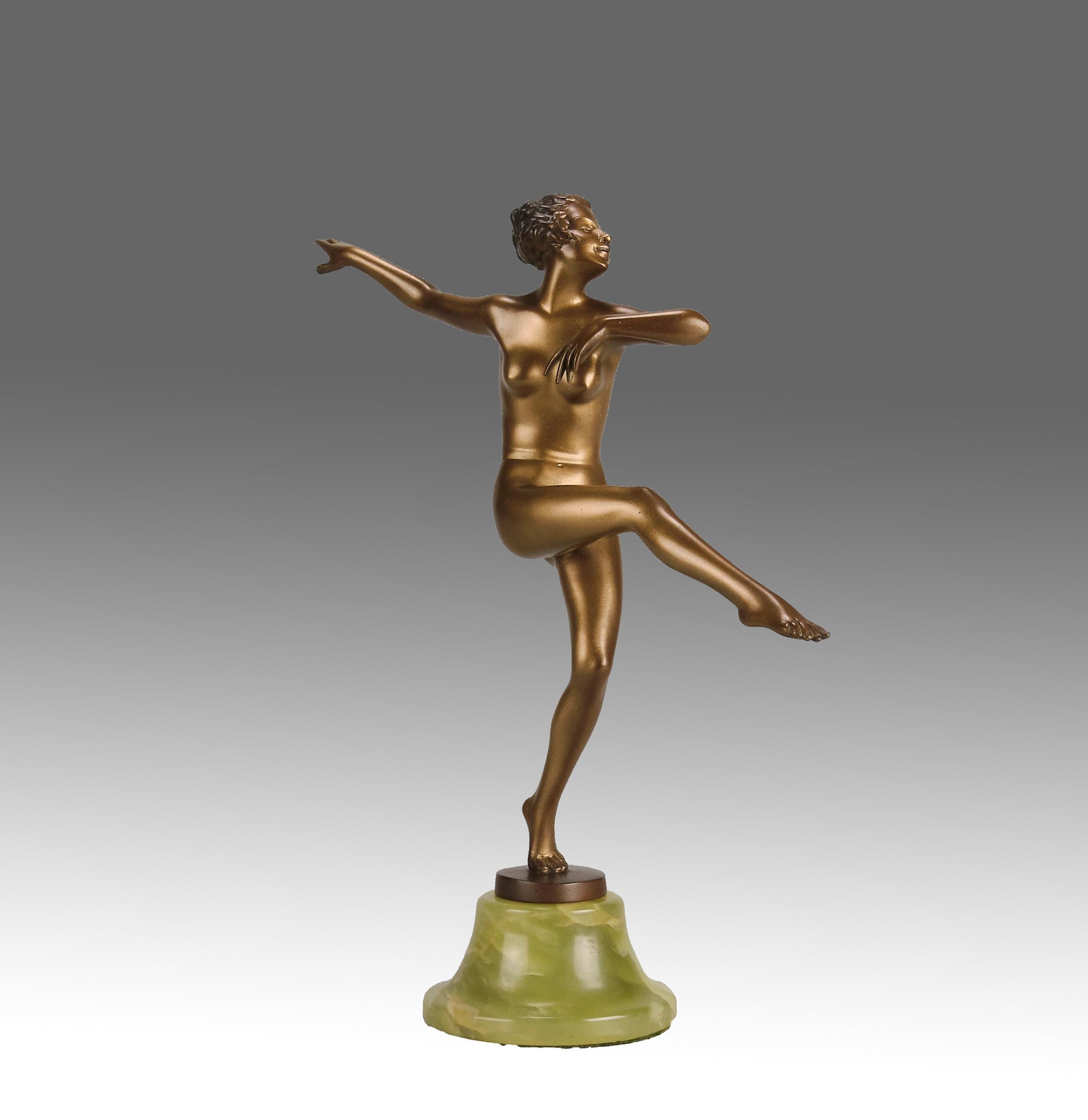 A striking early 20th Century Art Deco cold painted bronze figure of a female dancer in full swing. The piece has excellent colour and fine hand finished detail, raised on a green onyx base. Signed Lorenzl & stamped Made In Austria