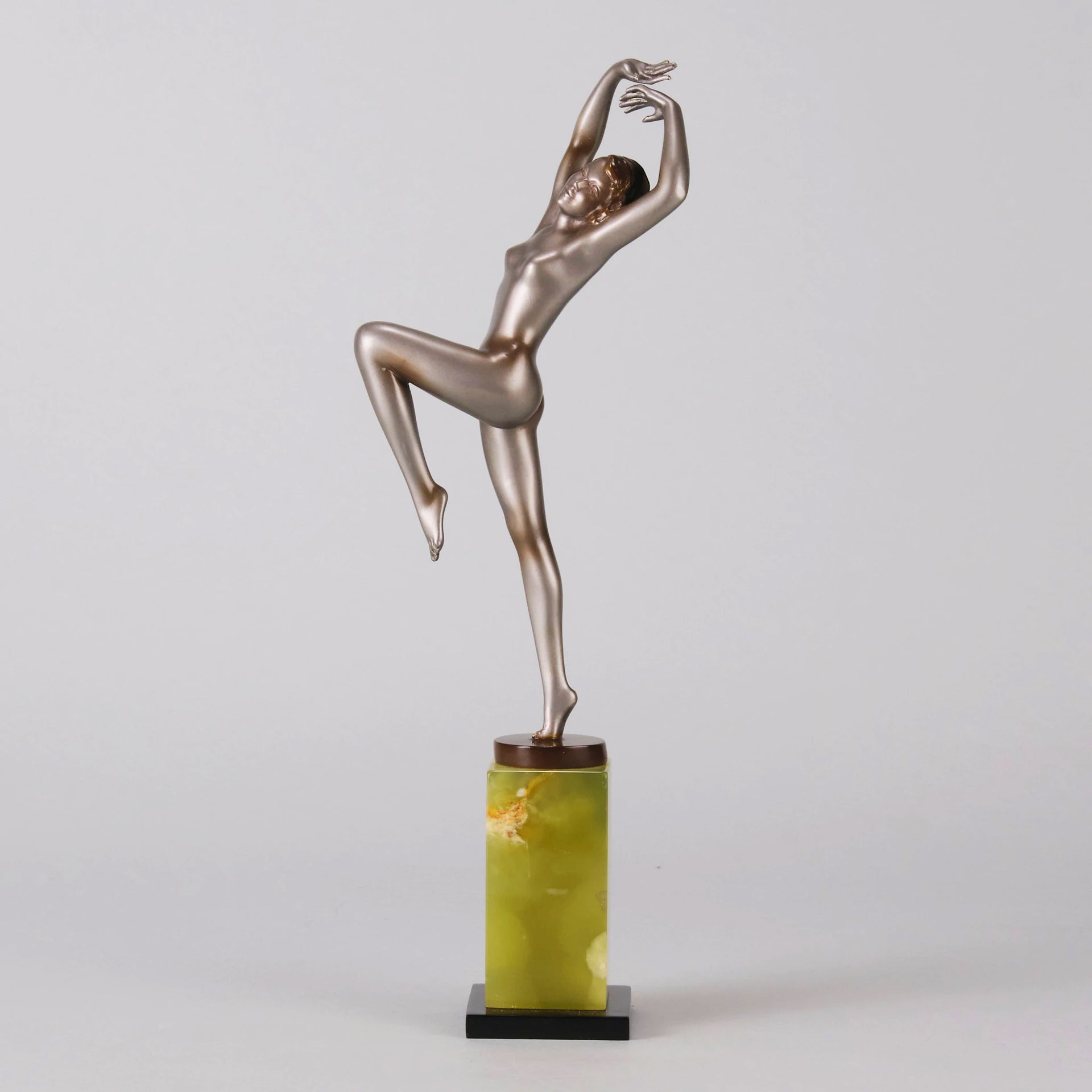 Although very little is known about Lorenzl’s early life we are aware that he was born in Austria in 1892 and was soon to become one of the most talented sculptors of the Art Deco Period. He started by working for a bronze foundry in Vienna Arsenal where he produced stunning Art Deco bronze statuettes. The majority of his works in bronze and ivory were of singular slim female nudes with long legs which conveyed elegance. His preference was for dancing poses which were not only evident in his singular statuettes but also in those attached to marble clocks, lamp bases and bookends.