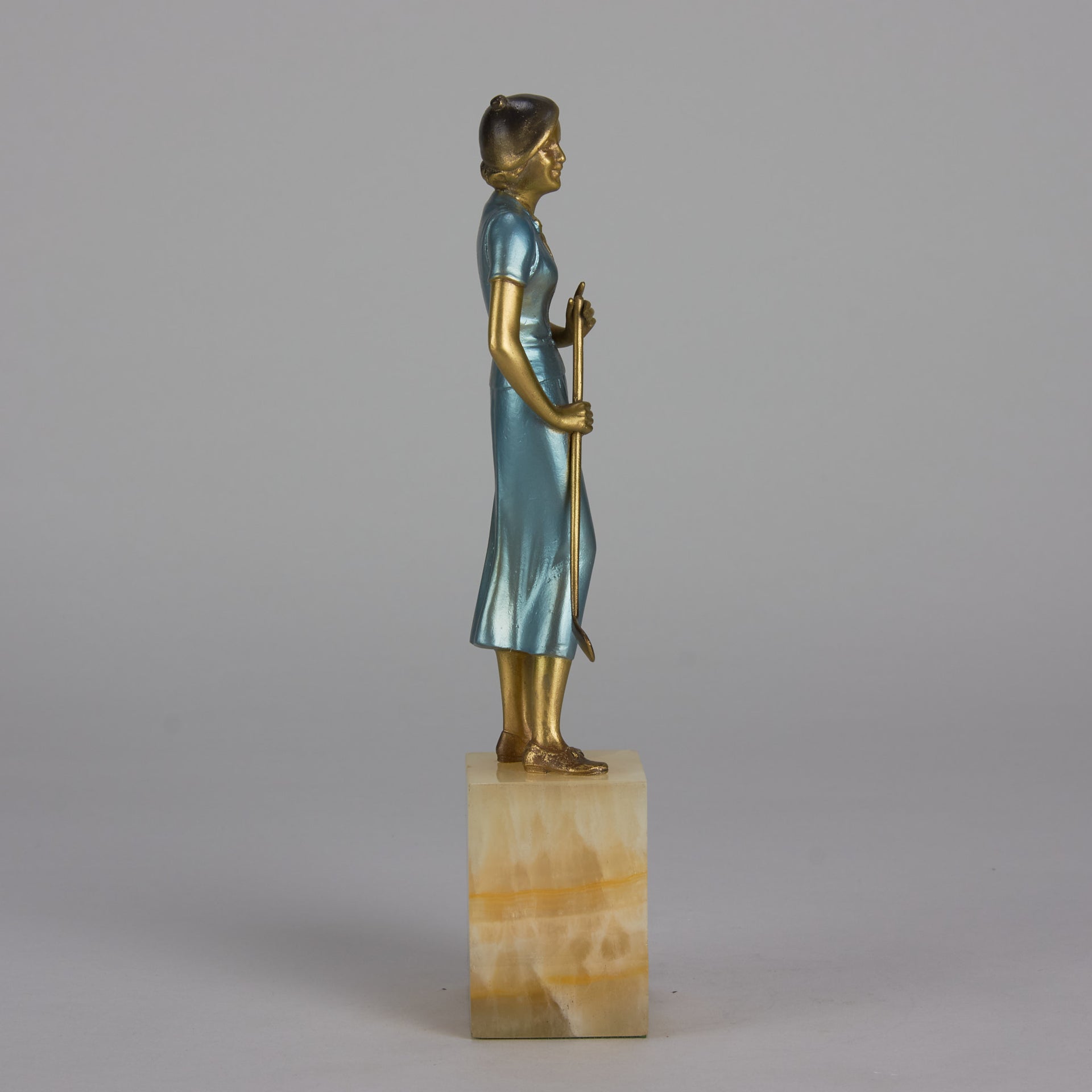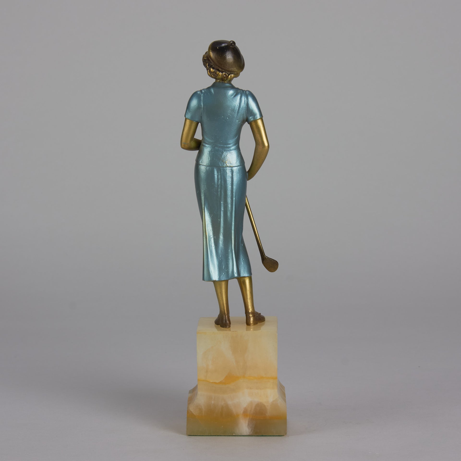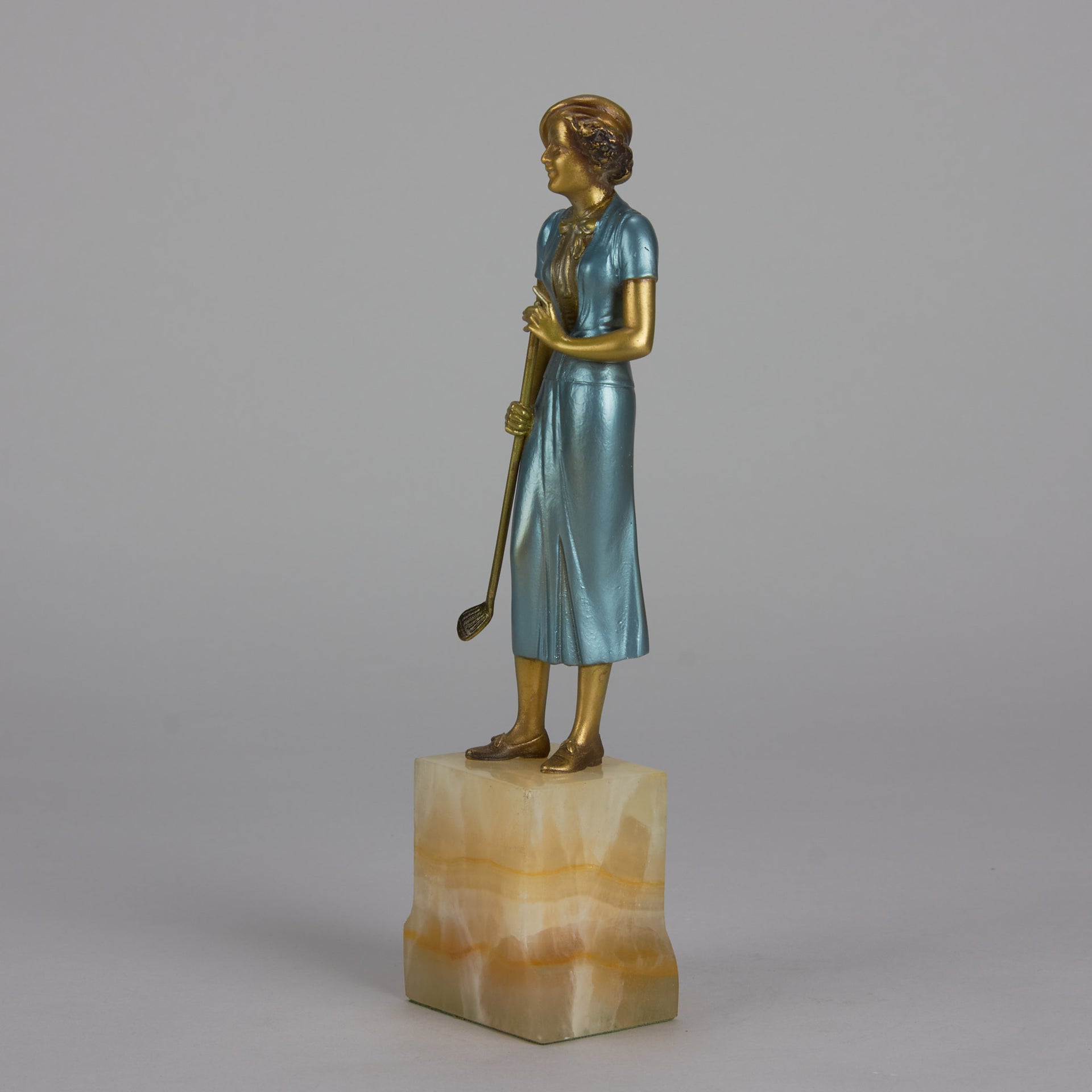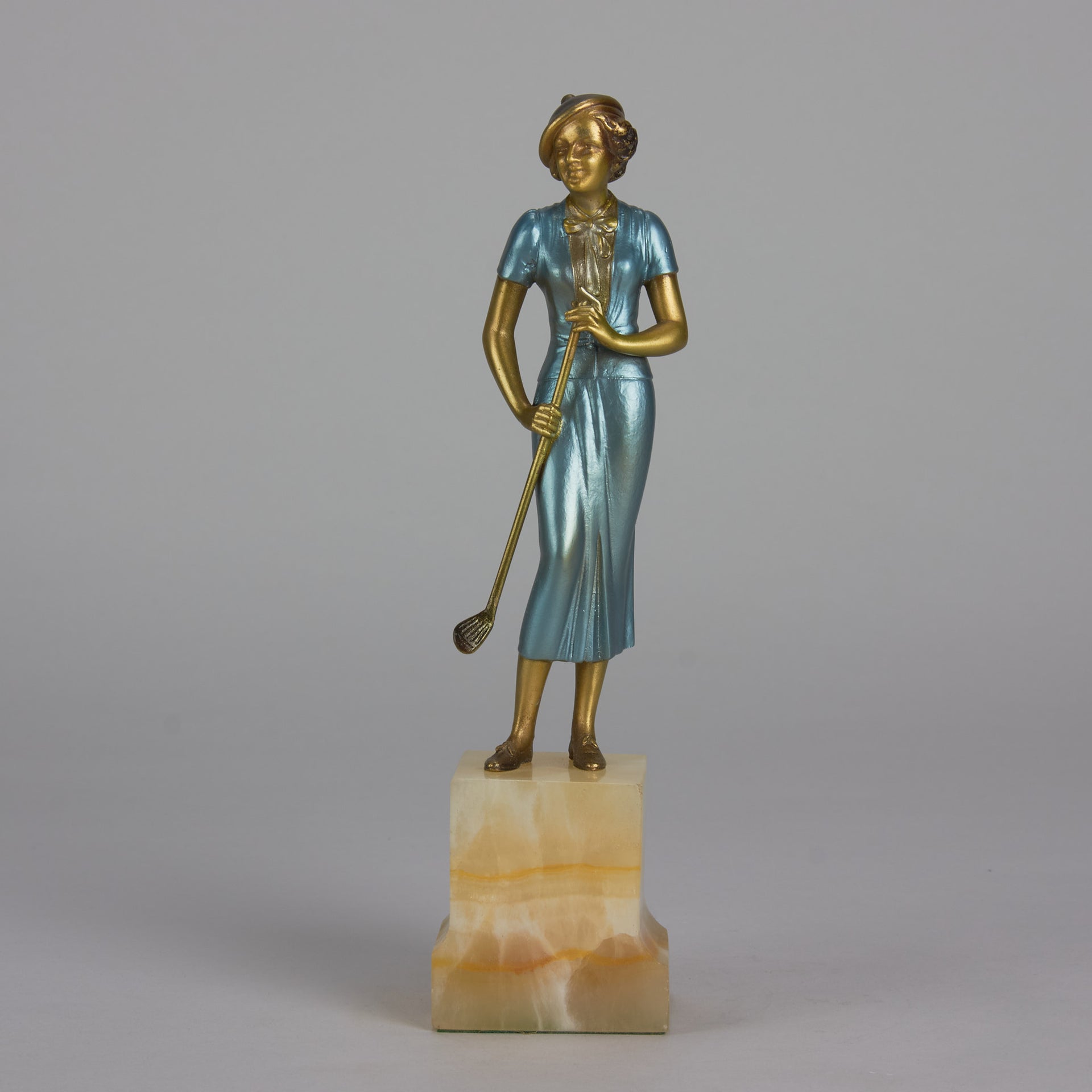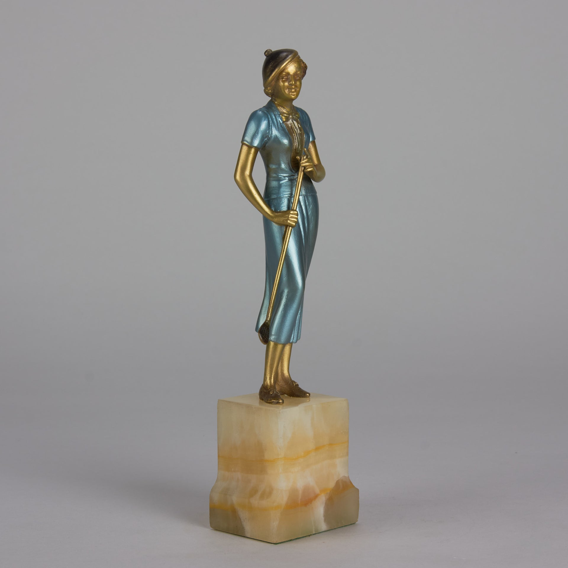 An attractive early 20th Century Austrian Art Deco cold painted enamel bronze figure of a young woman in period attire holding a golf club. The surface of the bronze with excellent metallic blue, gold and brown colours and very fine hand finished detail, raised on a variegated cream onyx base and signed R Lor under her skirt