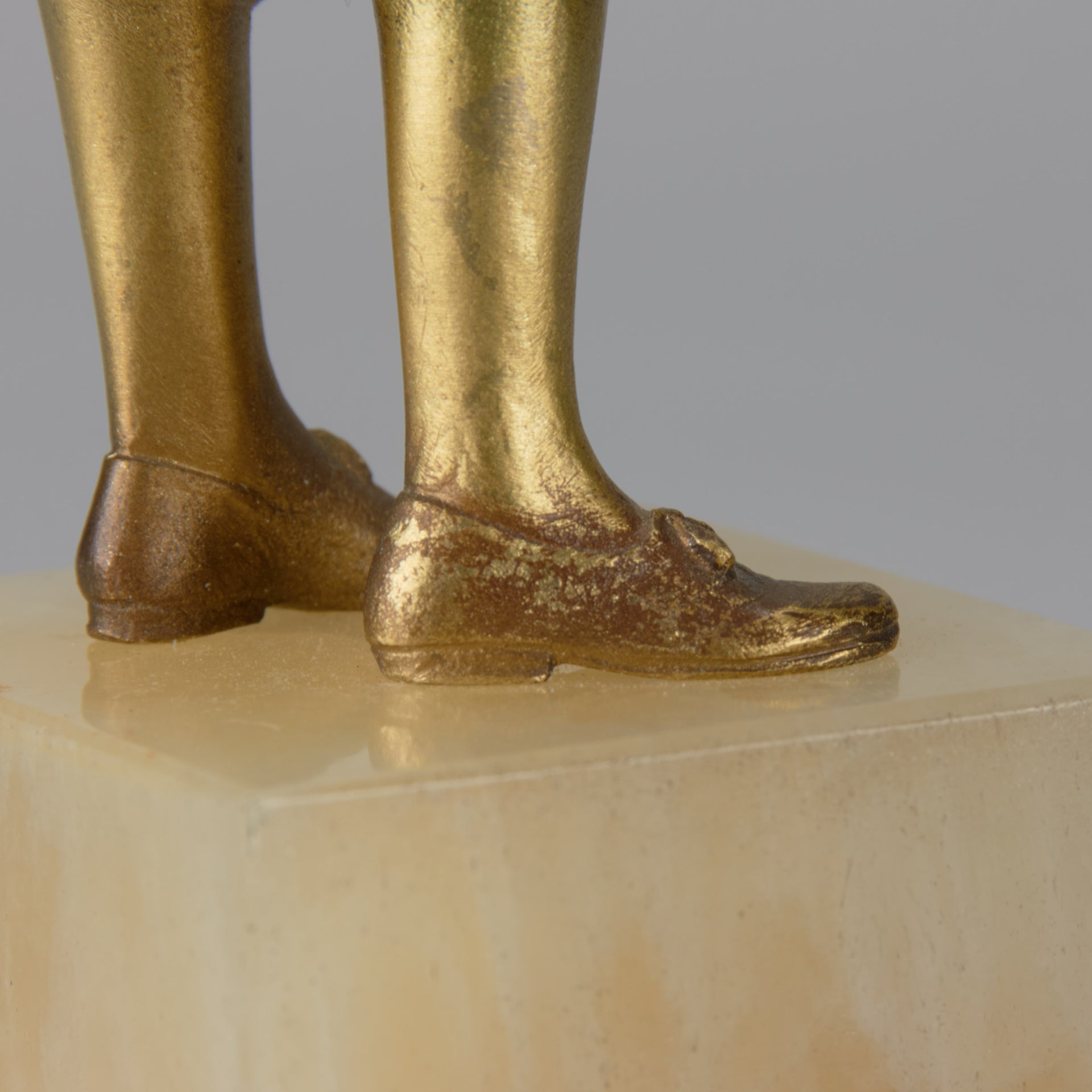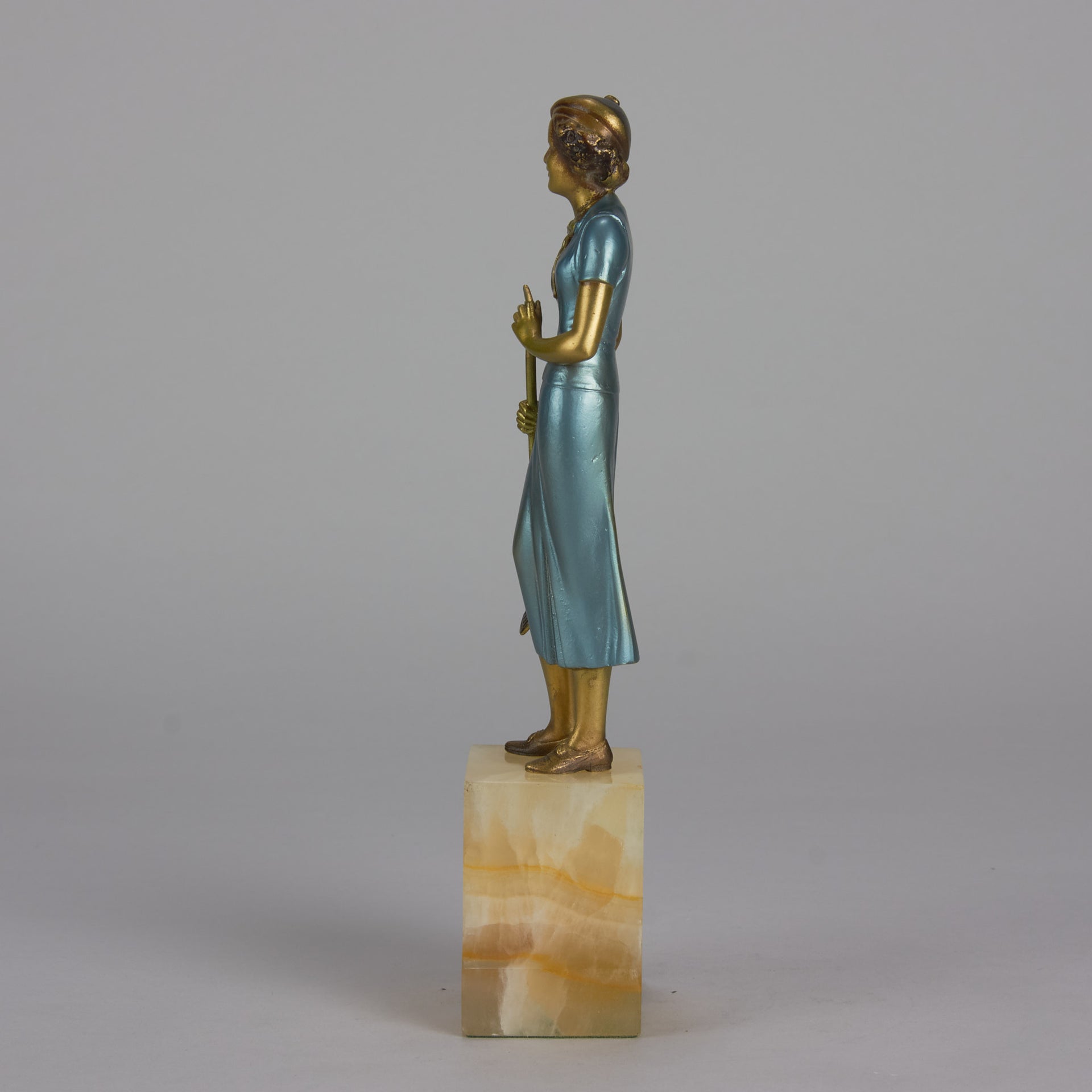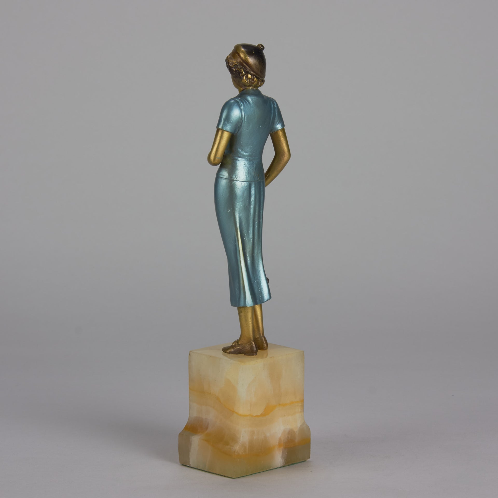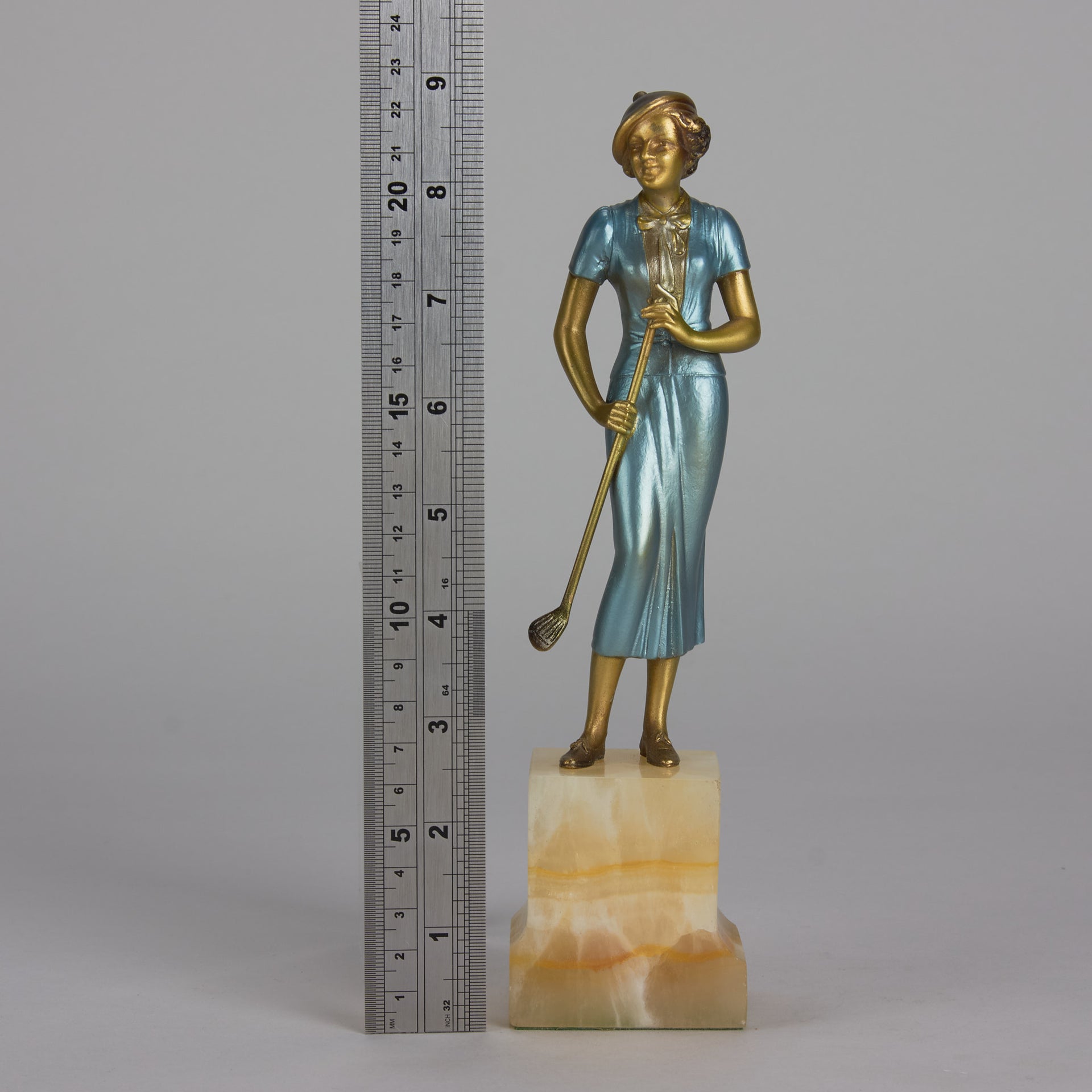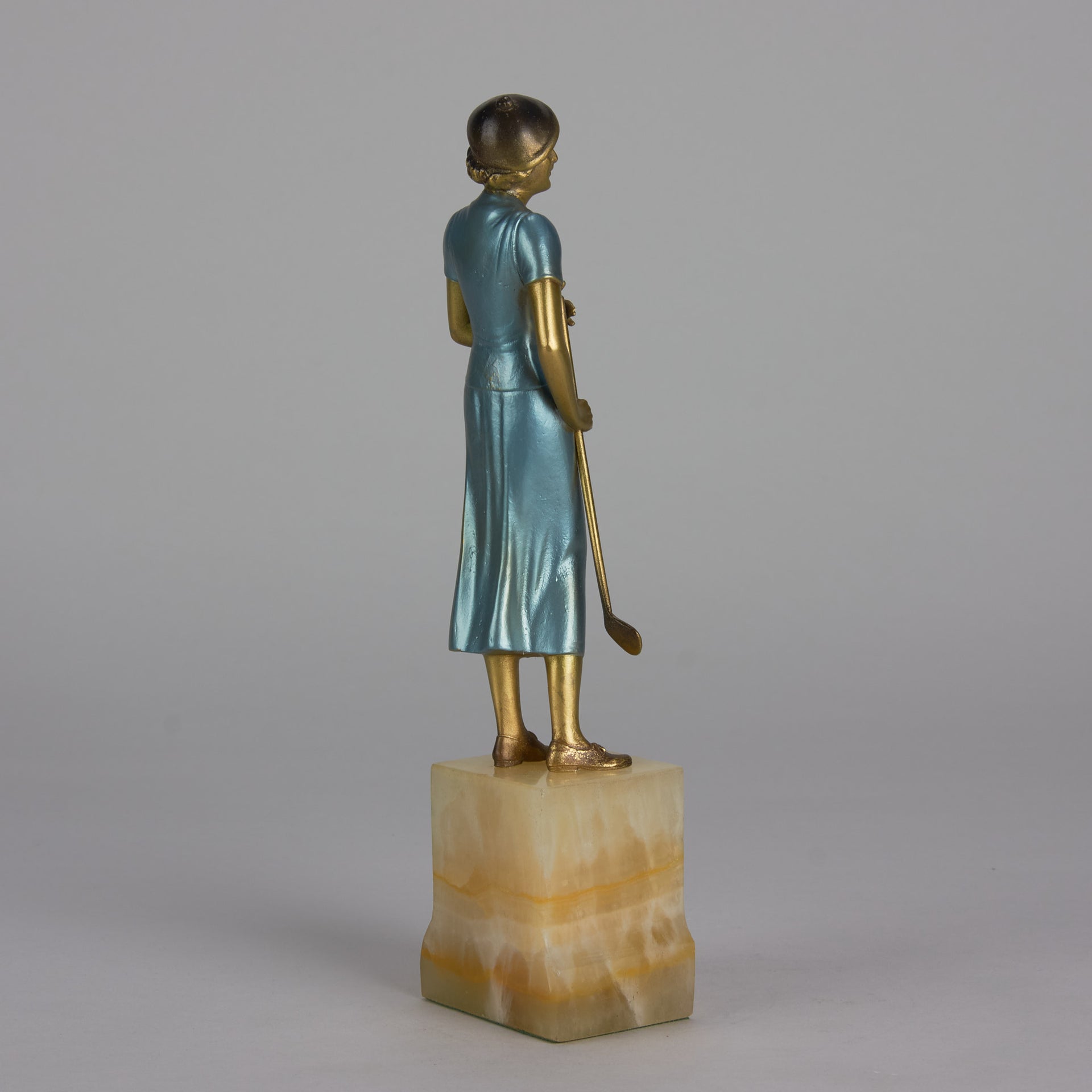 An attractive early 20th Century Austrian Art Deco cold painted enamel bronze figure of a young woman in period attire holding a golf club. The surface of the bronze with excellent metallic blue, gold and brown colours and very fine hand finished detail, raised on a variegated cream onyx base and signed R Lor under her skirt