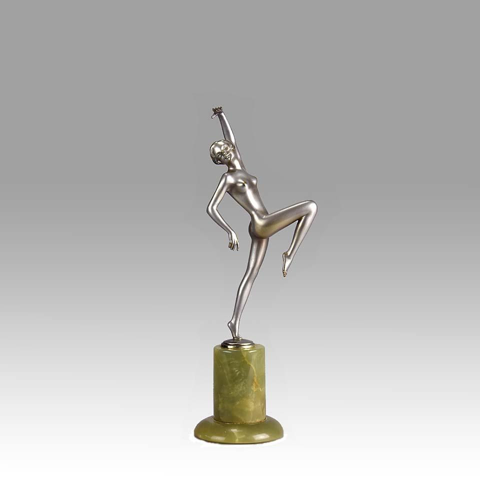 An elegant Art Deco cold painted bronze figurine of a beautiful dancer with her arm and leg raised in an exaggerated pose, exhibiting fine colour and good hand finished detail, raised on a Brazilian green onyx base and signed Lorenzl