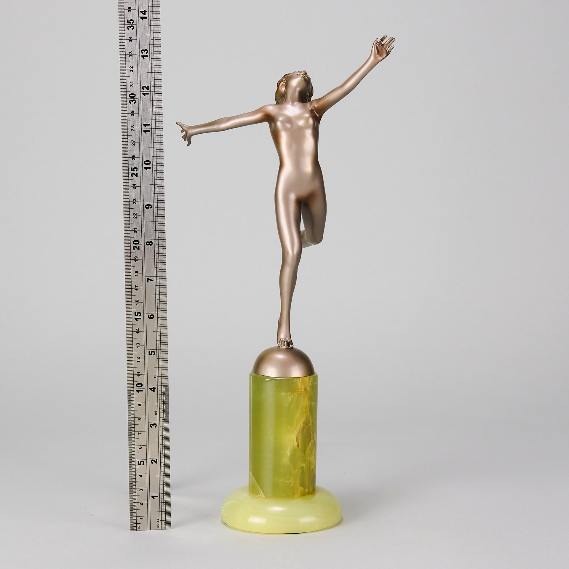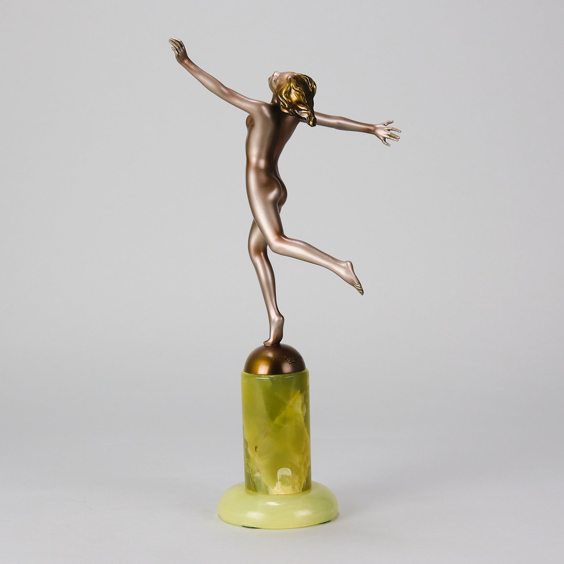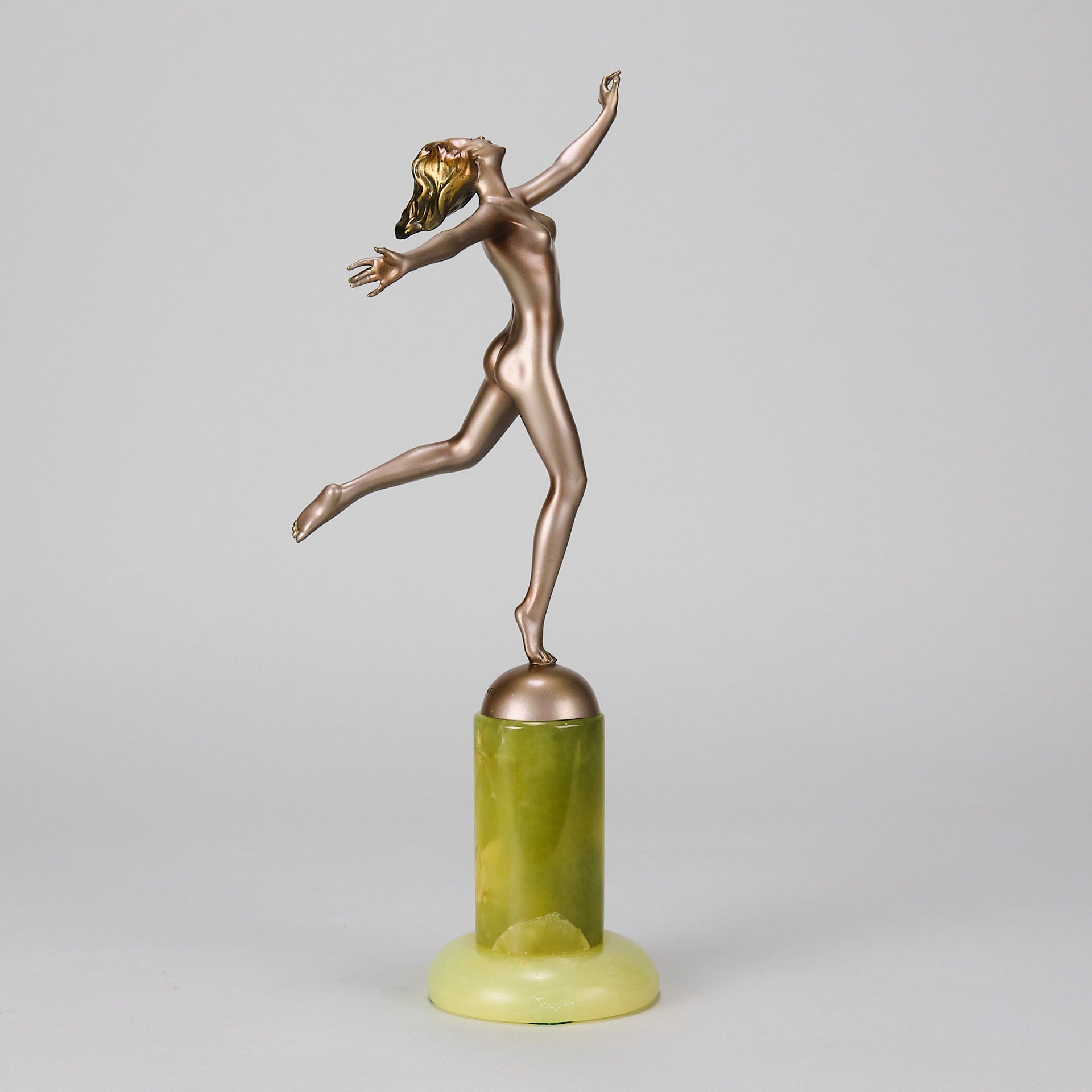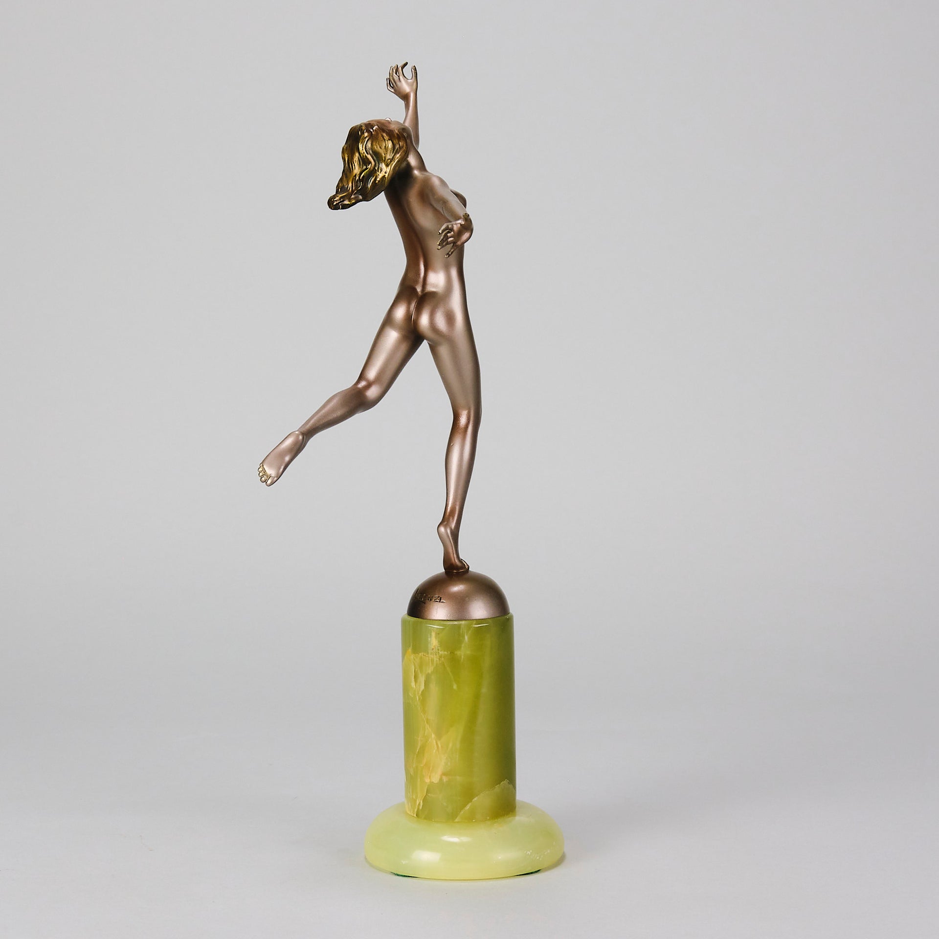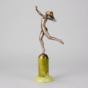 A lively early 20th Century Art Deco cold painted bronze figure of a flamboyant beauty in a a running pose with fabulous colour and fine hand finished detail, raised on a shaped onyx plinth and signed Lorenzl