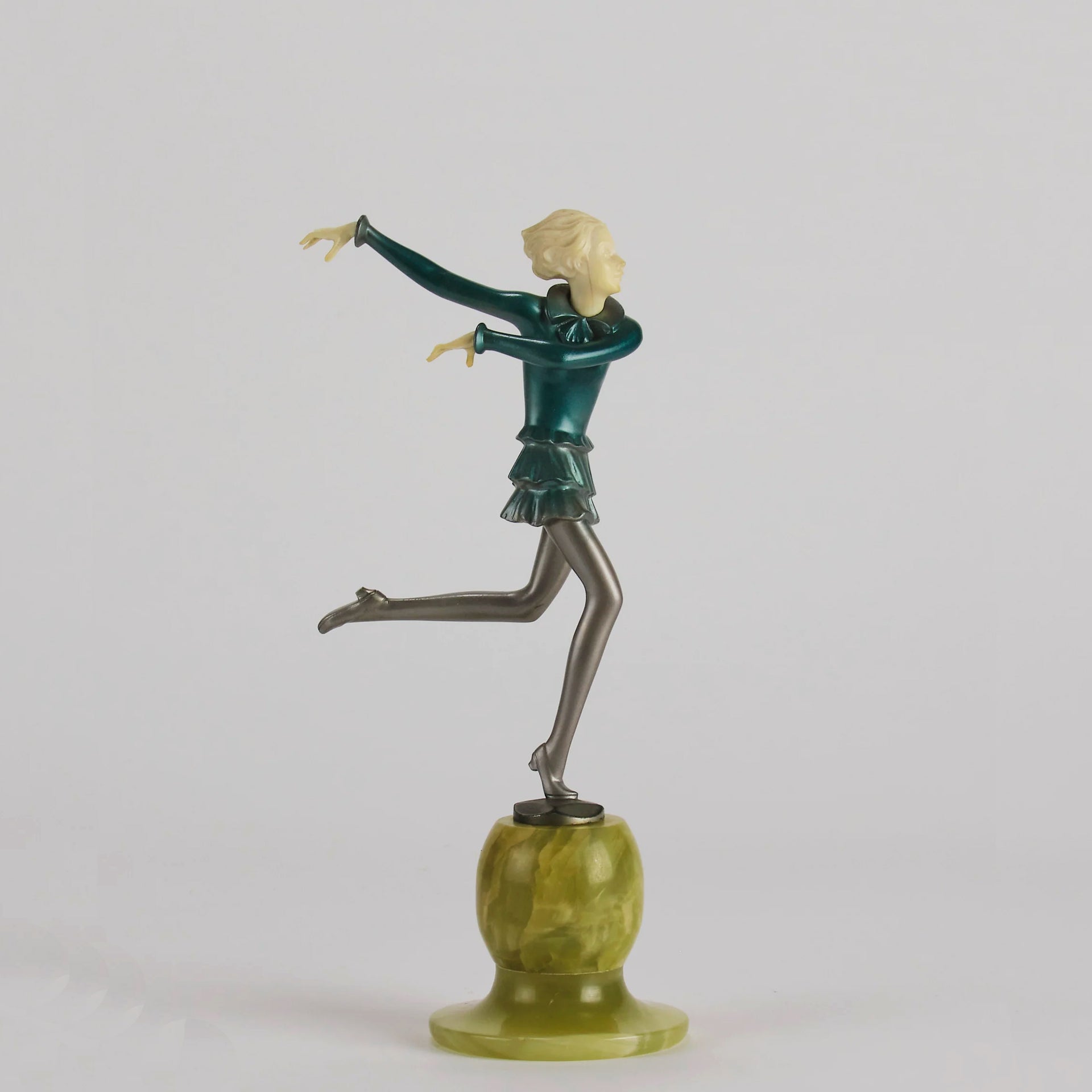 From his designs in bronze and ivory Lorenzl went on to work for the Austrian ceramics company Goldscheider. Again creating stunning sculptures of the female form collector’s are more aware of this period and his sculptures in ceramic than they are of his earlier bronze and ivory statuettes. Inspired by shape and bold colours Lorenzl’s sculptures had clean lines and geometric shapes. Although each piece possess great movement there was no intricacy or attention to detail and most of his figures wore their hair in the boyish bob which was fashionable at the time, making these simplistic and stylish figurines the epitome of Art Deco Bronze design.