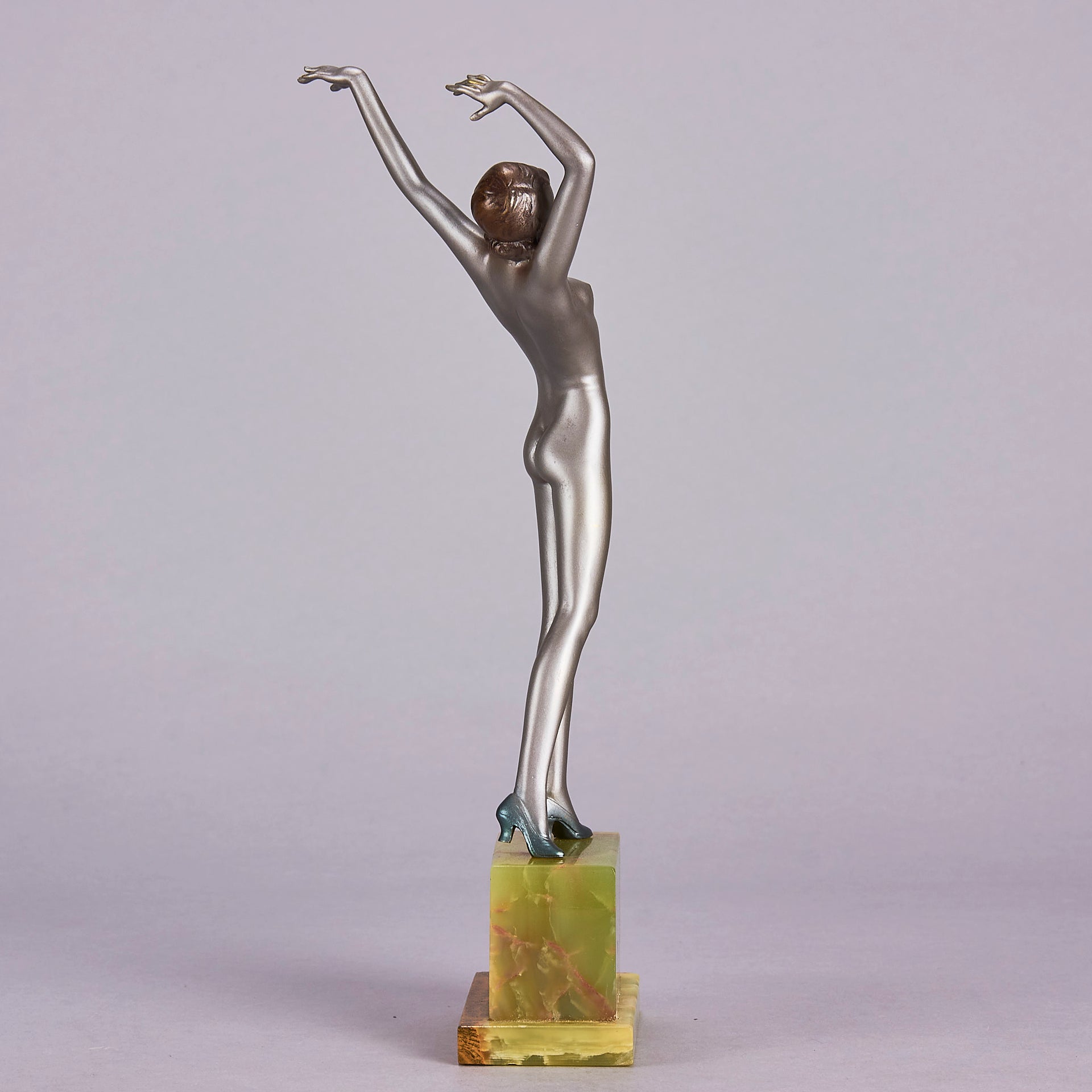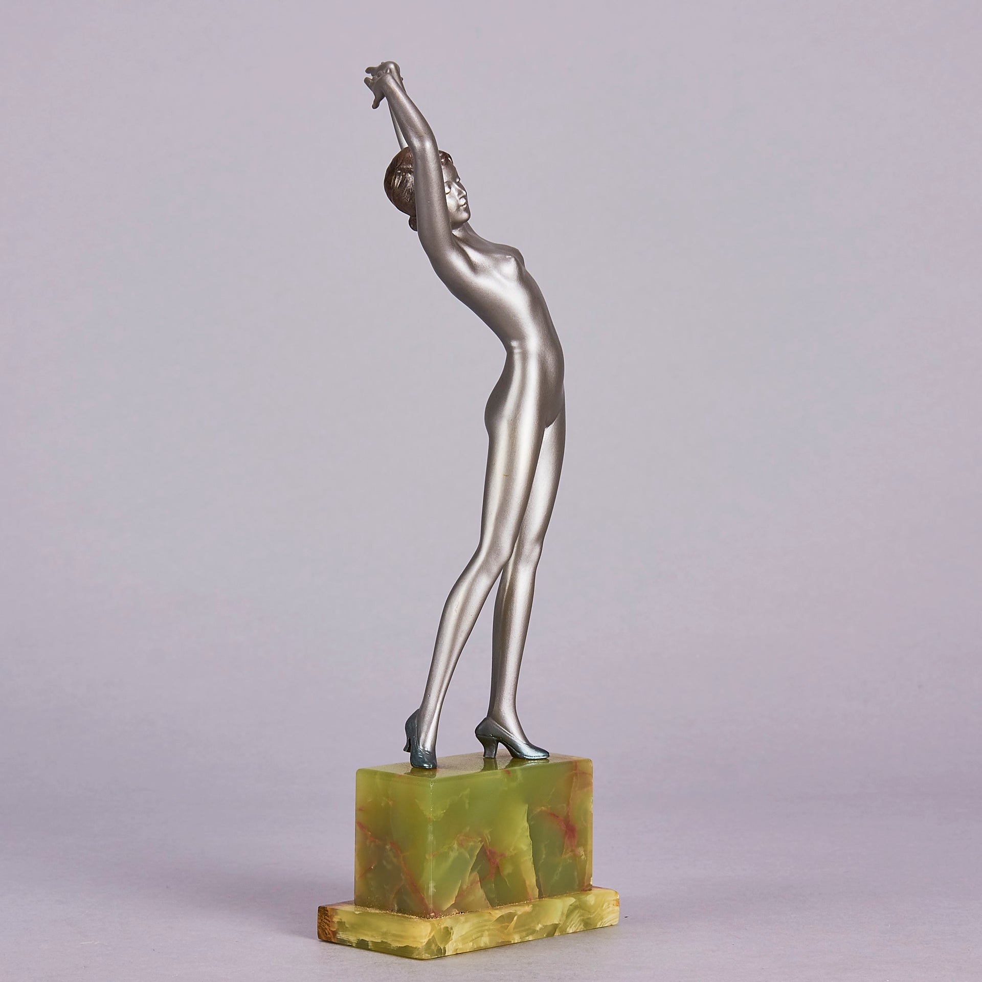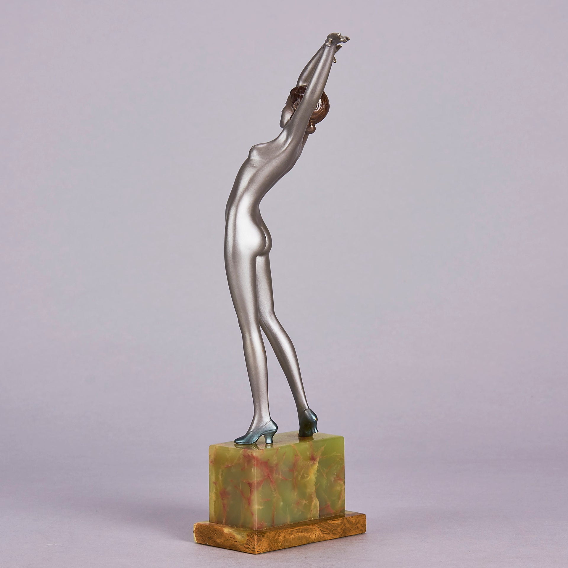 Striking early 20th Century Austrian Art Deco cold painted silver and enamel bronze figure of a young woman in stretched pose with her arms above her wearing only a pair of high heels . The surface of the bronze with excellent colour and very fine hand finished detail, raised on a shaped green onyx base and signed R Lor to side of shoe