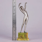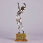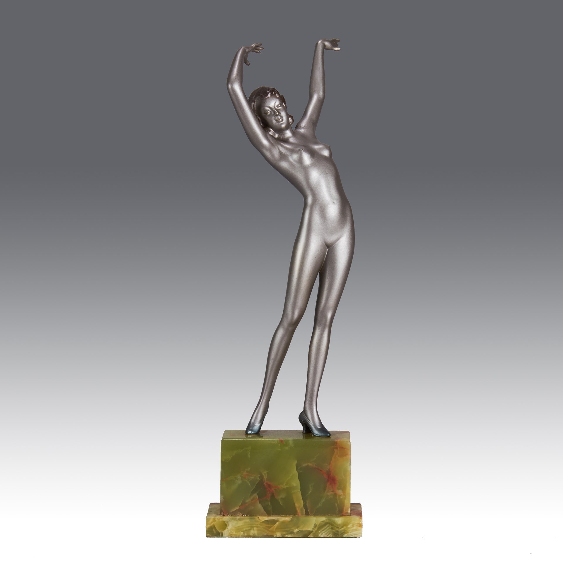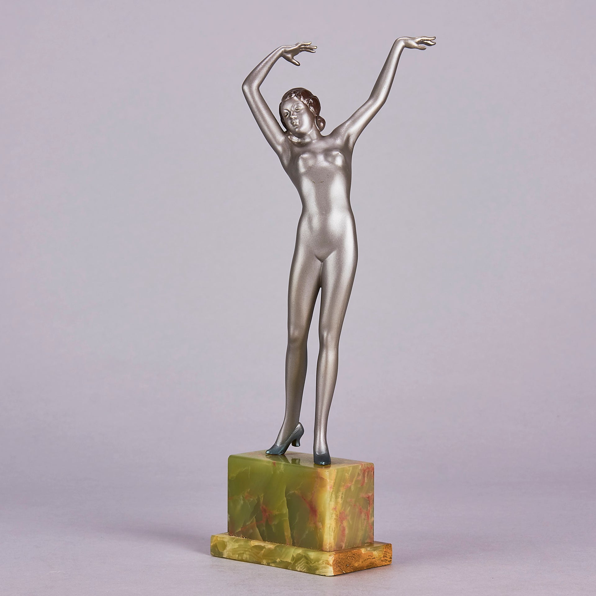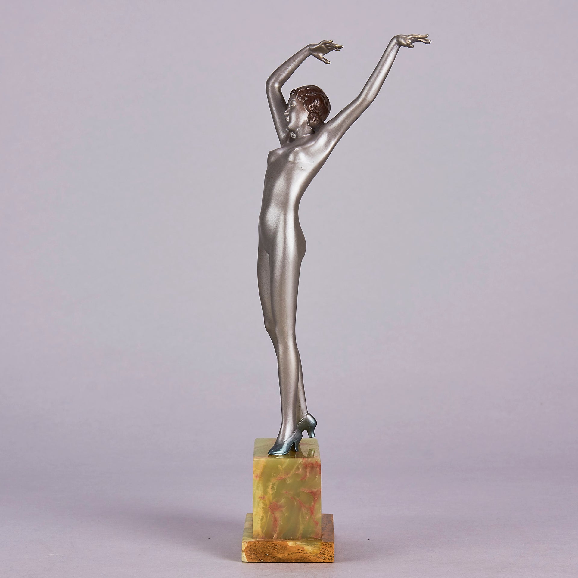 Striking early 20th Century Austrian Art Deco cold painted silver and enamel bronze figure of a young woman in stretched pose with her arms above her wearing only a pair of high heels . The surface of the bronze with excellent colour and very fine hand finished detail, raised on a shaped green onyx base and signed R Lor to side of shoe