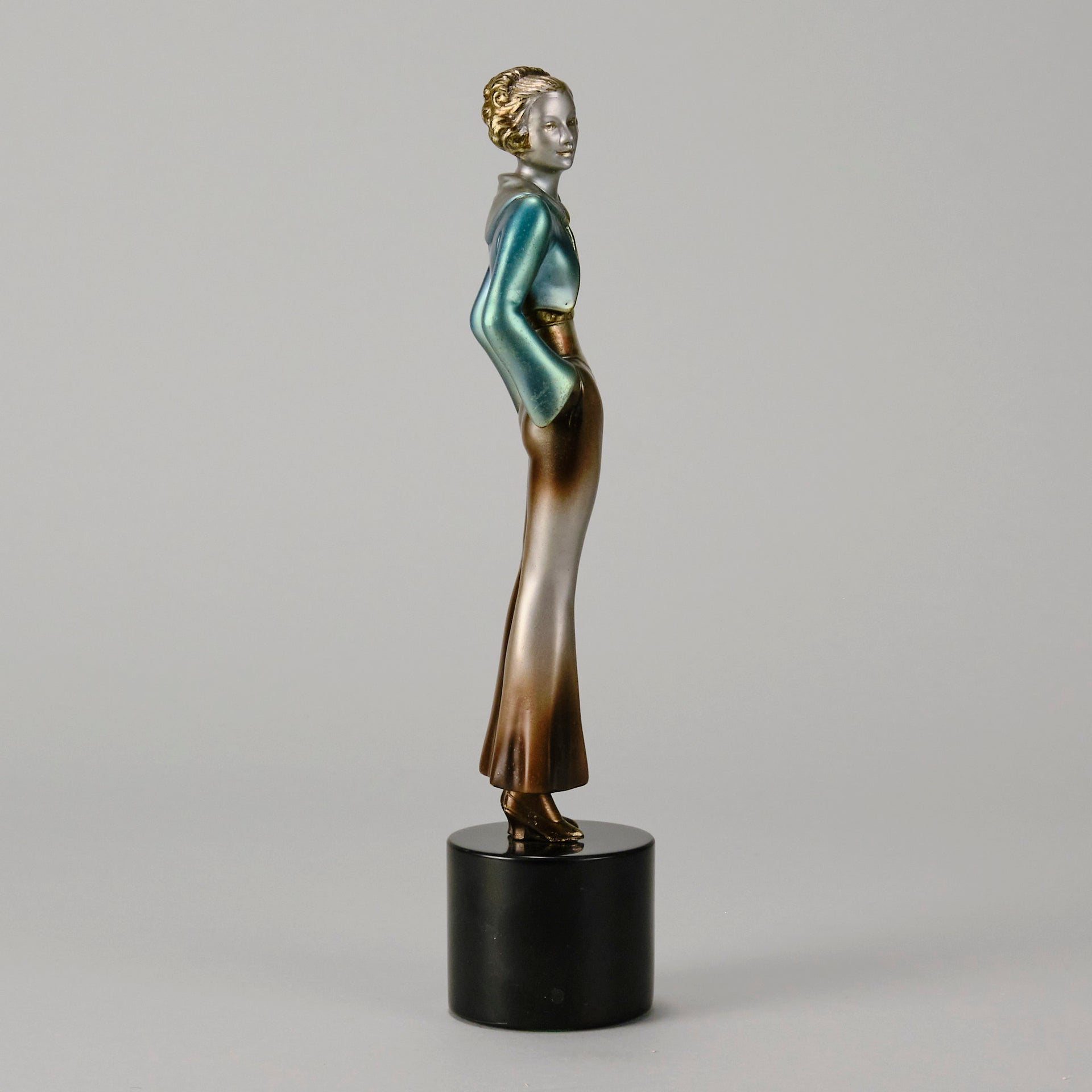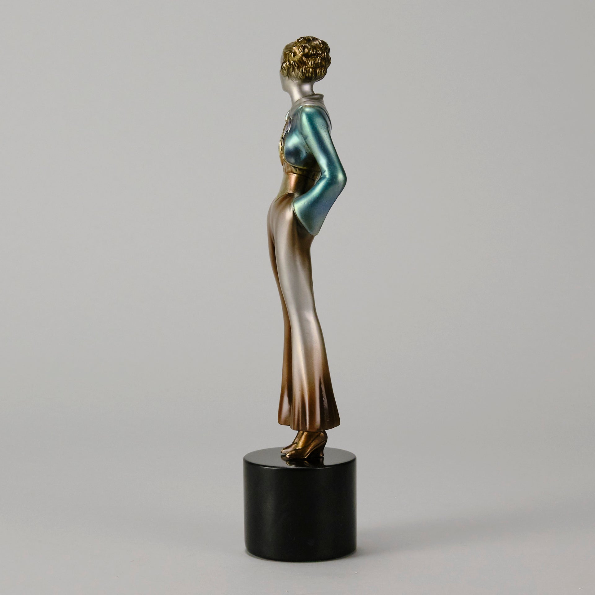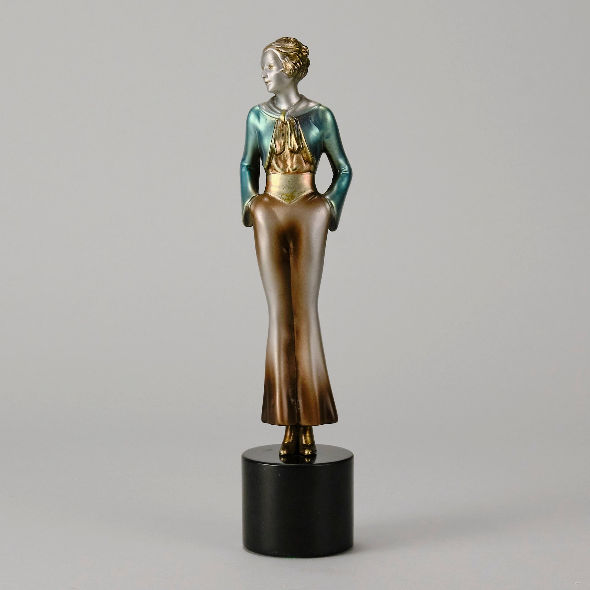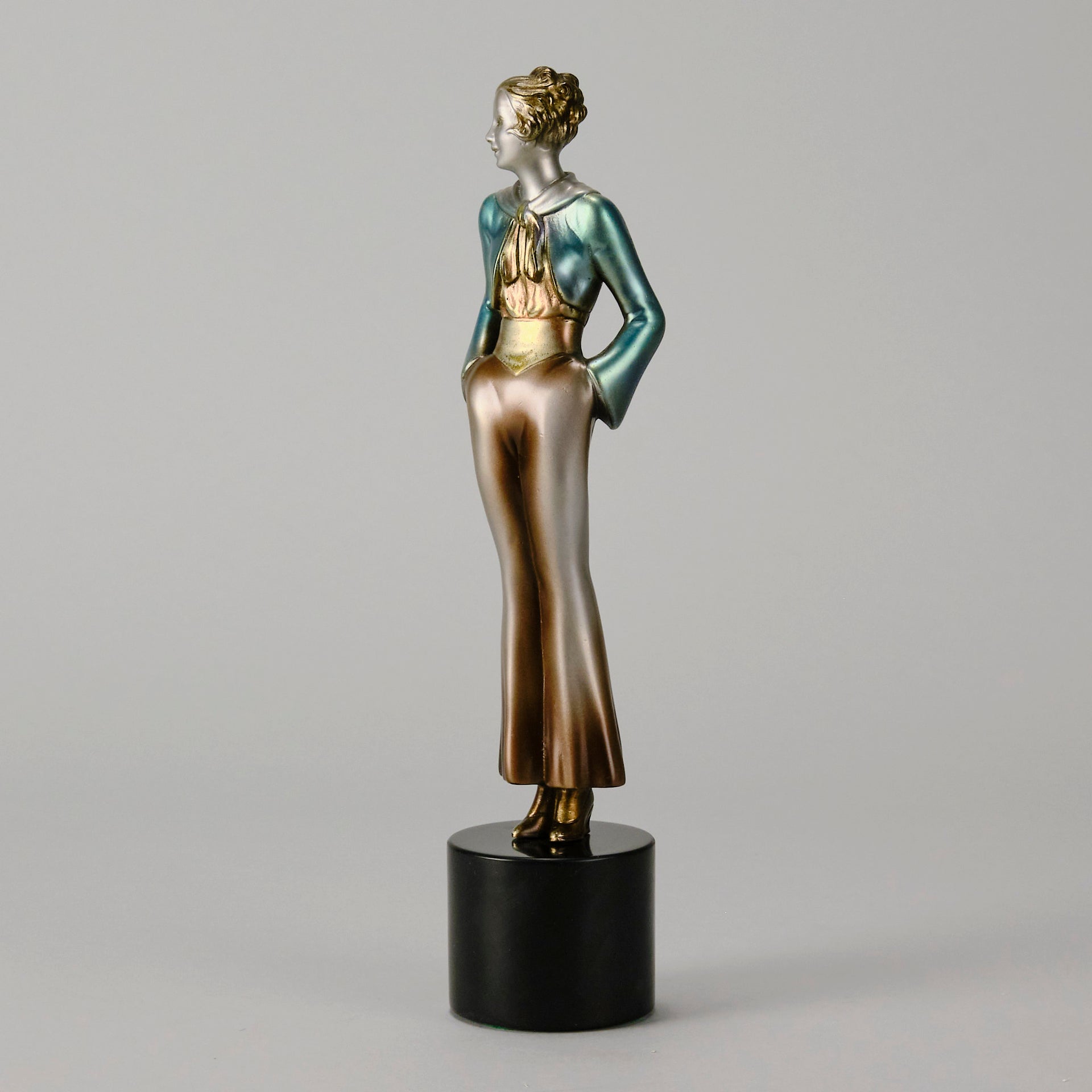 A fabulous early 20th Century Art Deco cold painted bronze figure of a fashionable beauty dressed in a classy trouser suit holding her hands in her pockets with excellent colours and fine hand finished detail, raised on a black mabrle plinth and signed Lorenzl