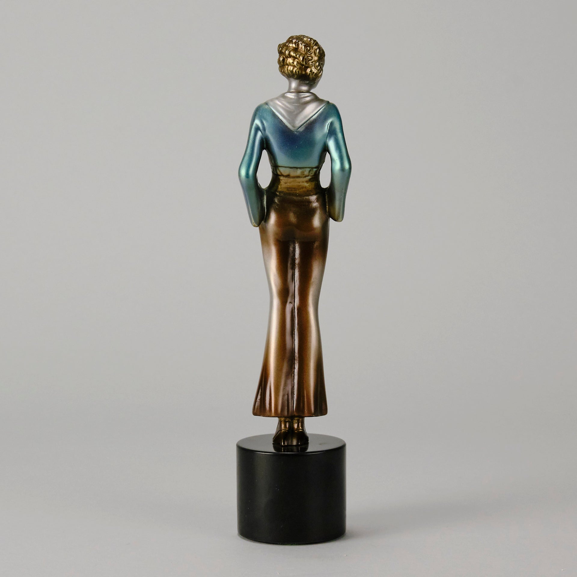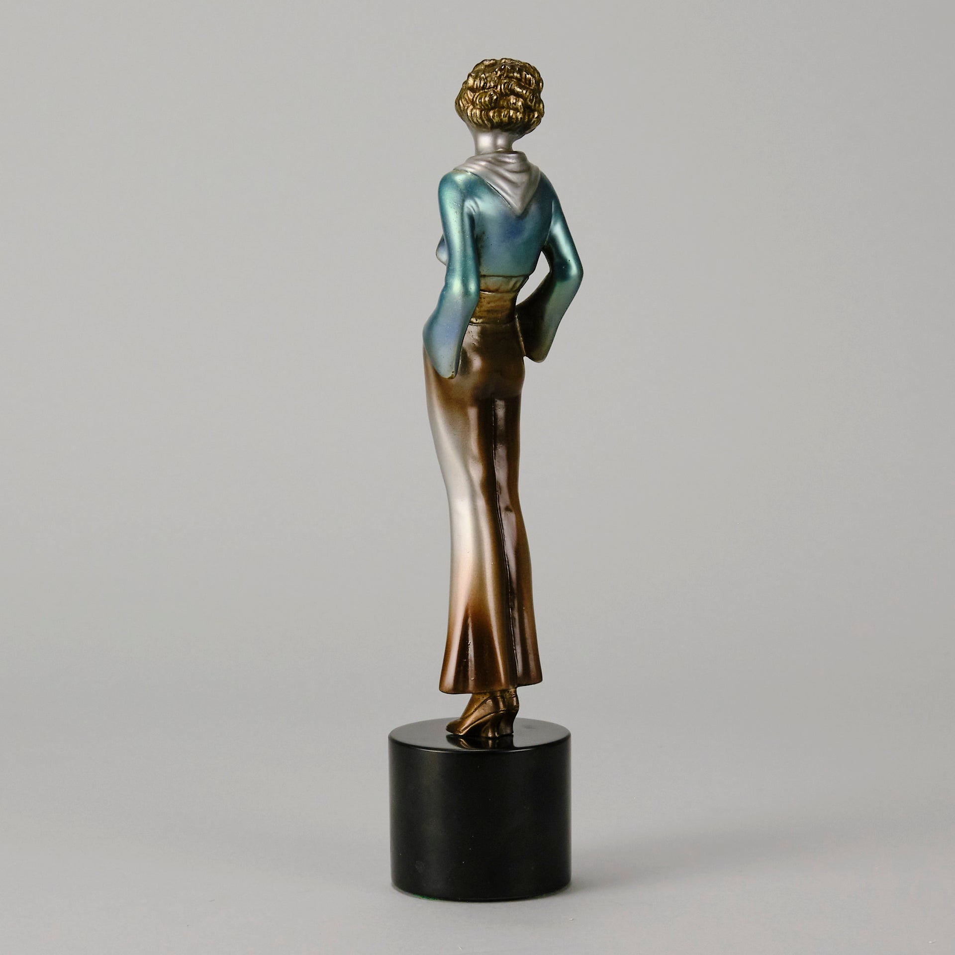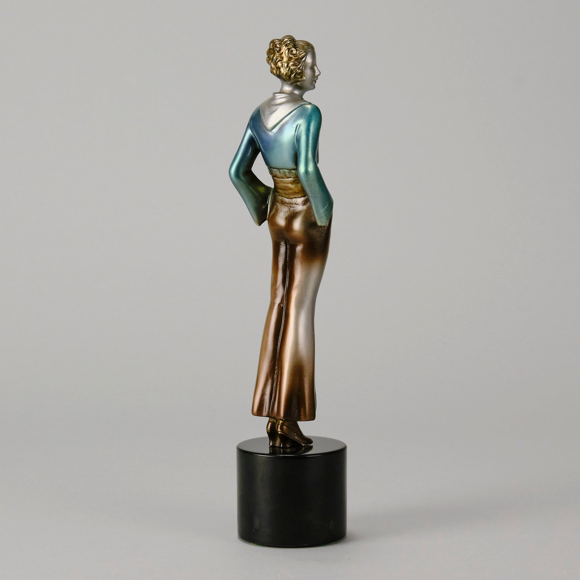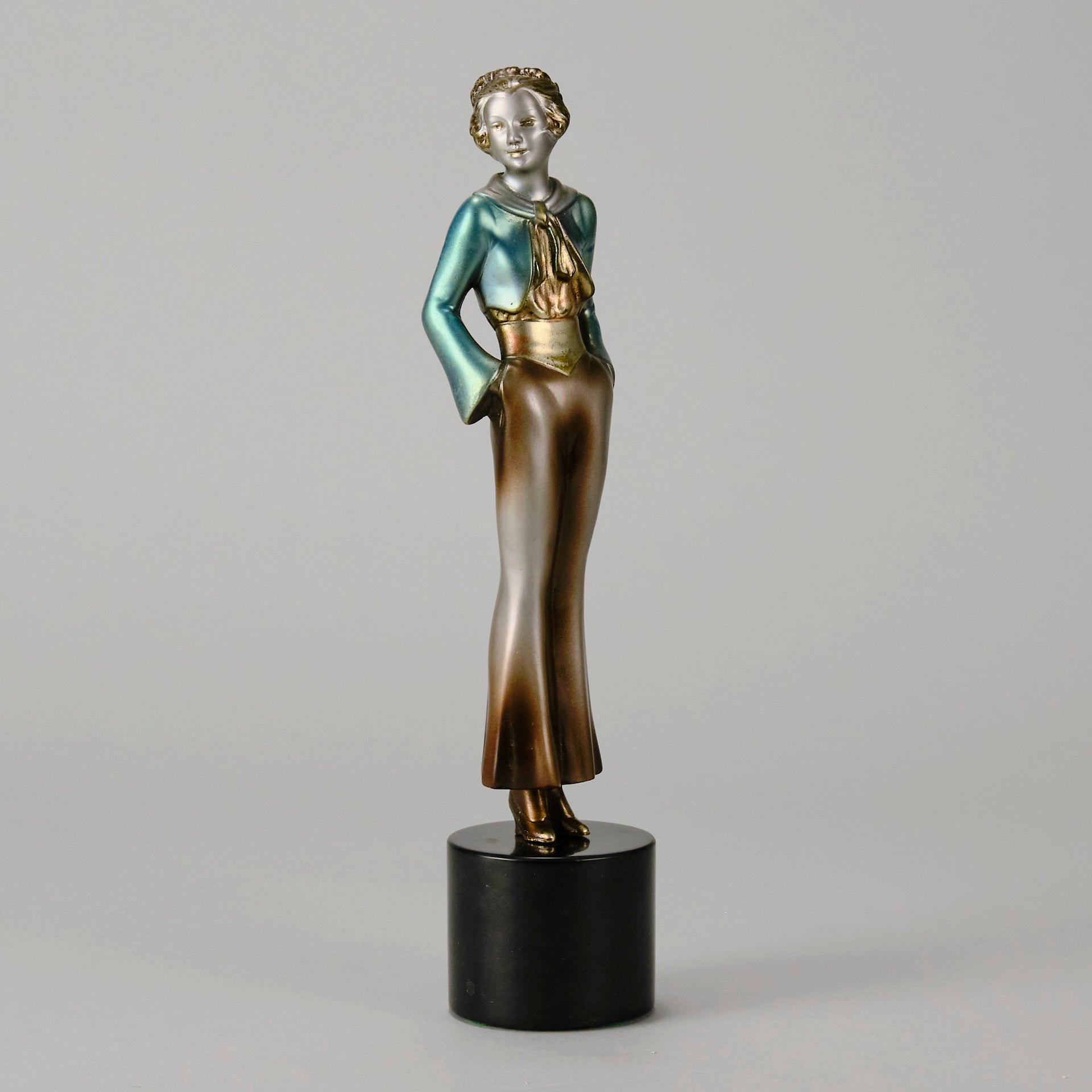 A fabulous early 20th Century Art Deco cold painted bronze figure of a fashionable beauty dressed in a classy trouser suit holding her hands in her pockets with excellent colours and fine hand finished detail, raised on a black mabrle plinth and signed Lorenzl
