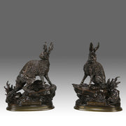 A fabulous pair of mid 19th Century French bronze Animalier sculptures of an alert male in 'Hunting Season Open' and a female hare with her young in 'Hunting Season Closed' both standing on naturalistic rocky outcrops; with very fine rich brown patination and exceptional surface detail, signed J Moigniez and titled to fore.