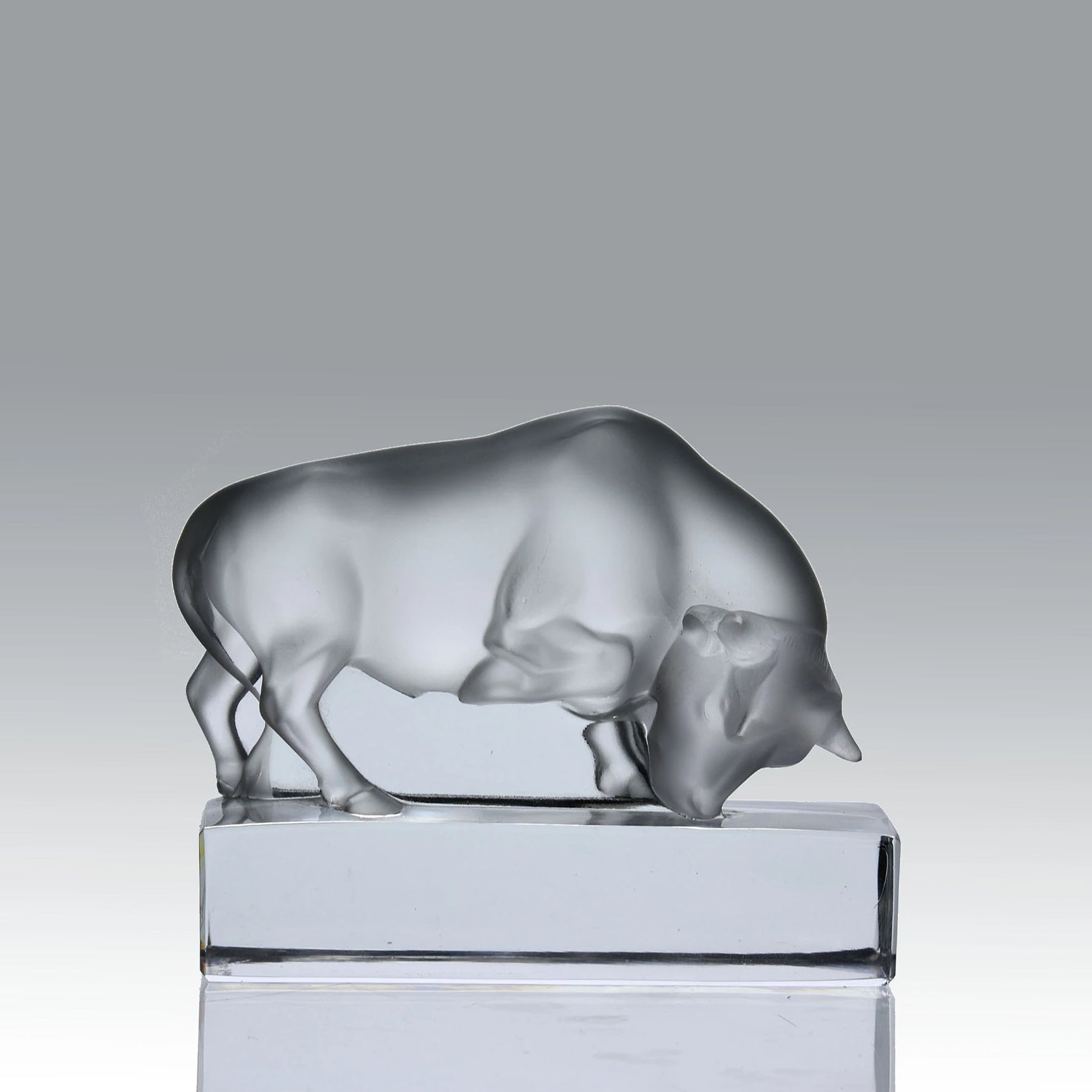 An excellent clear and frosted glass paperweight in the form of a bull with head lowered and foreleg leg raised, exhibiting very fine smooth surface with good detail, raised on a clear glass plinth and signed Lalique France