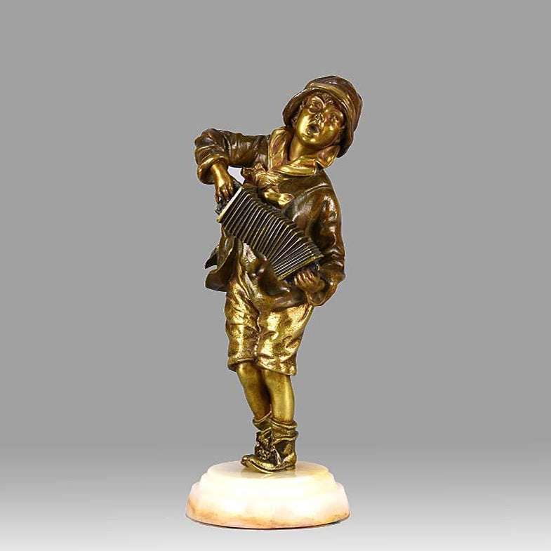 A delightful early 20th Century gilt and enamelled Art Deco bronze figure of a young lad playing the accordion, with wonderful detail and colour, raised on a variegated onyx plinth, signed Chiparus on back of bronze.