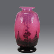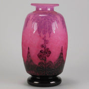 A striking early 20th Century Art Deco glass vase etched with rich burgundy Art Deco motifs against a vibrant pink background with excellent colour and detail. The base rim signed Le Verre Français