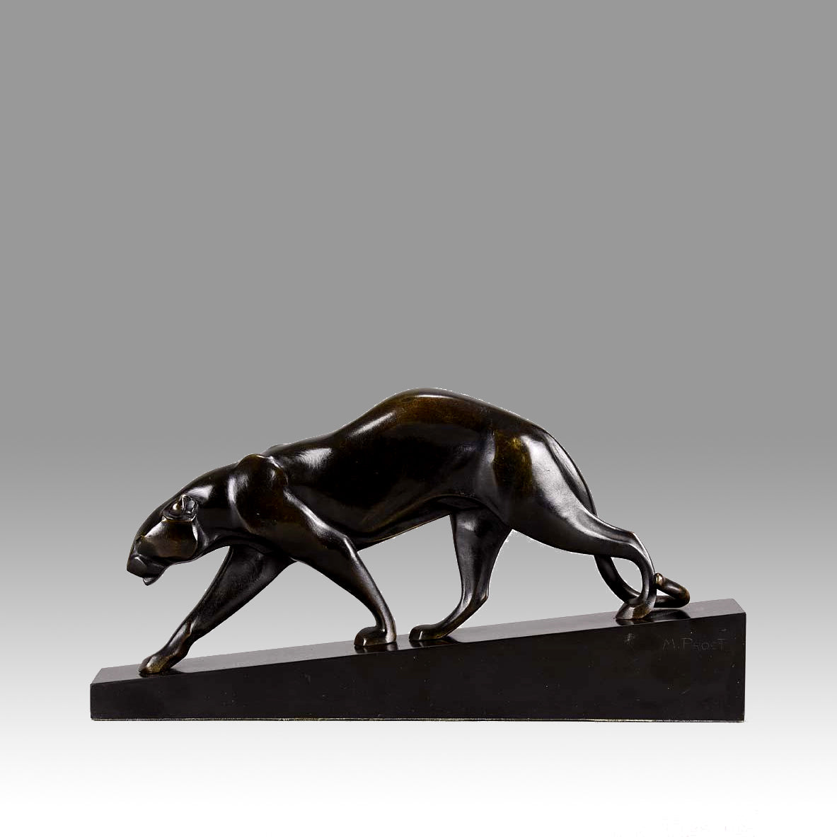 A wonderful animalier bronze study of a panther walking down a slope with deep black patina and smooth surface detail in an elegant Art Deco style, raised on a wedge shaped black marble base, signed M Prost and inscribed with foundry mark Susse Frères Editeurs Paris