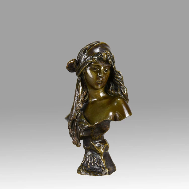 Attractive late 19th Century French Art Nouveau bronze bust of a young beauty wearing a head scarf decorated with medallions, exhibiting good hand finished surface detail and rich brown and ochre patina, raised on integral base with raised title, signed E Villanis.
