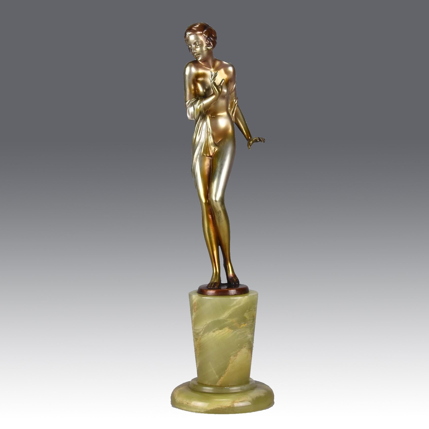 An excellent early 20th Century Austrian Art Deco cold painted silver and enamel bronze figure of a beautiful young woman wrapped in a revealing shawl, with very fine colour and detail, raised on a stepped conical green onyx base, signed R Lor for Lorenzl