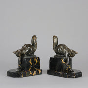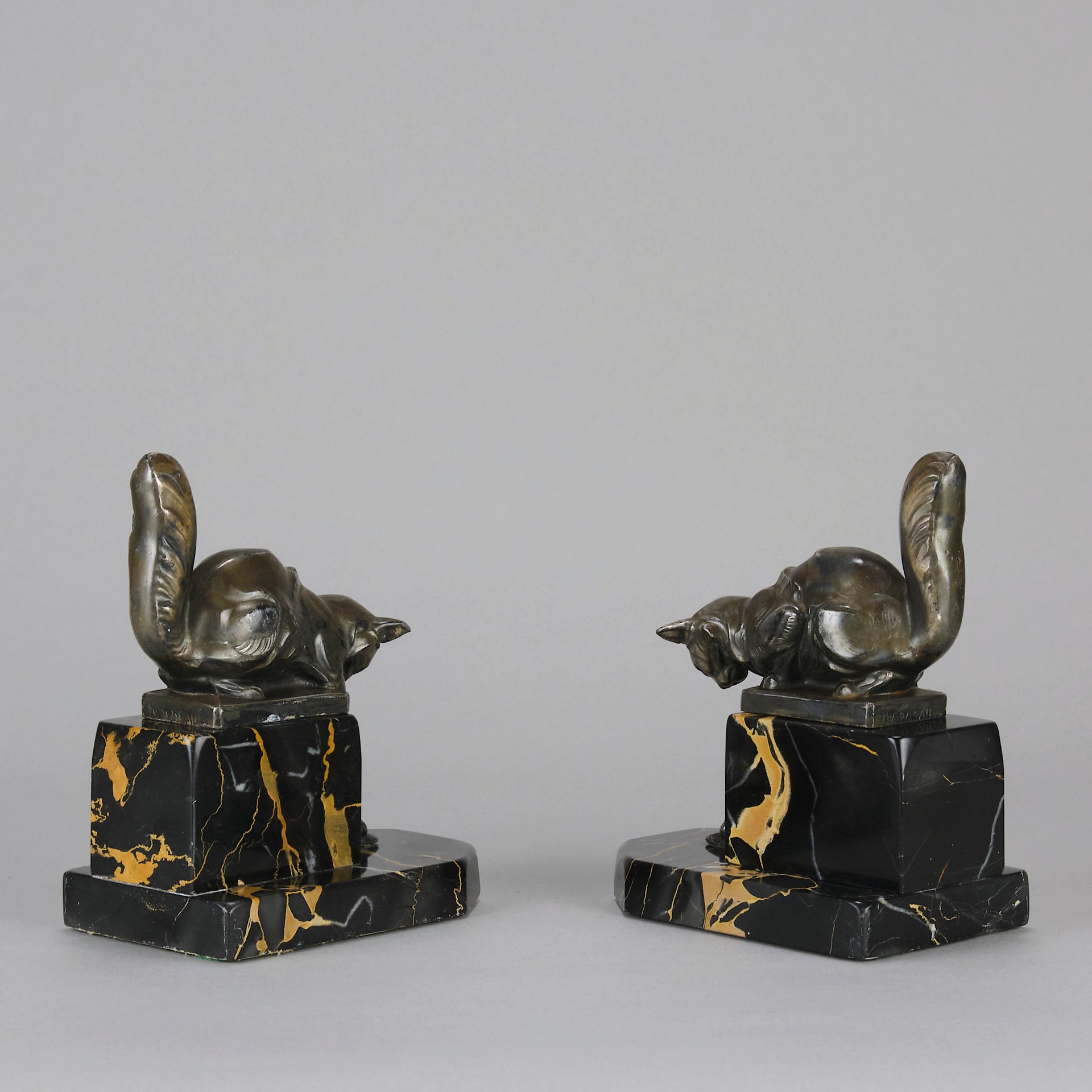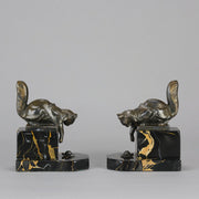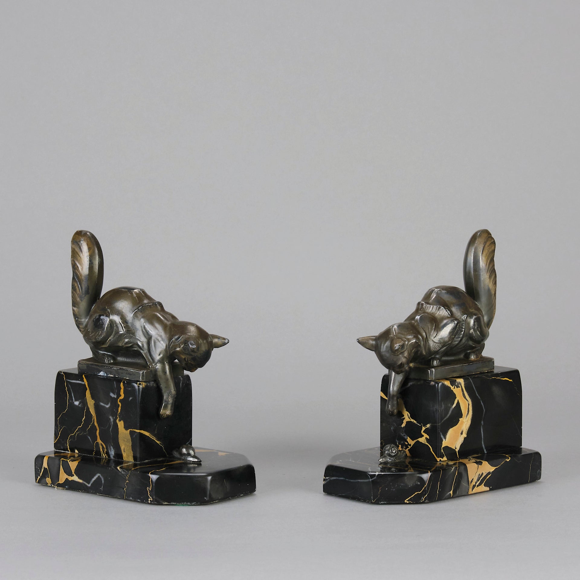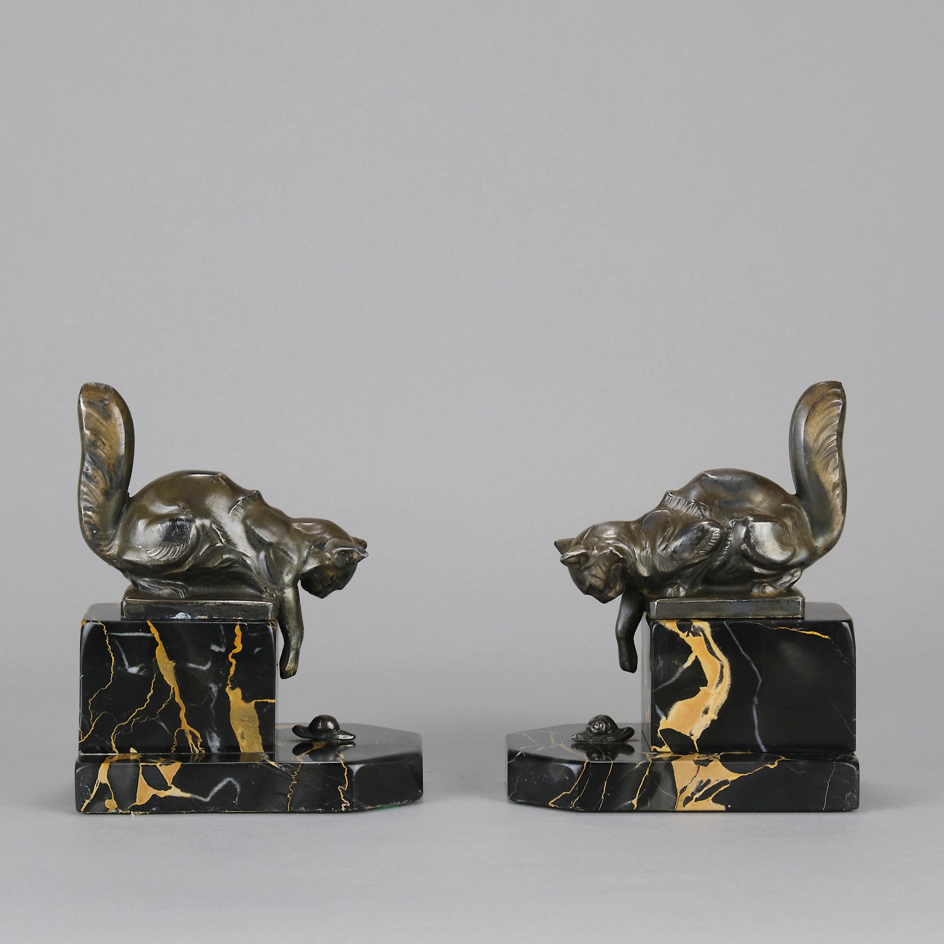 A charming early 19th Century pair of bookends modelled as cats reaching down to snails exhibiting excellent detail, raised on a potoro marble bases and signed Hip Moreau