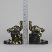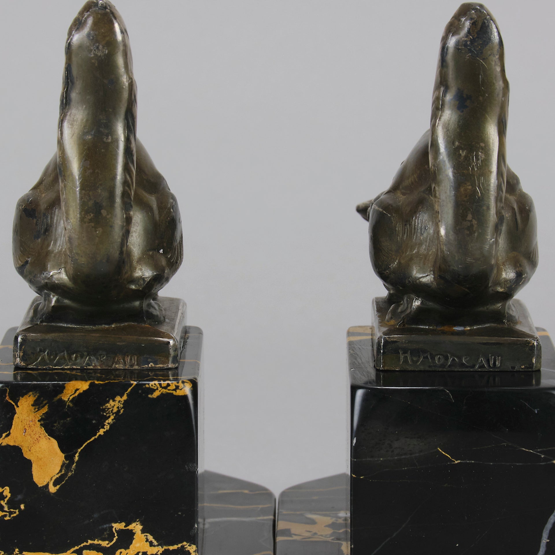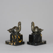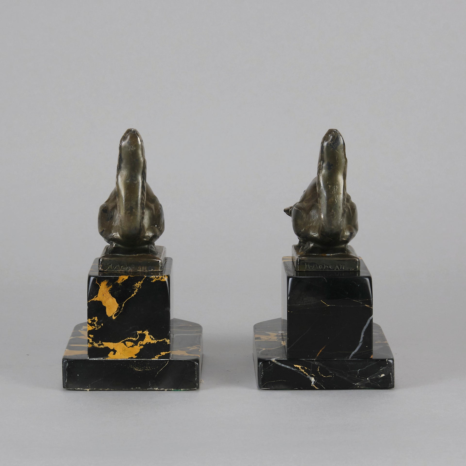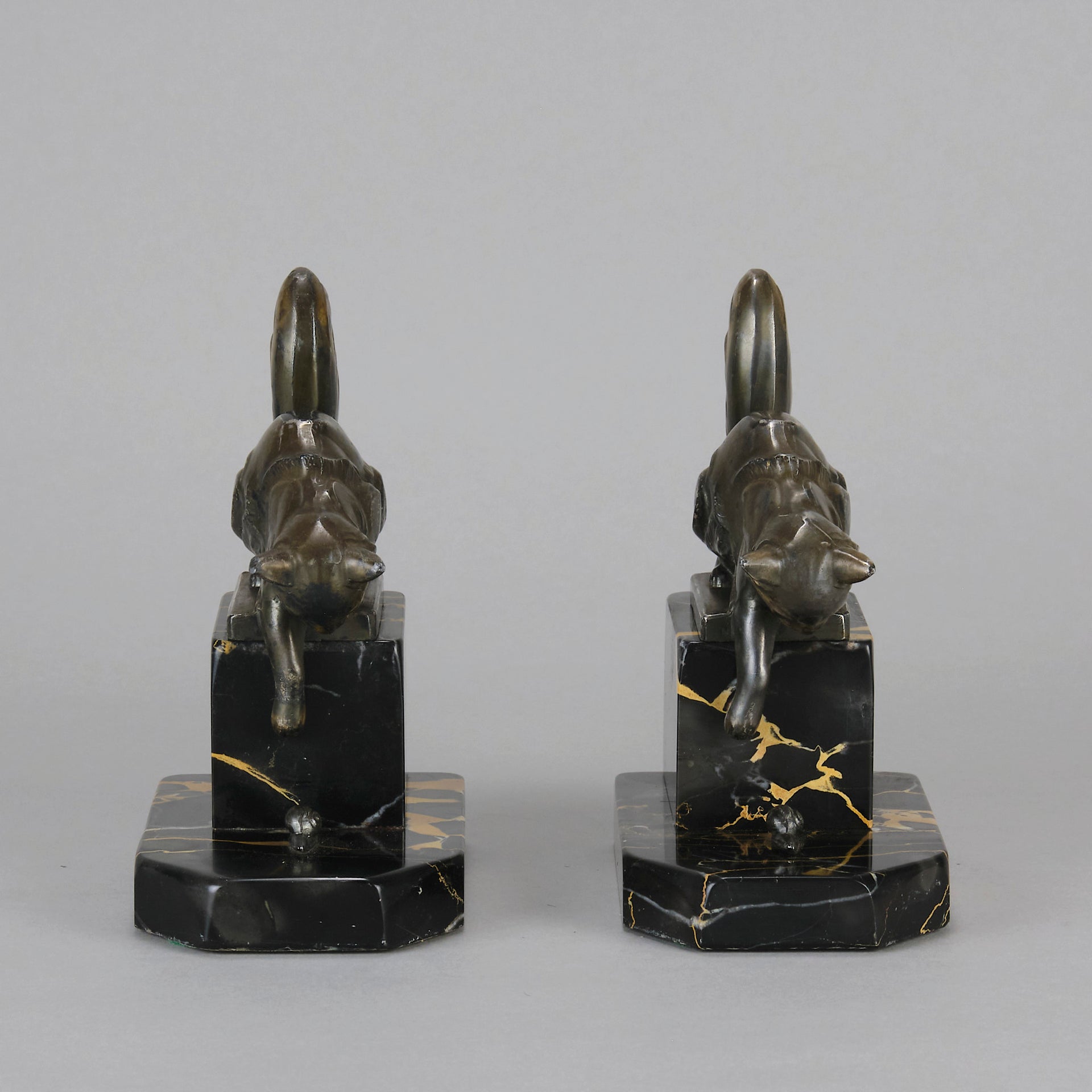 A charming early 19th Century pair of bookends modelled as cats reaching down to snails exhibiting excellent detail, raised on a potoro marble bases and signed Hip Moreau