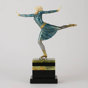 A spectacular early 20th Century Art Deco bronze and ivory figure of a young woman gliding on her ice skates. The figure has cold painted deep metallic blue bronze dress, completed with hand carved ivory head and hands. Raised on a shaped green onyx and black marble base and signed F Preiss