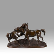 A wonderful mid 19th Century Animalier bronze cast from the artist’s own workshop, this is a rare bronze study of an Arab Stallion and Mare. Originally entitled “Tachiani et Nedjibe, Arab horses” the composition captures the individual characteristics superbly, the spirited stallion and the typically ‘tetchy’ mare. An excellent example with wonderful rich brown patination and intricate surface detail. Raised on naturalistic base and signed P J Mêne.