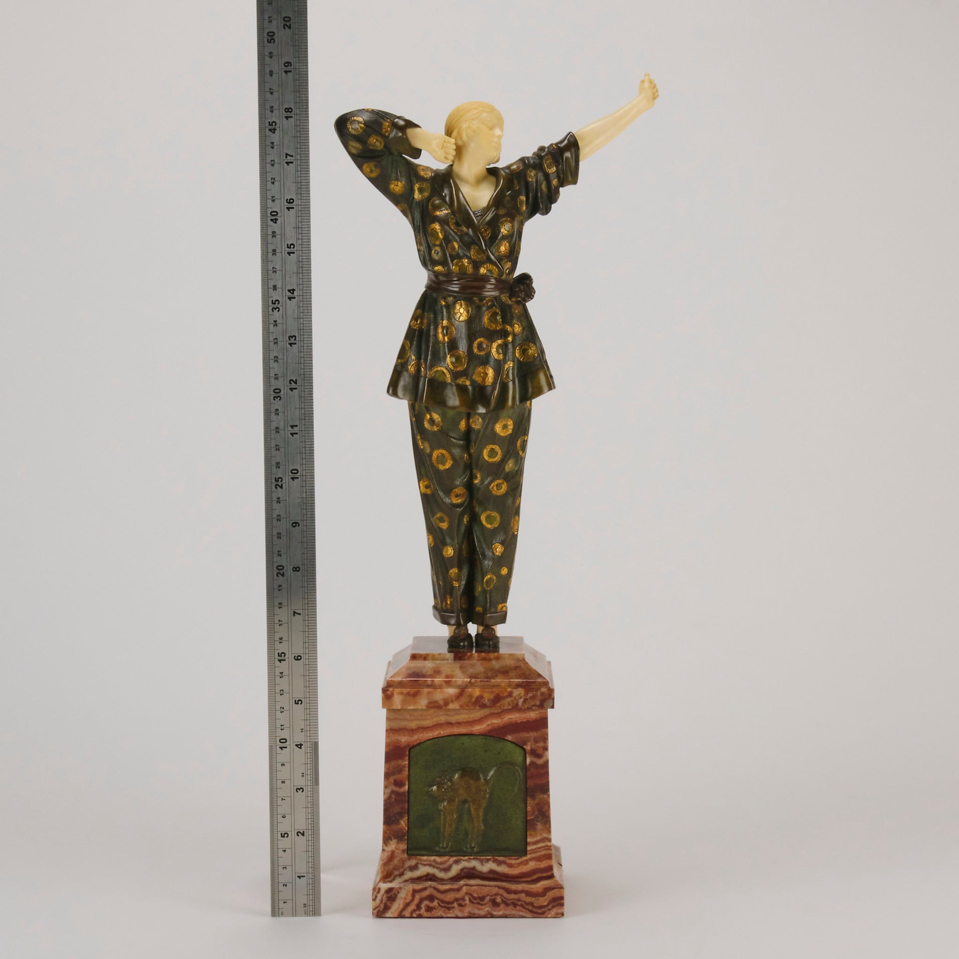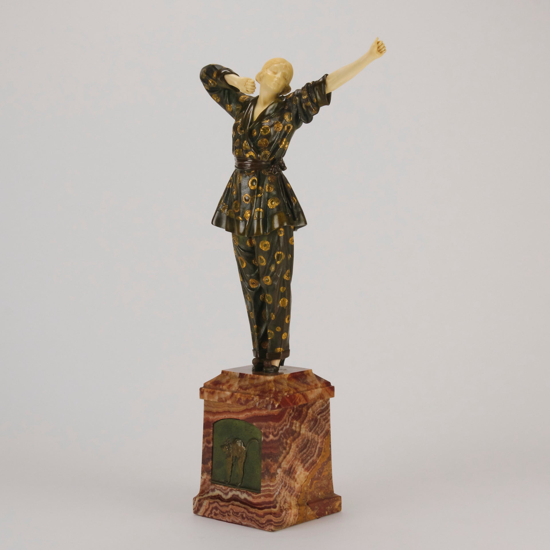 A fabulous early 20th Century Art Deco cold painted gilt and enamel bronze with ivory head and arms of a young woman wearing her pyjamas and stretching with one arm outstretched. Raised on a shaped marble base with frontis plaque decorated with raised figure of a stretching cat, Signed D H Chiparus