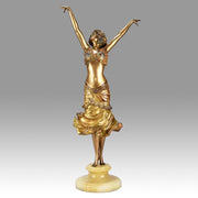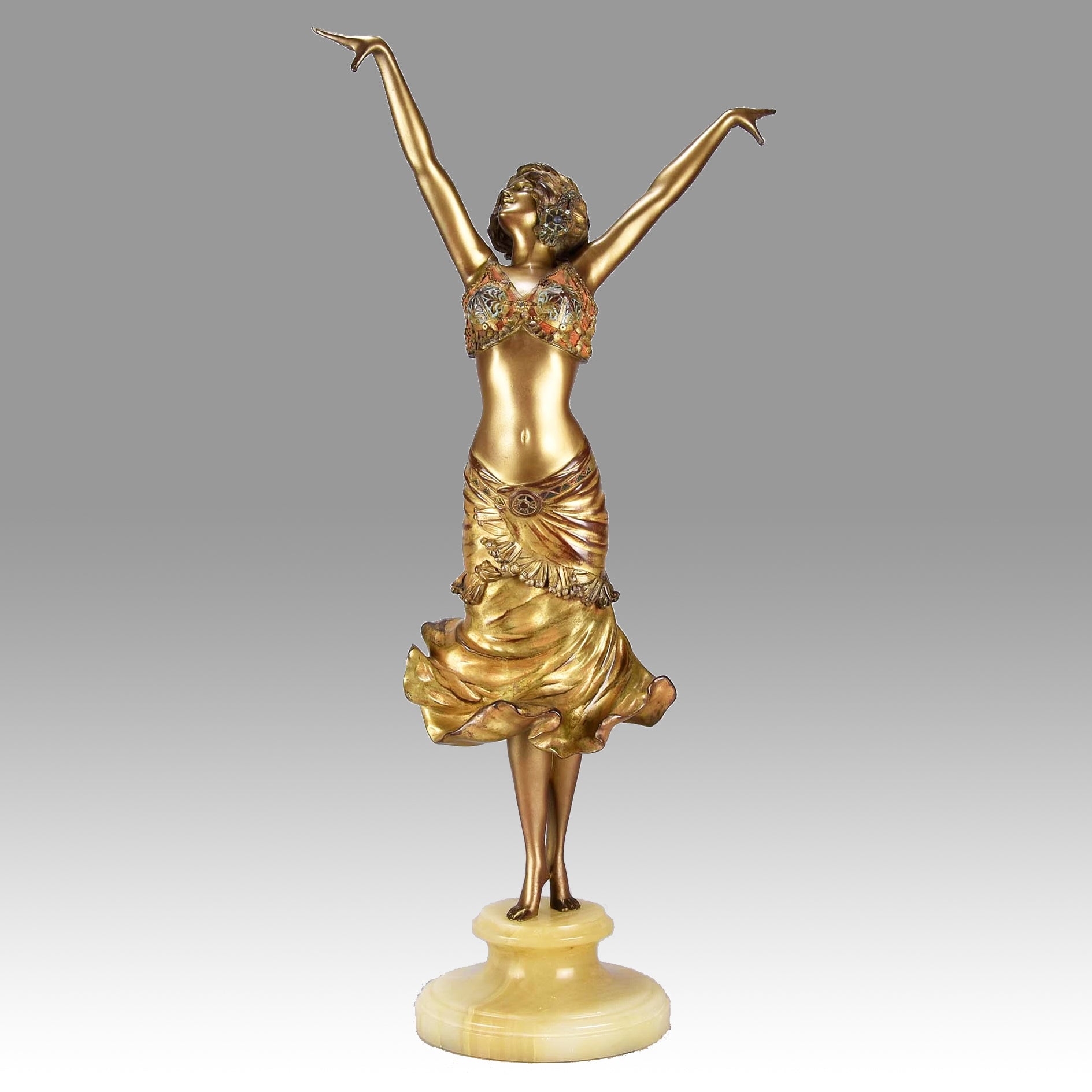 An extremely fine French early 20th Century Art Deco bronze figure of a young attractive woman in a two piece costume poised on her tip toes with both hands raised above her head, the costume with rich red, gold and silver cold painted enamel highlights raised on shaped variegated onyx base signed Philippe.