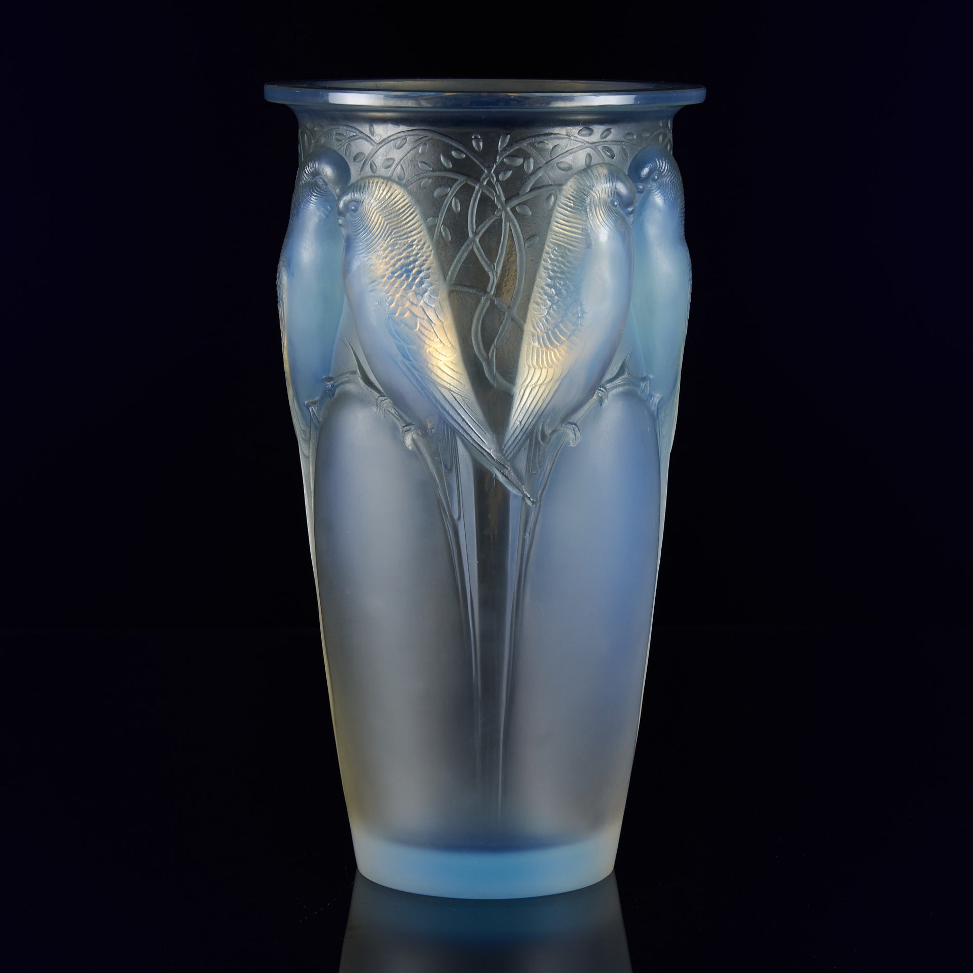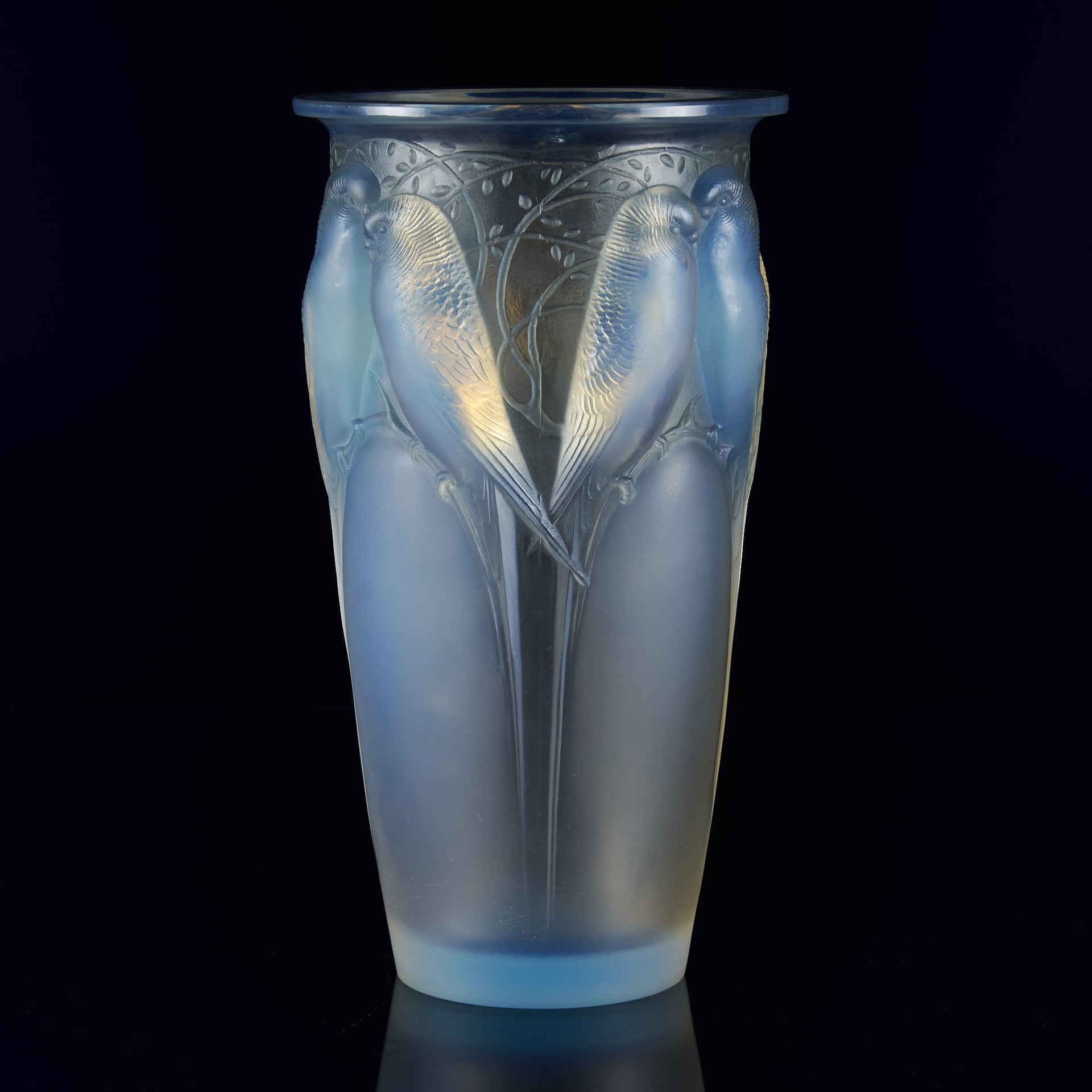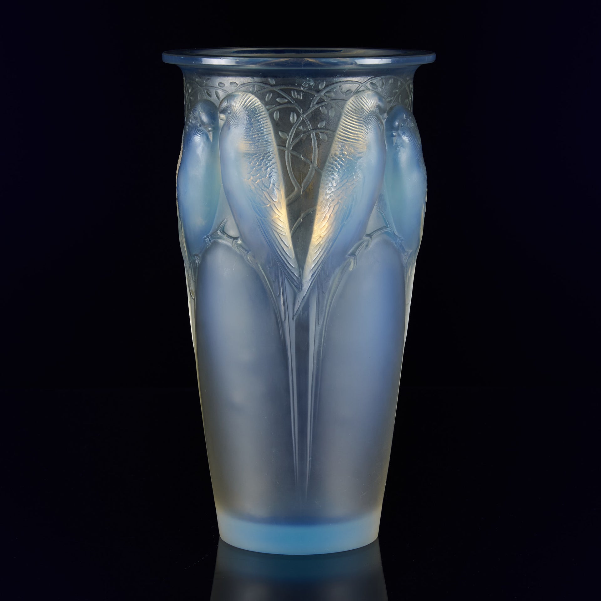 A beautiful early 20th Century French Art Deco opalescent glass vase, with decorative raised figures of birds amongst branches heightened with noticeable original blue staining. The attractive design, quality and colour make this vase much sought after by the discerning collector, signed R Lalique