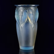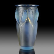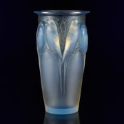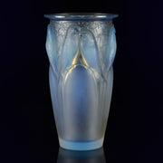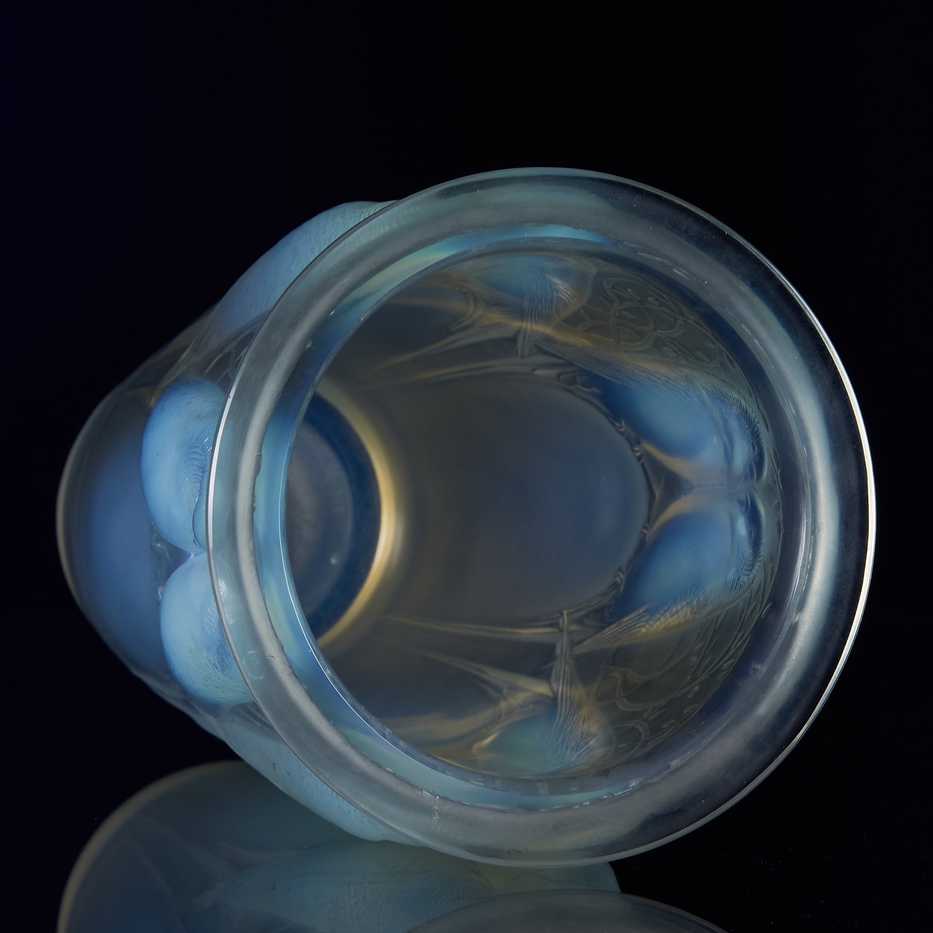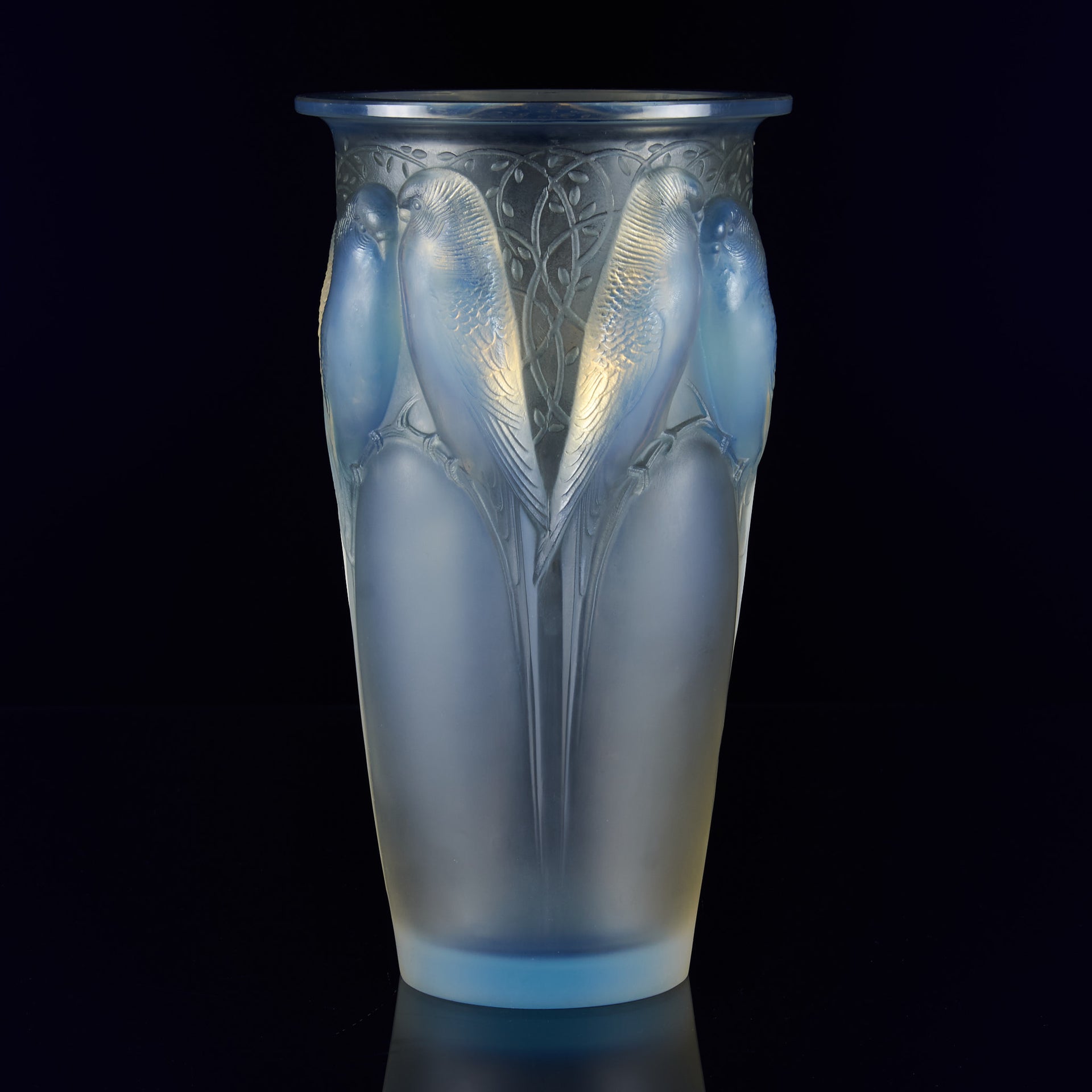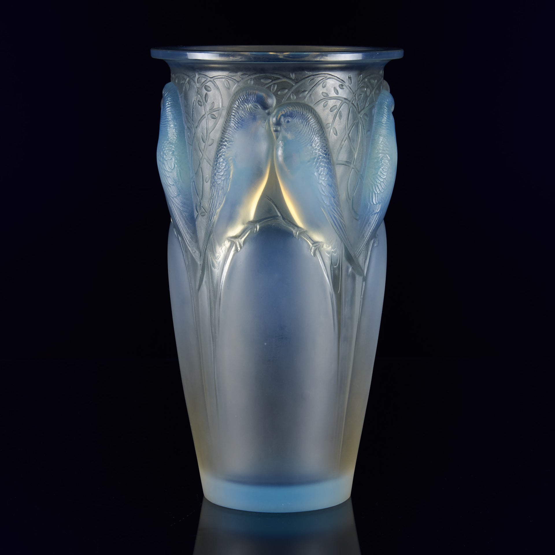 A beautiful early 20th Century French Art Deco opalescent glass vase, with decorative raised figures of birds amongst branches heightened with noticeable original blue staining. The attractive design, quality and colour make this vase much sought after by the discerning collector, signed R Lalique