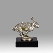 An excellent nickel plated bronze Car Mascot, in the form of a running hare with a fabulous hand chased surface detail and good hand finished detail, signed AEL for the Lejeune Company, raised and fitted on an ebonised wooden plinth