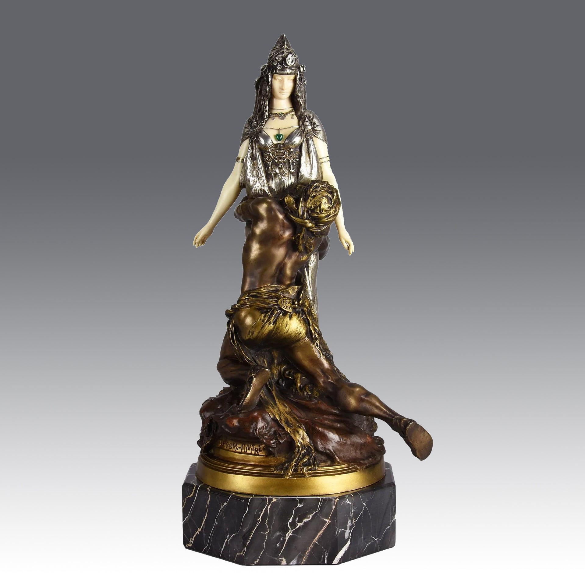 A magnificent bronze and ivory group of the historical beauty Salammbô looking down with hidden passion as her secret lover wraps his arms around her, imploring her attention. The figure of Matho with deep brown patina contrasting dramatically against the hand carved ivory, silver and cold painted enamel colours of his lover. Signed Theodore Riviere, inscribed ‘Carthage’ and further marked with the foundry Susse Frères.