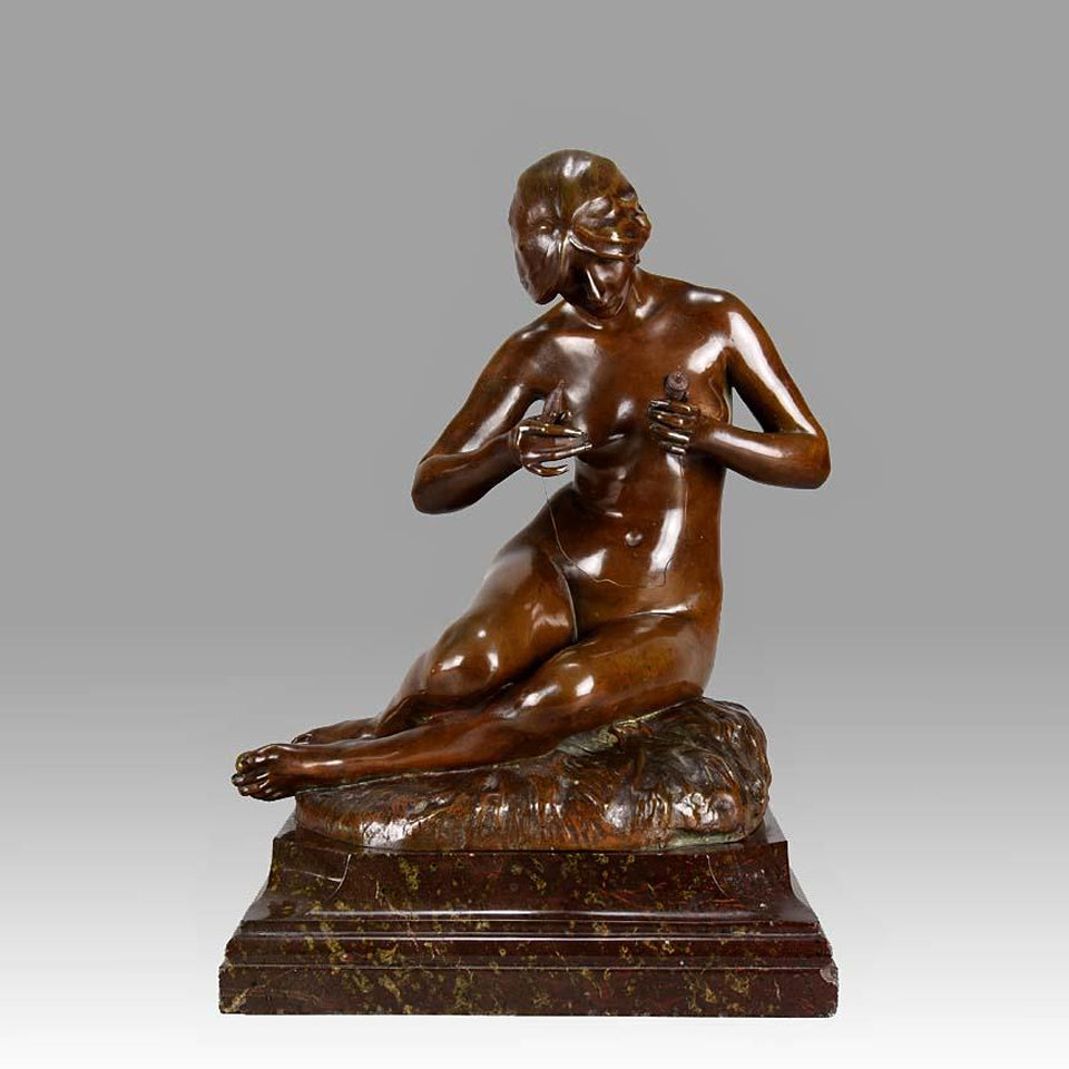 A delightful Art Nouveau early 20th Century bronze figure of a naked woman sat upon a rock spinning wool, exhibiting excellent rich brown patina and fine hand finished detail. Raised on a shaped marble base and signed A Clerget