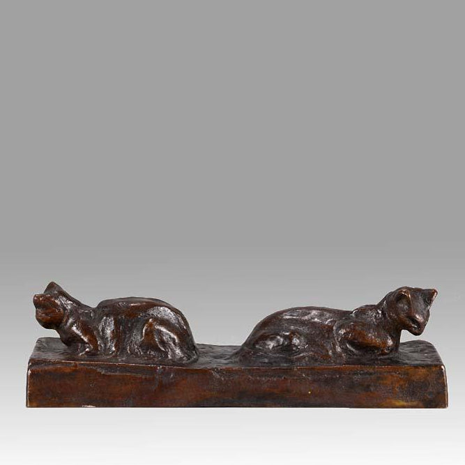 Fascinating Animalier bronze study of two resting cats looking in opposite directions. The bronze with excellent tactile surface detail and fine rich brown patina, signed Steinlen